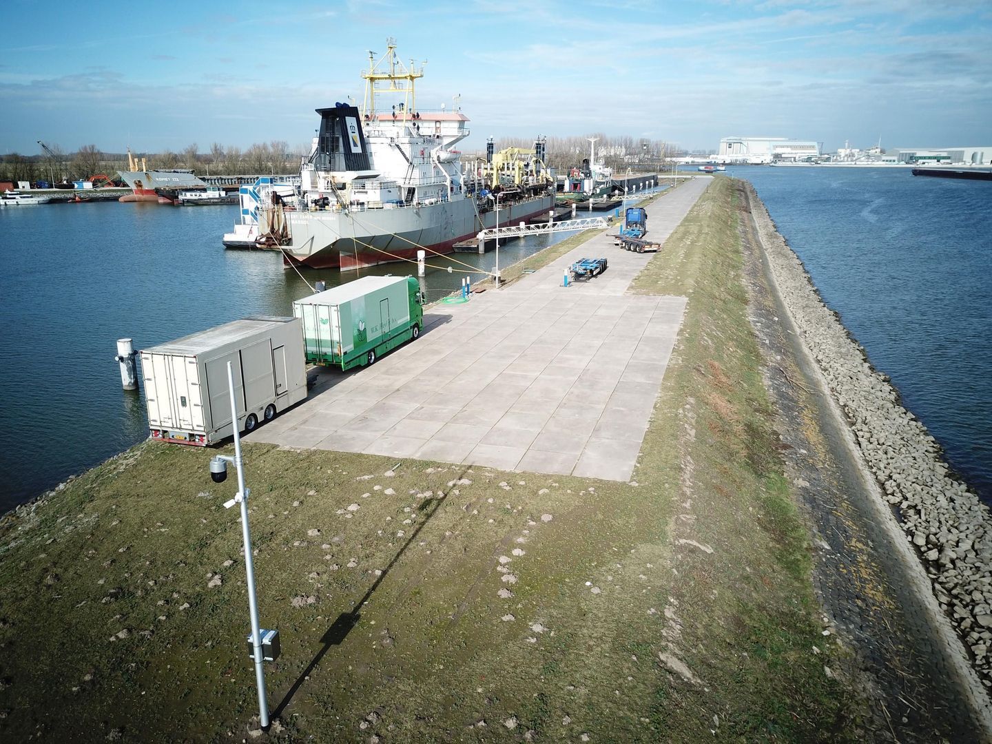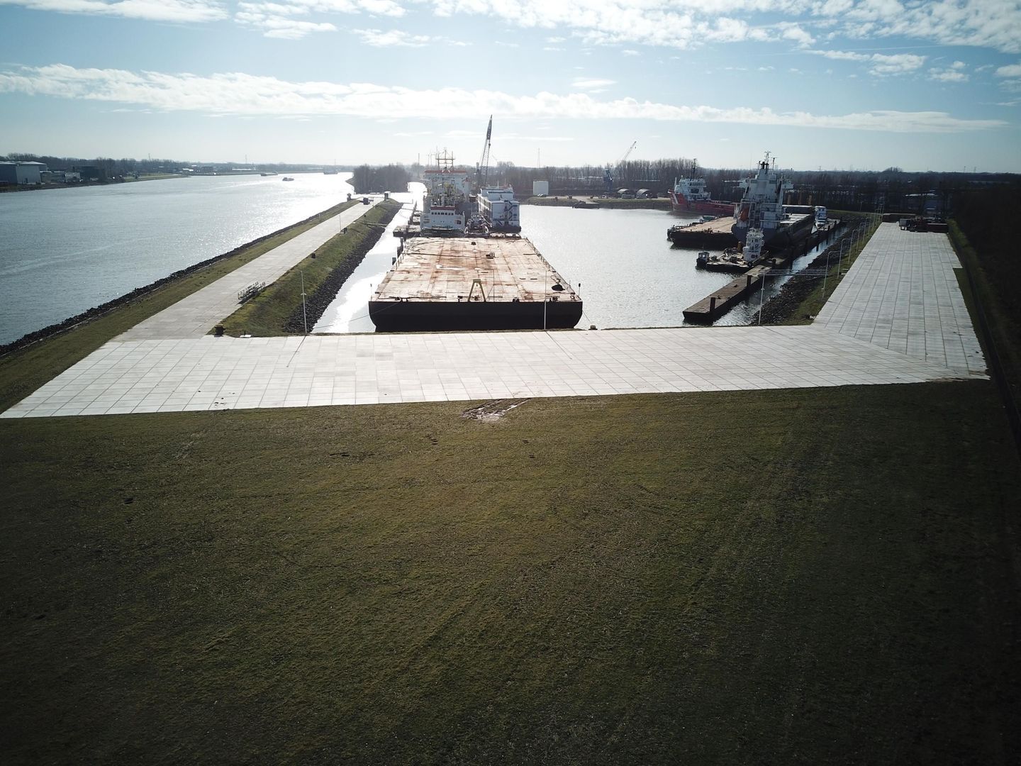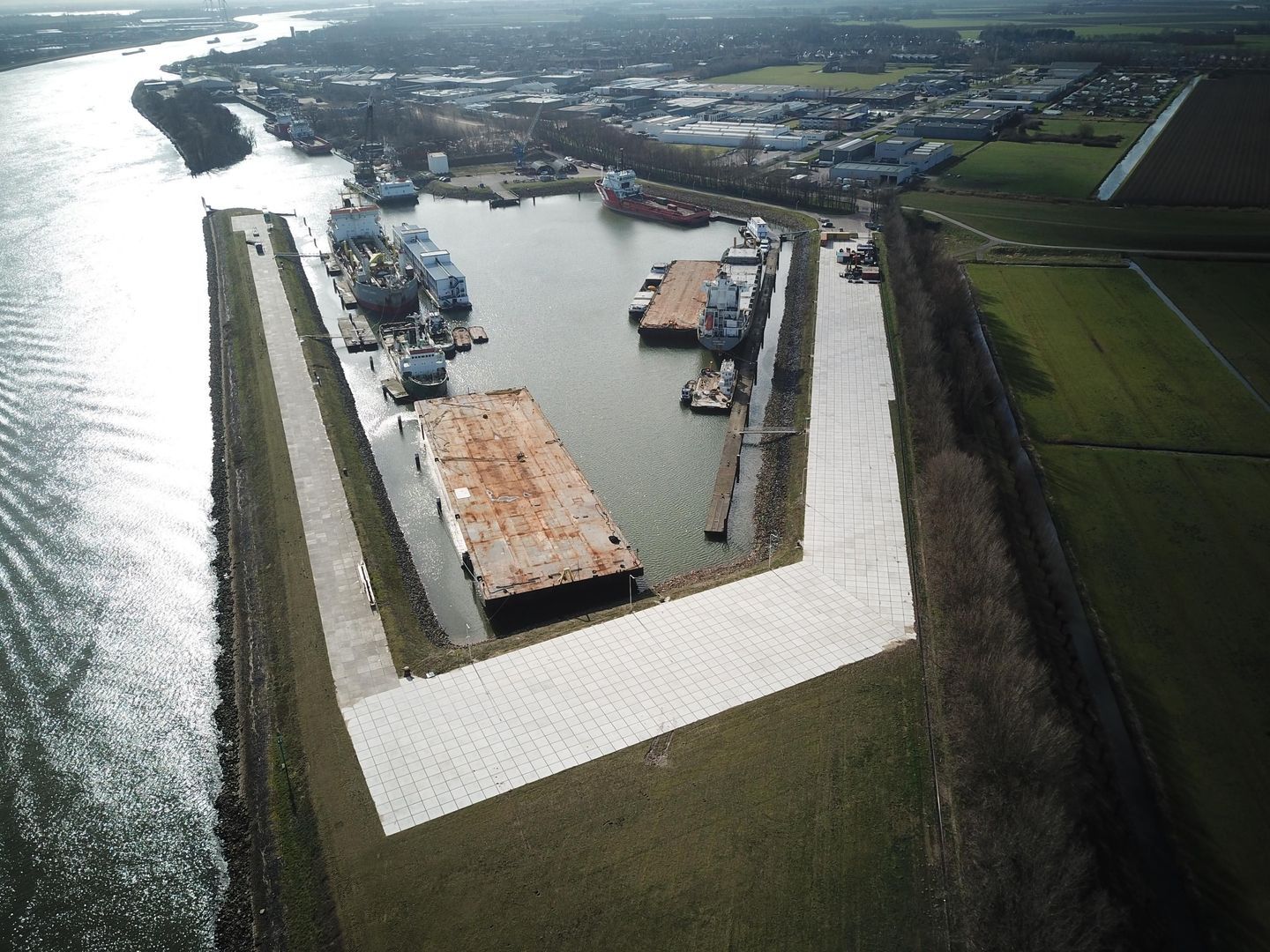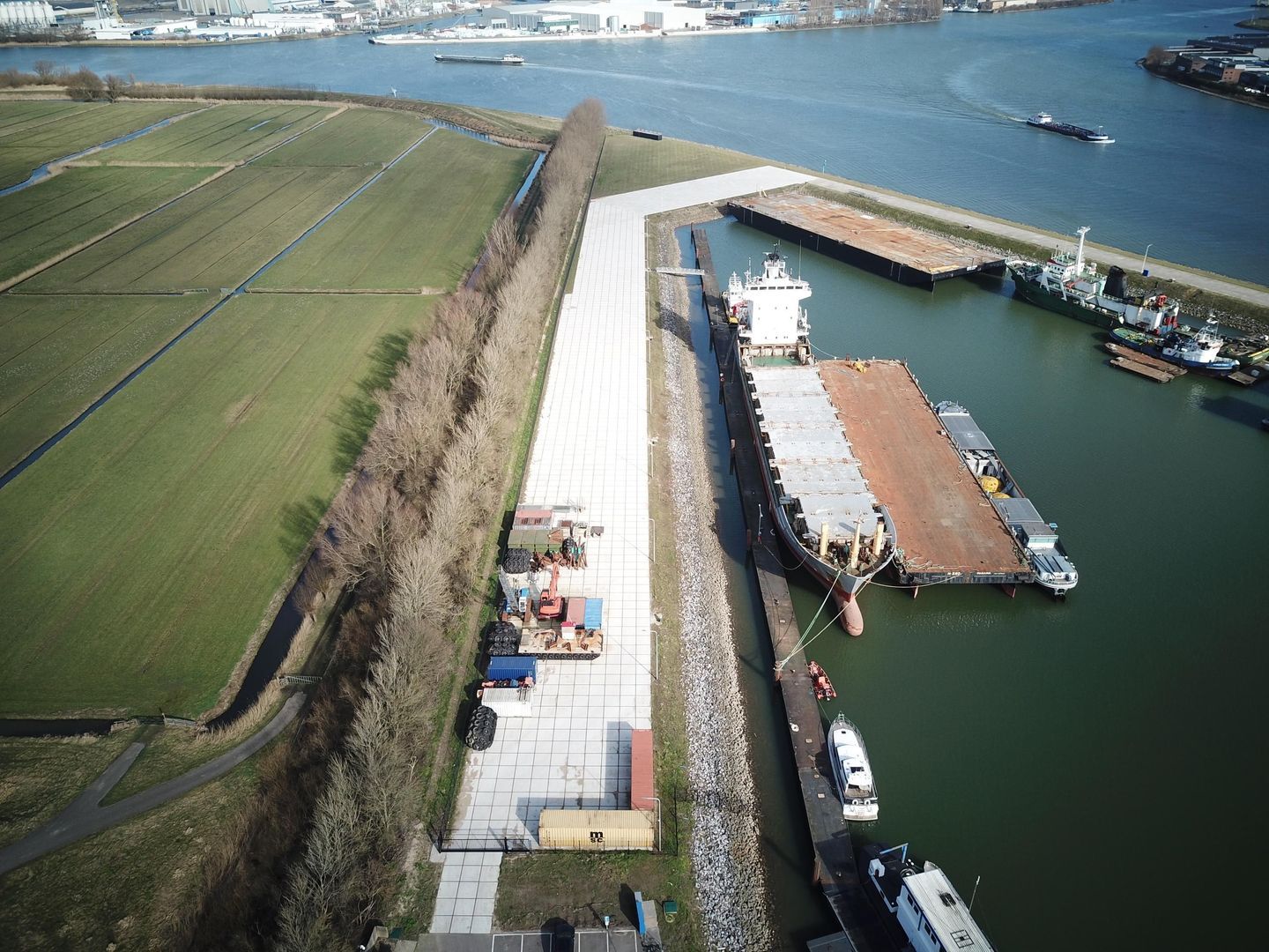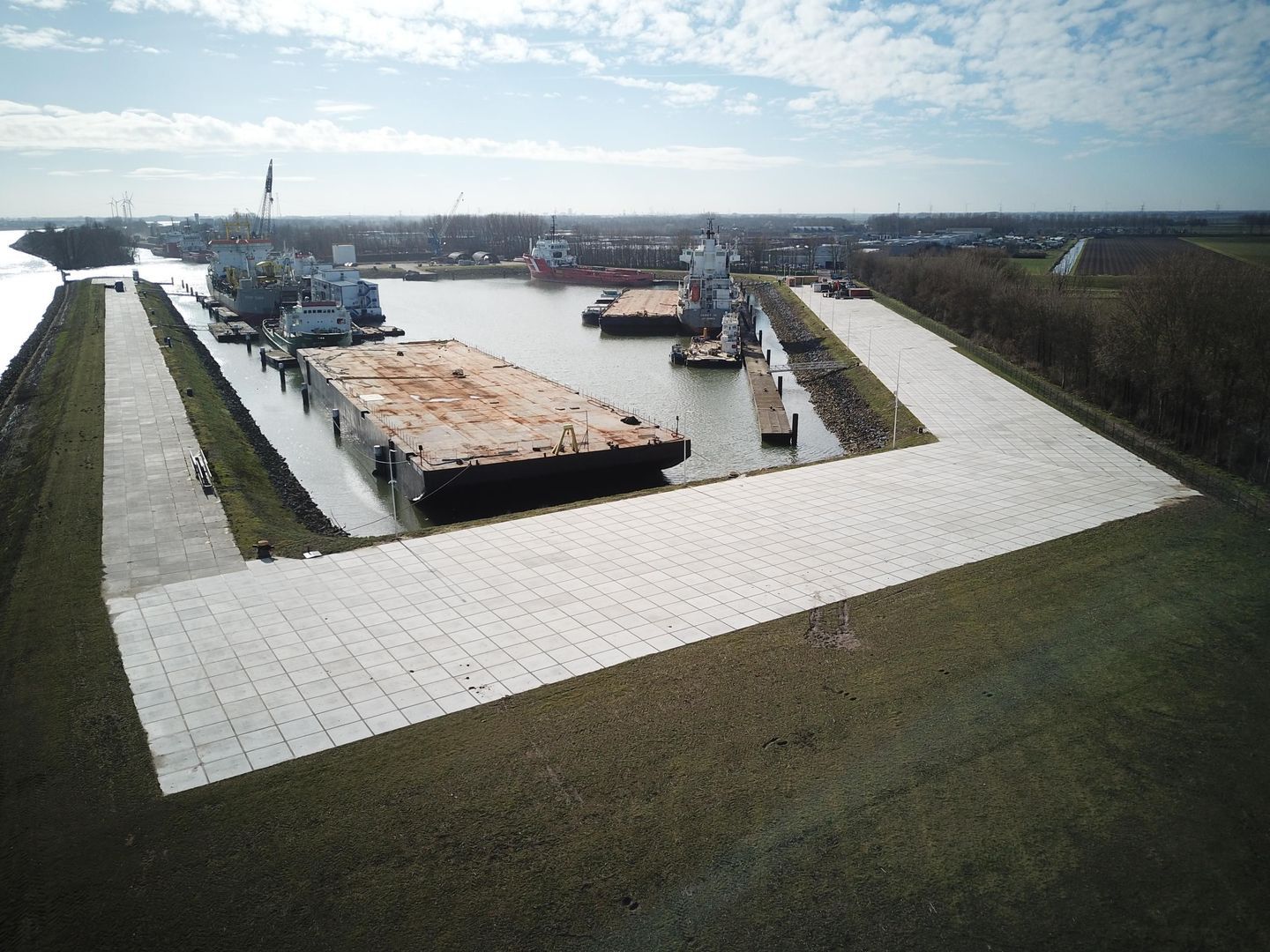 Rondom de haven ligt een groot, verhard terrein, dat beschikbaar is voor verhuur.