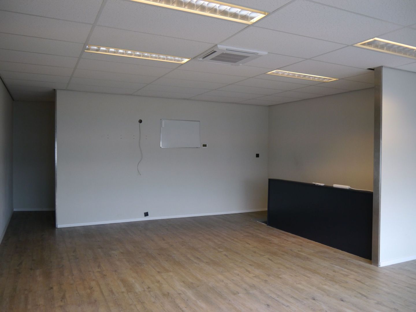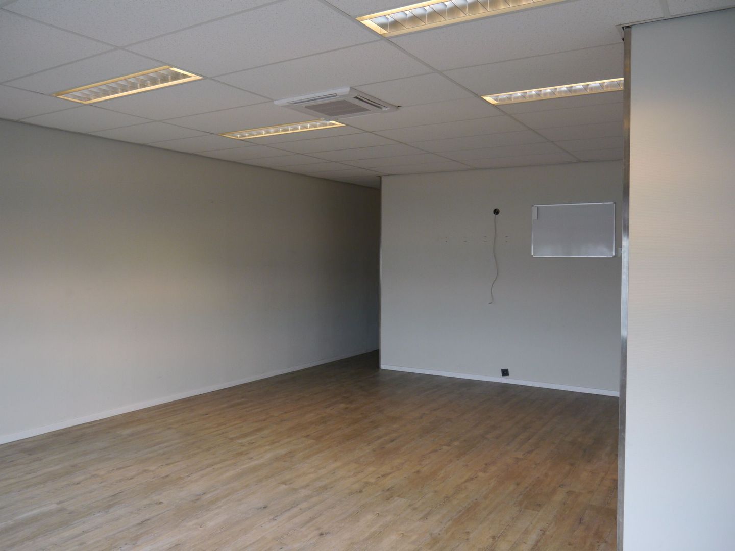 De kantoorruimte is afgewerkt met vloerbedekking, een systeemplafond en verlichting.