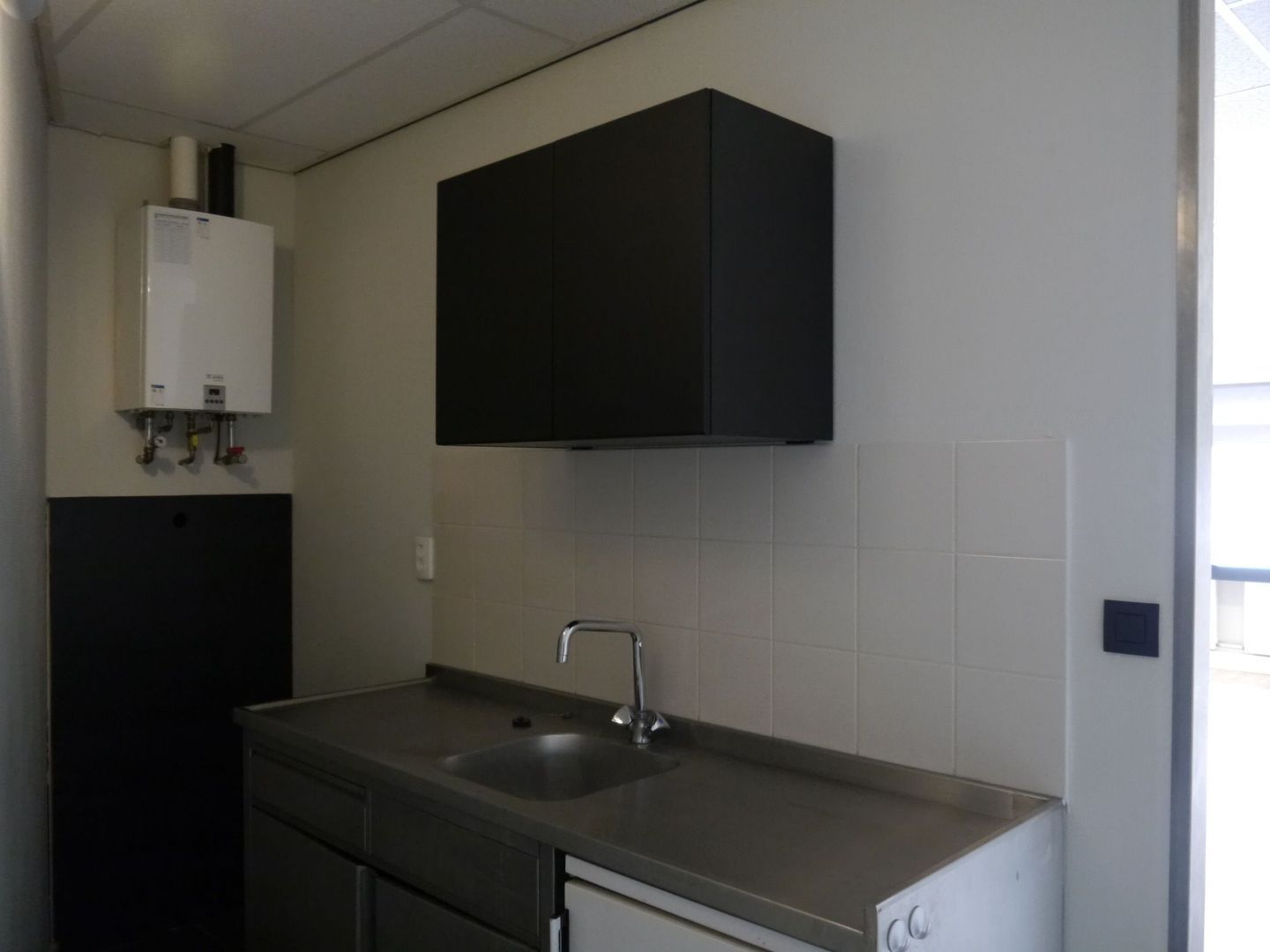 Op de verdieping is een grote open kantoorruimte met een halfopen kitchenette, waarin tevens de cv-ketel hangt.