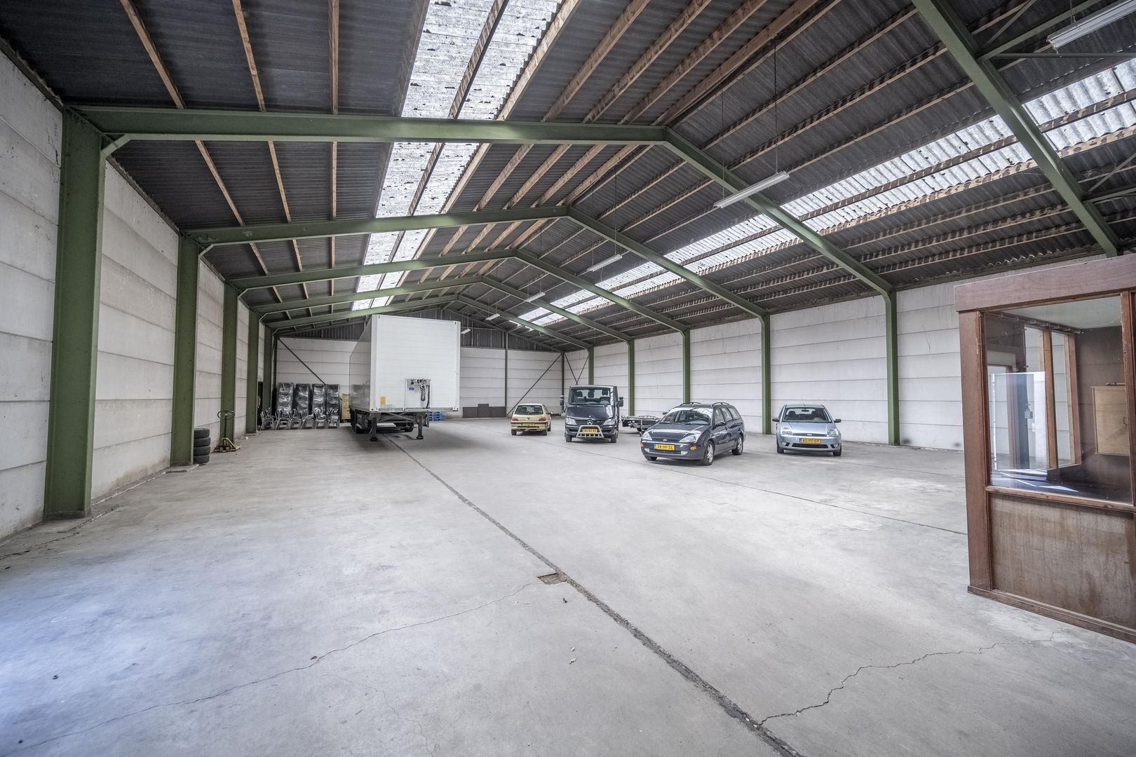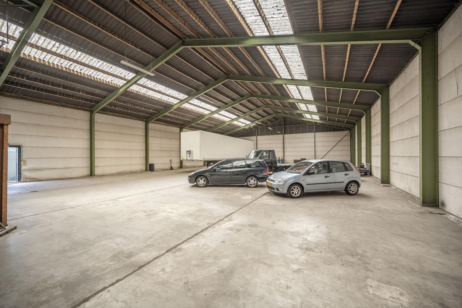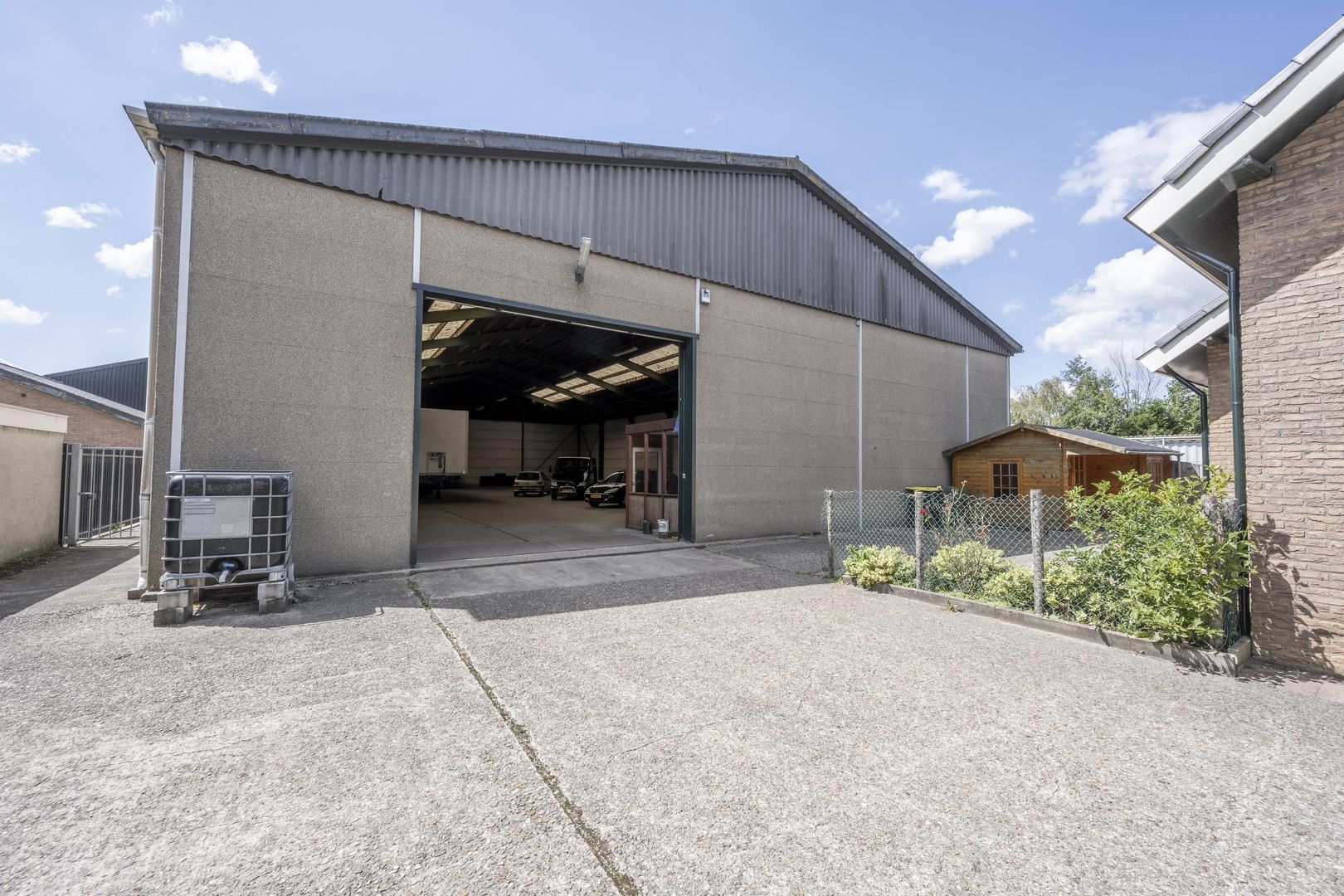 De bedrijfsruimte staat achter het huis en heeft een buitenmaat van circa 20 x 34.5 meter. Constructie: staalconstructie met prefab betonnen wanden, betonnen vloer, zadeldak met golfplaten dek, elektra en sectional deur. Er is een toiletruimte en een kleine kantoorruimte aanwezig.
