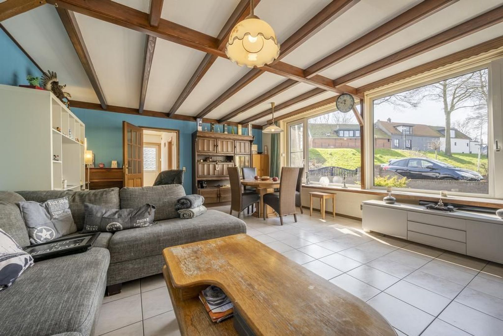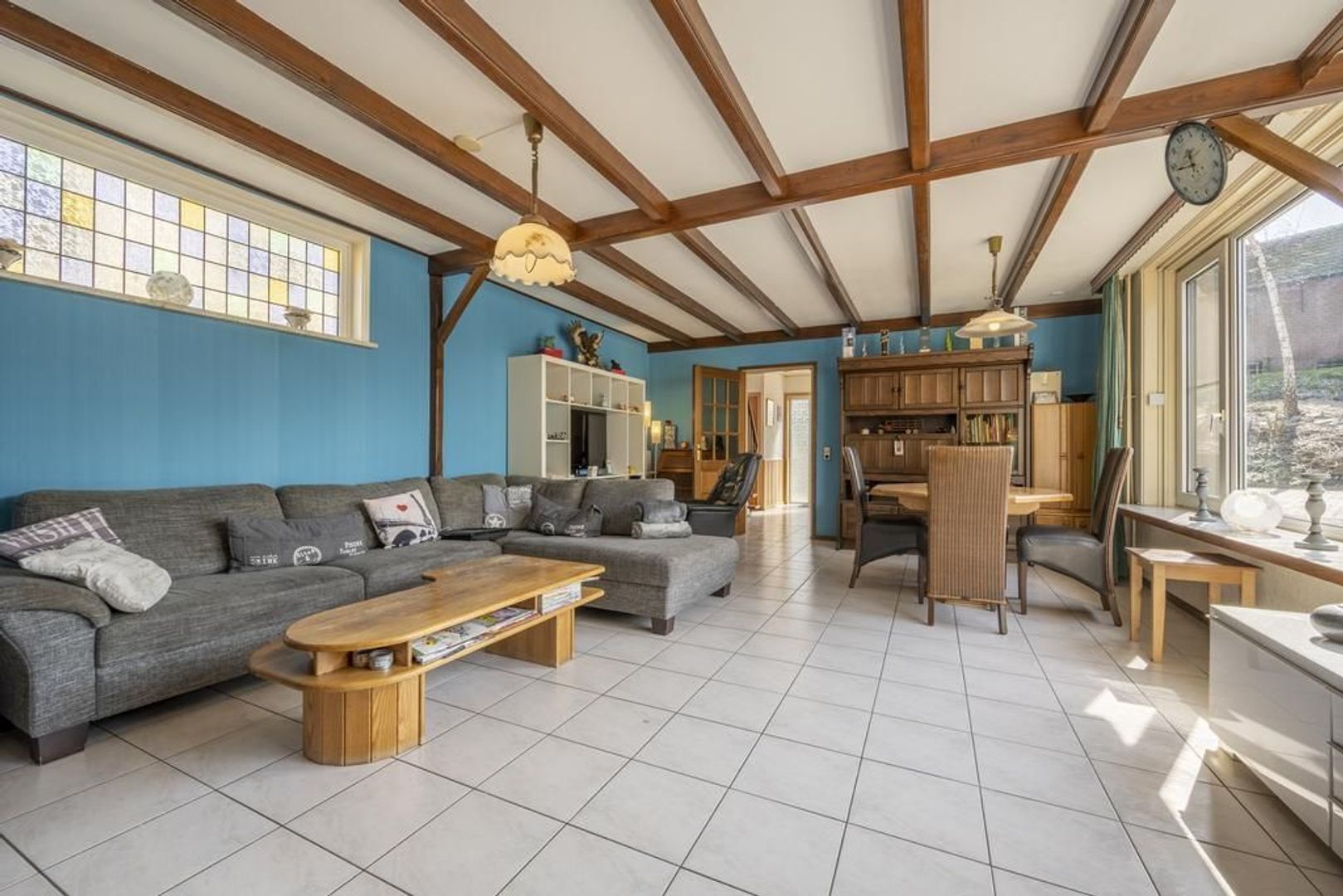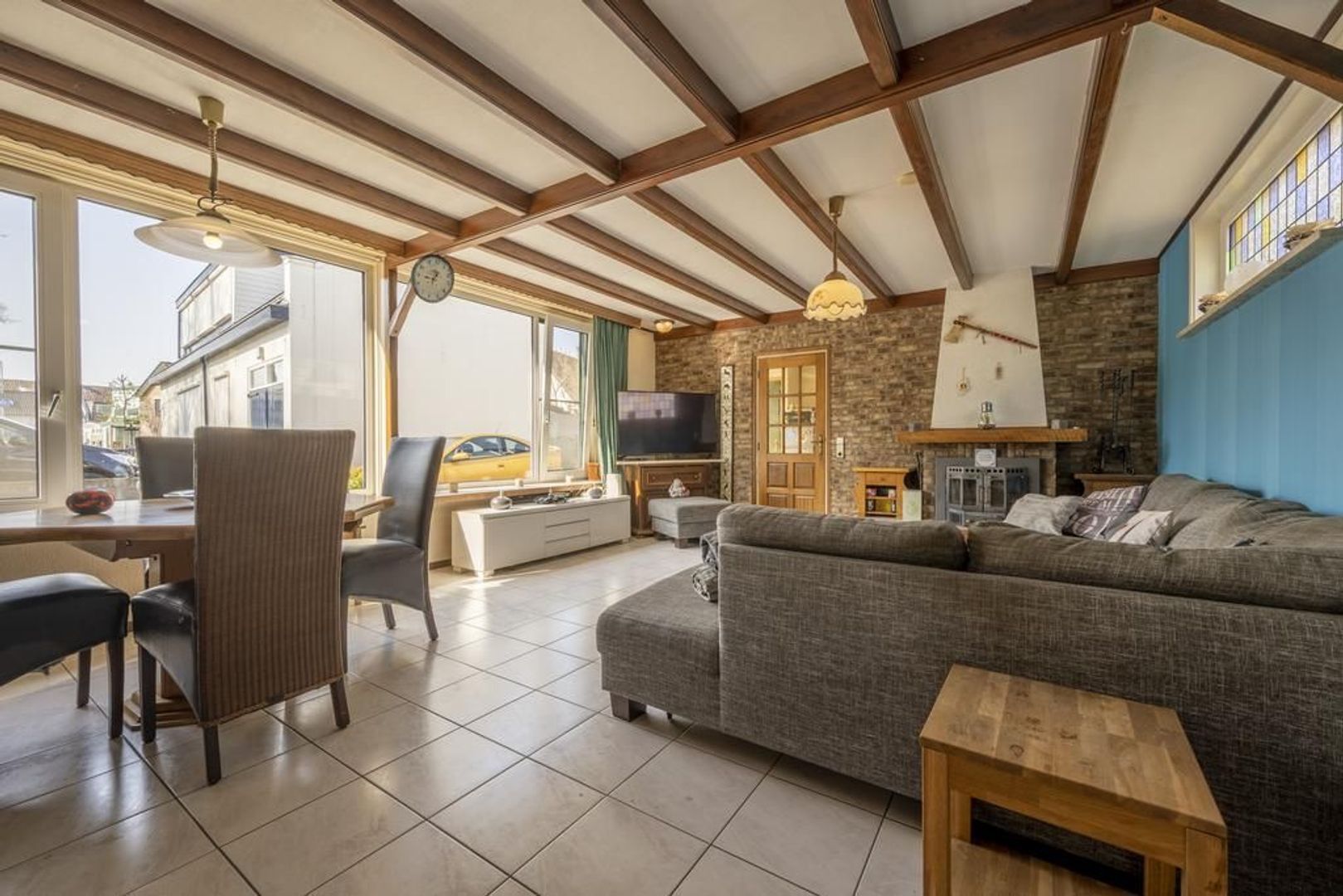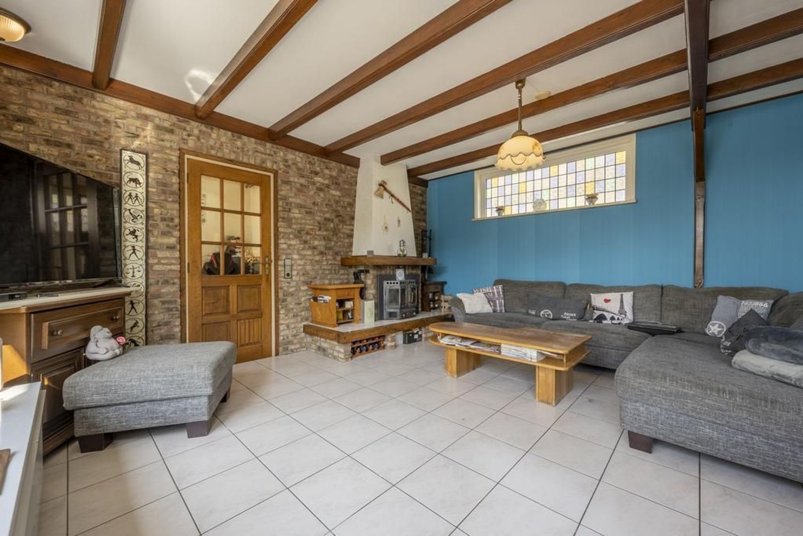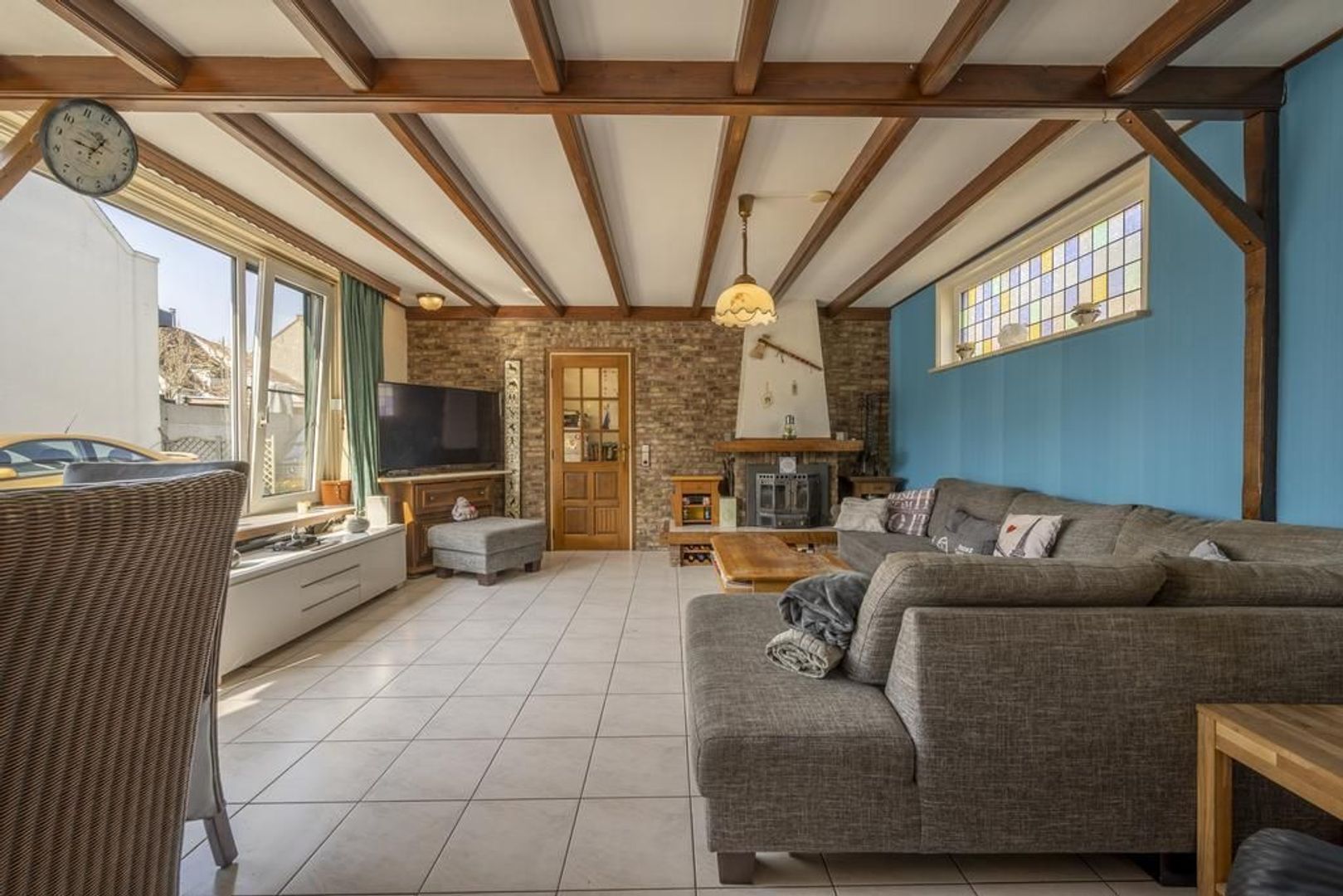 De woonkamer heeft grote ramen, dus veel lichtinval. Het balken plafond en de openhaard zorgen voor een gezellige sfeer.