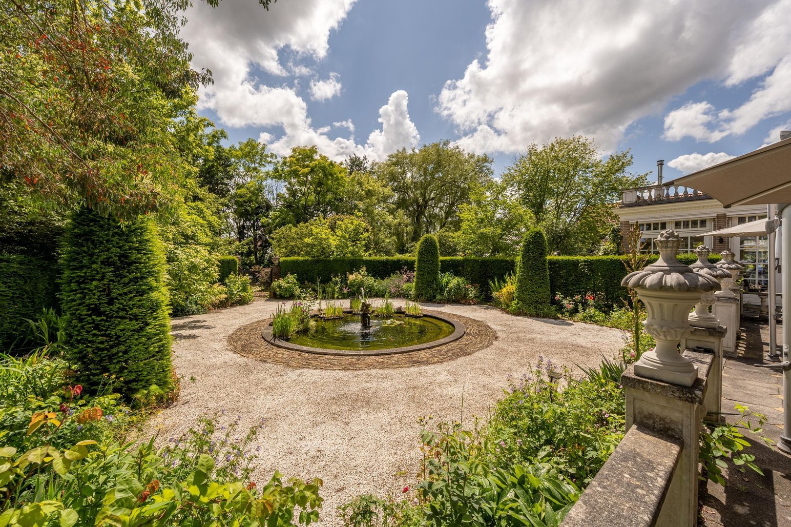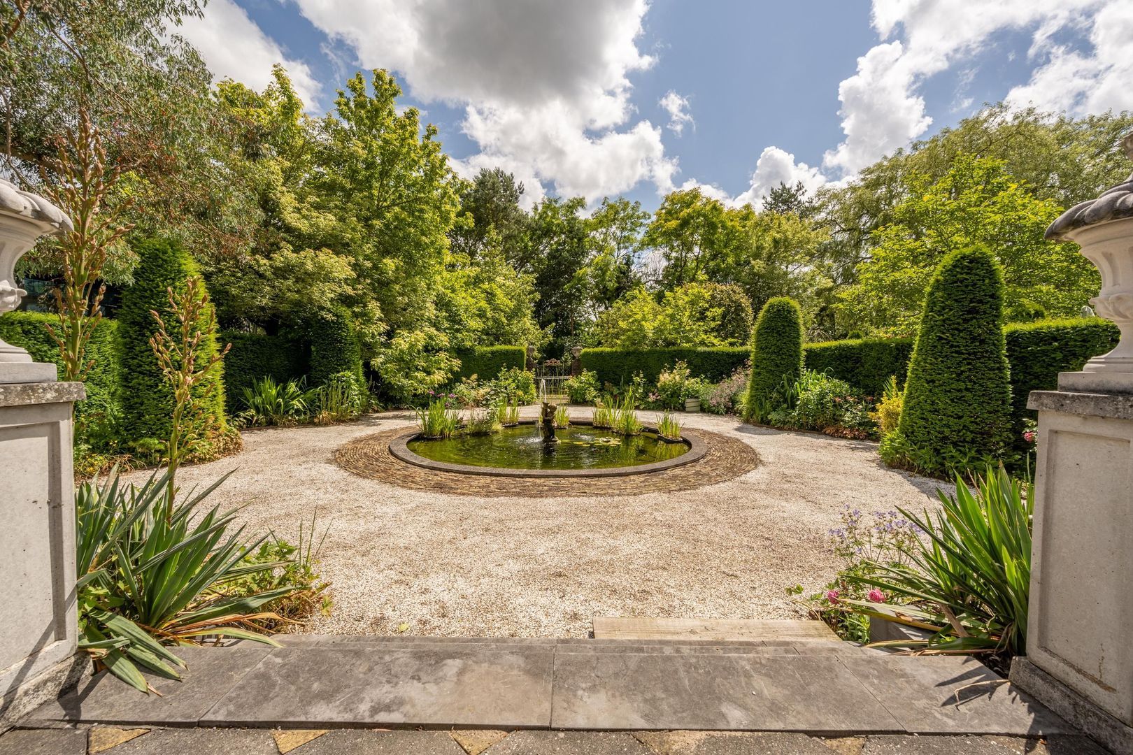 Ook de tuin is in stijl aangelegd met mooie terrassen, borders, een vijverpartij en een klein zwembad. In de garage is onder andere de techniek van het zwembad ondergebracht.