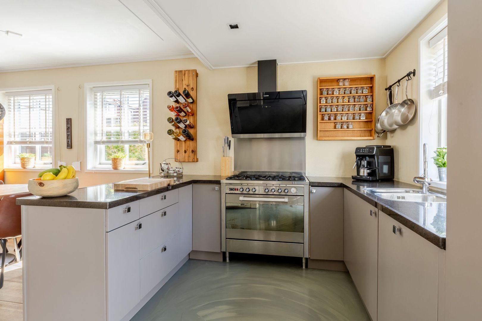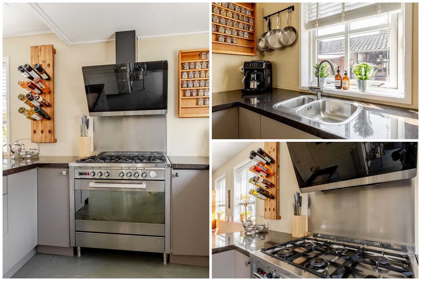 De indeling is als volgt: entree, hal met meterkast en toegang tot het leefgedeelte. Dit bestaat uit een gezellige woonkamer, afgewerkt met eiken vloerdelen. De houtkachel zorgt voor sfeer en comfortabele warmte. De keuken ligt aan de tuinkant. Deze heeft een U-vormige inrichting en is uitgevoerd met enkele inbouwapparaten, een solitair gasfornuis met oven en een Amerikaanse koelkast. De grote provisie/trapkast zorgt voor veel extra bergruimte.