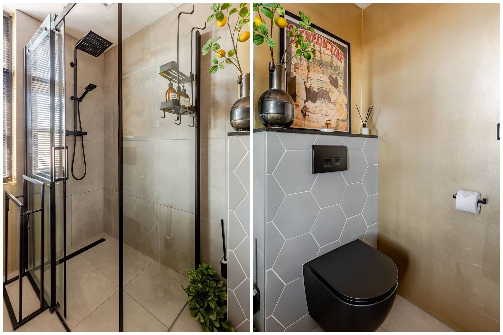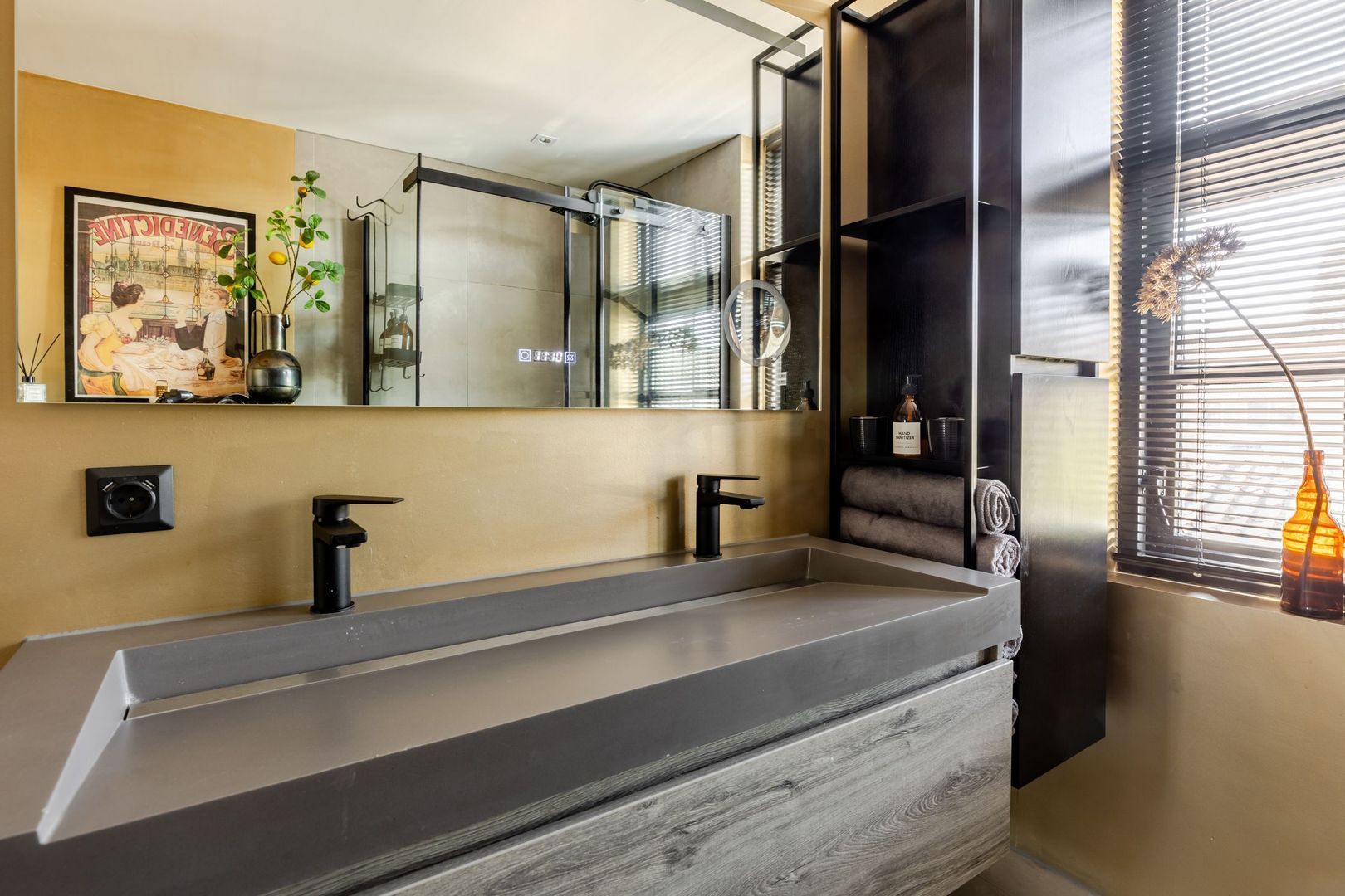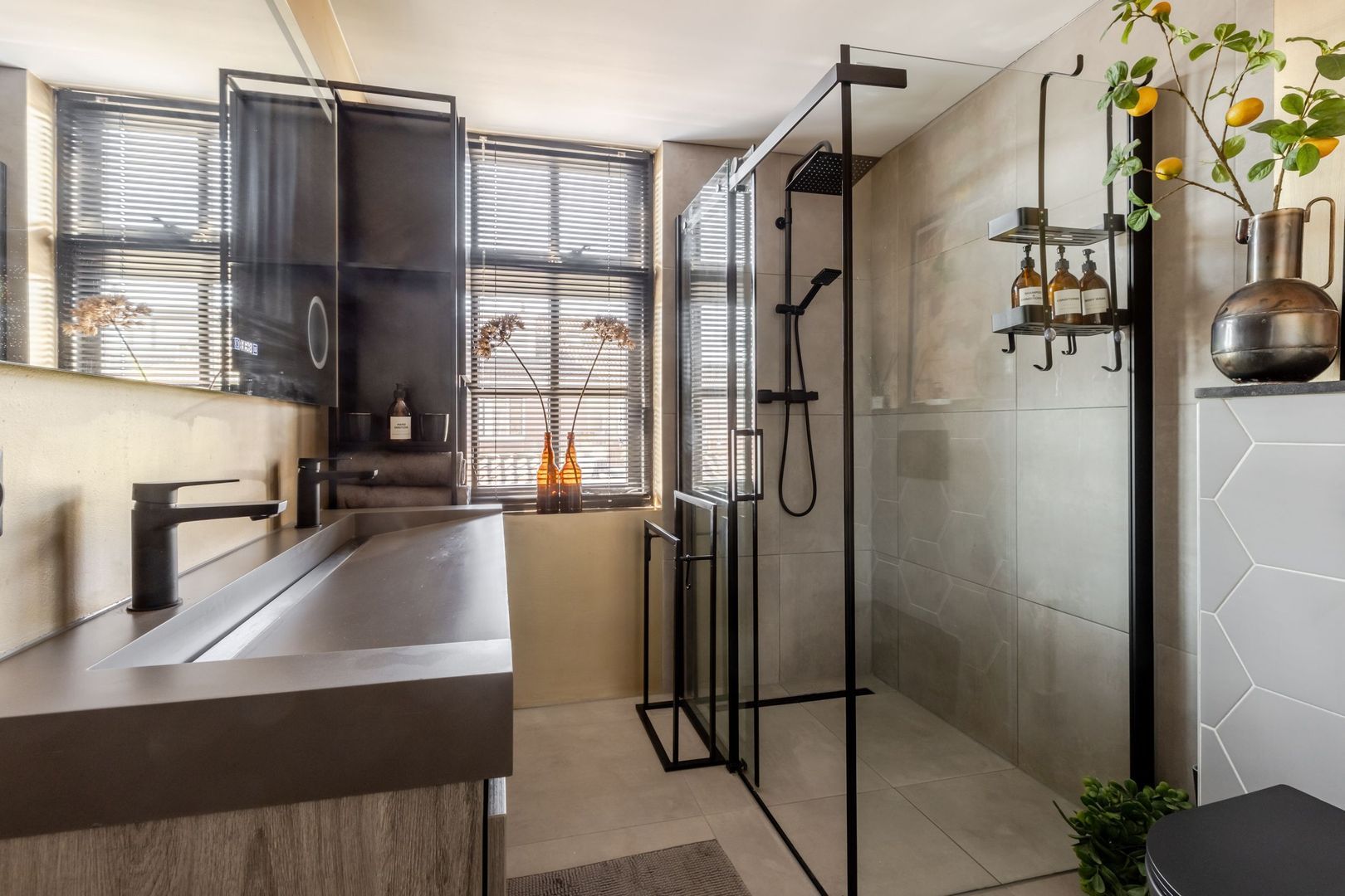 Een tussenhal met de toiletruimte geeft toegang tot de eerste verdieping. Hier zijn twee slaapkamers (voorheen drie) en een prachtige badkamer. Deze is van 2023 en biedt plaats aan een luxe inloopdouche, een dubbel wastafelmeubel en een wandtoilet. Fraai tegelwerk en zwarte accenten maken de ruimte helemaal van nu. Elektrische vloerverwarming en een raam dat open kan, dragen bij aan extra comfort.