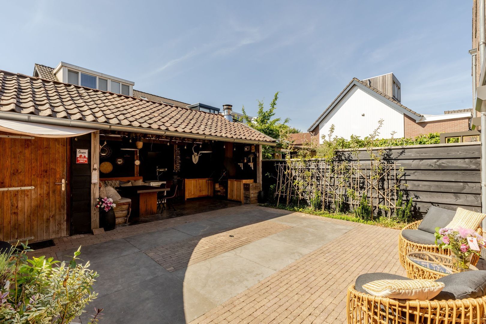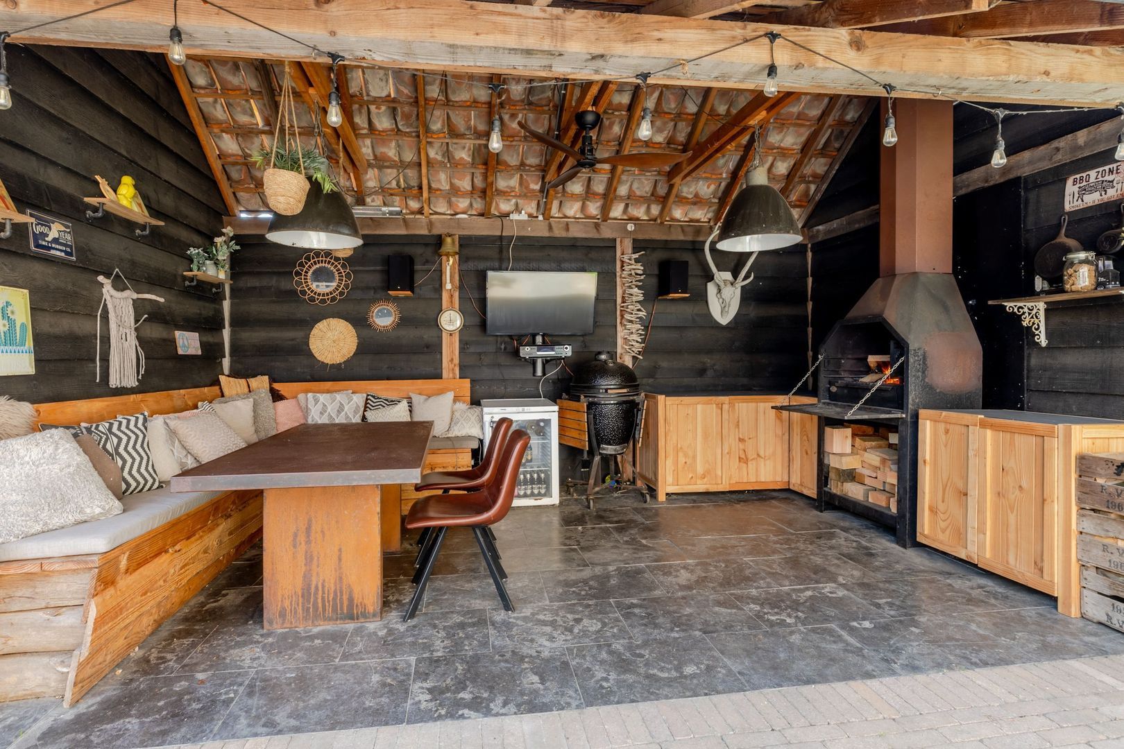 De achtertuin ligt op het zuiden. Achterin staat een grote, stoere overkapping. Het keukengedeelte met 'braai' en vaste zitbank blijven achter. In het afgesloten gedeelte zijn de aansluitingen voor de wasapparatuur gemaakt.