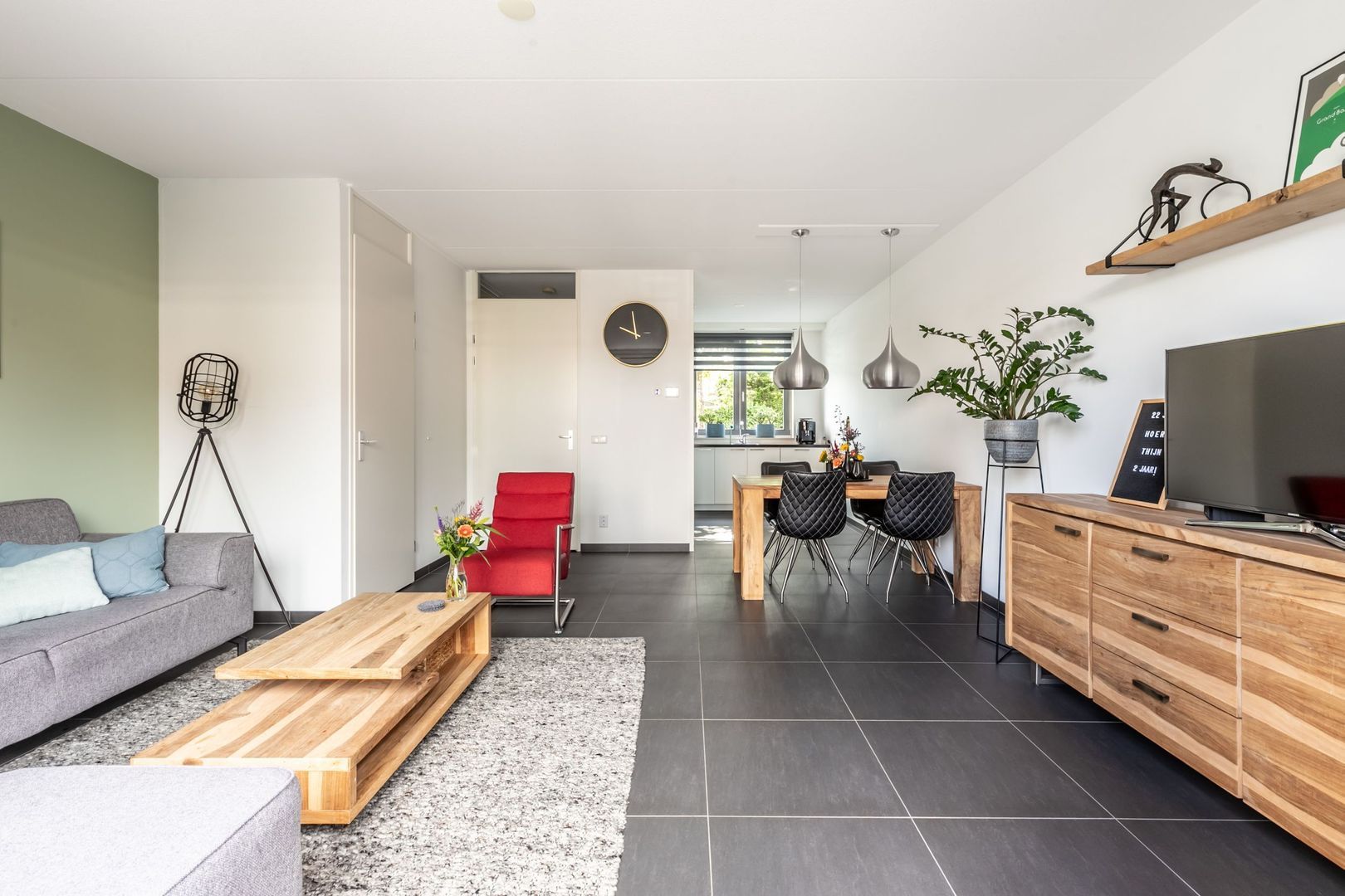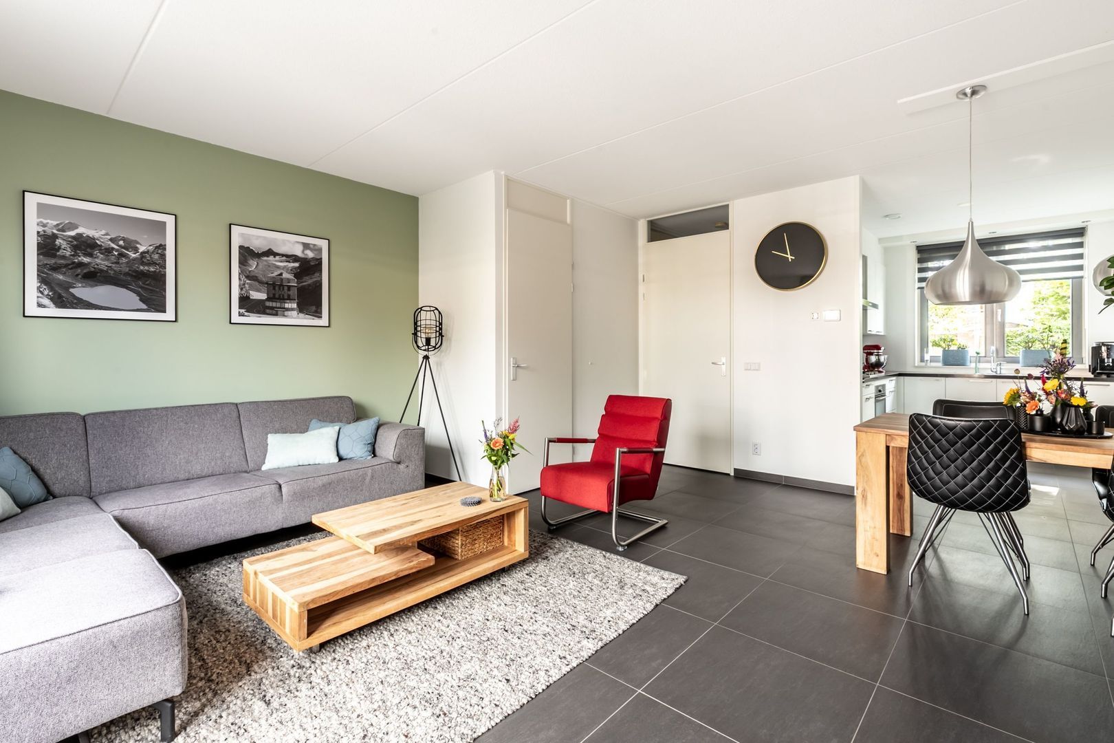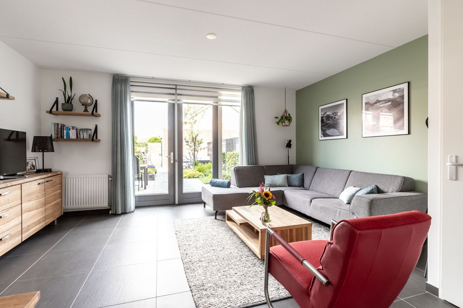Mooie tuingerichte woonkamer met openslaande deuren naar het terras en praktische trapkast.