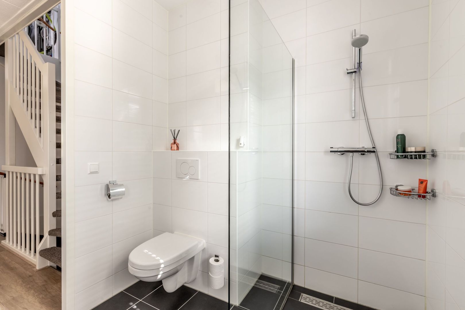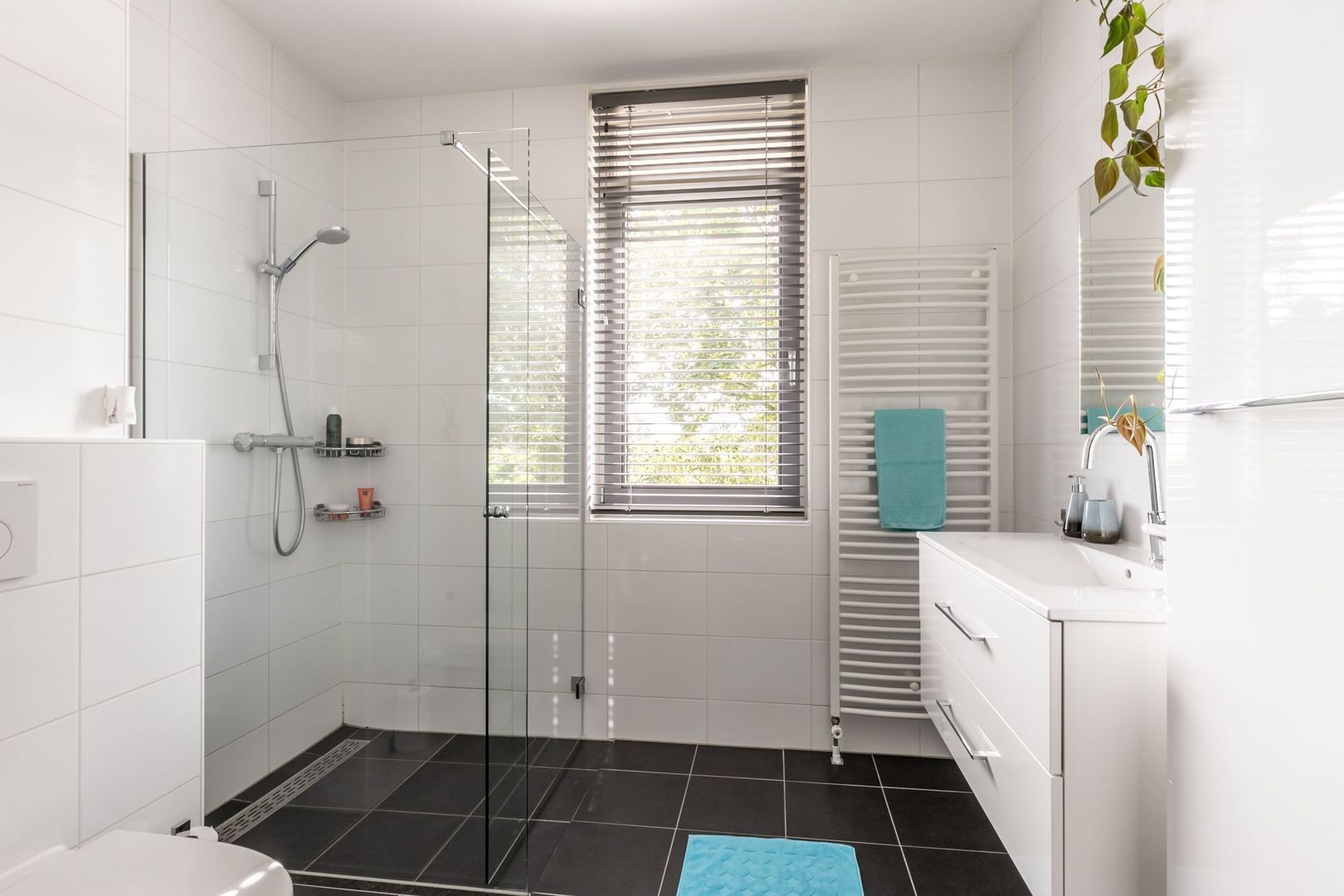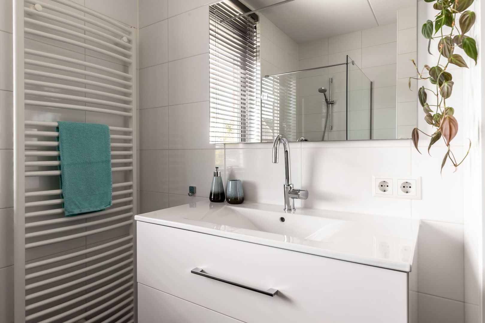 De badkamer is ingericht met een wastafelmeubel met spiegel, een inloopdouche, een design radiator en een tweede toilet. Het raam kan open, zodat desgewenst geventileerd kan worden met frisse buitenlucht.