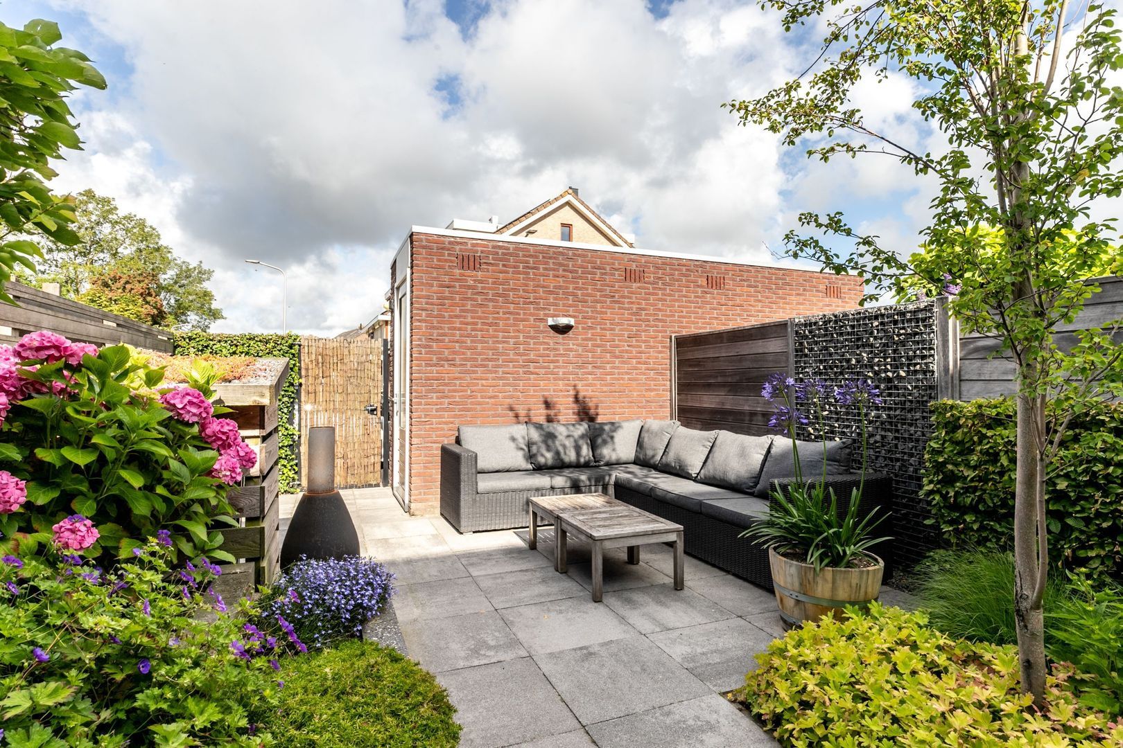 De achtertuin is mooi aangelegd met grote moderne tegels en borders met kleurrijke beplanting. Achterin staat een stenen berging.