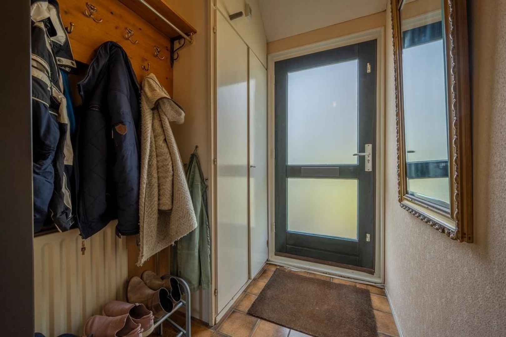 De begane grondvloer is afgewerkt met een plavuizen vloer.
