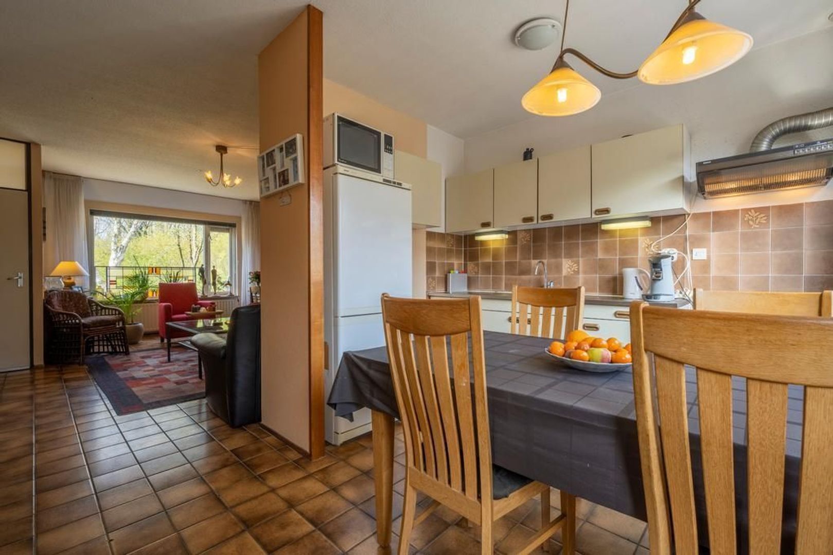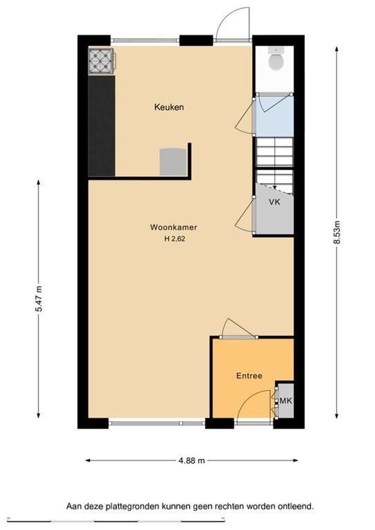 Entree/hal met meterkast en toegang tot de woonkamer met open keuken aan de tuinzijde. Deze is ingericht met een eenvoudige wandopstelling.