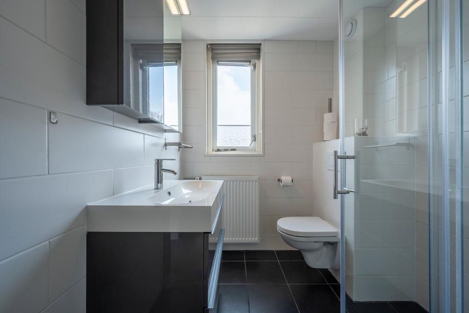 Deze is modern en uitgevoerd in wit/antraciet en heeft een tweede toilet, een wastafelmeubel en een doucheruimte.