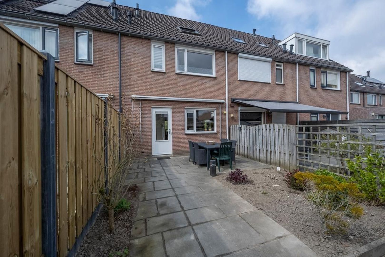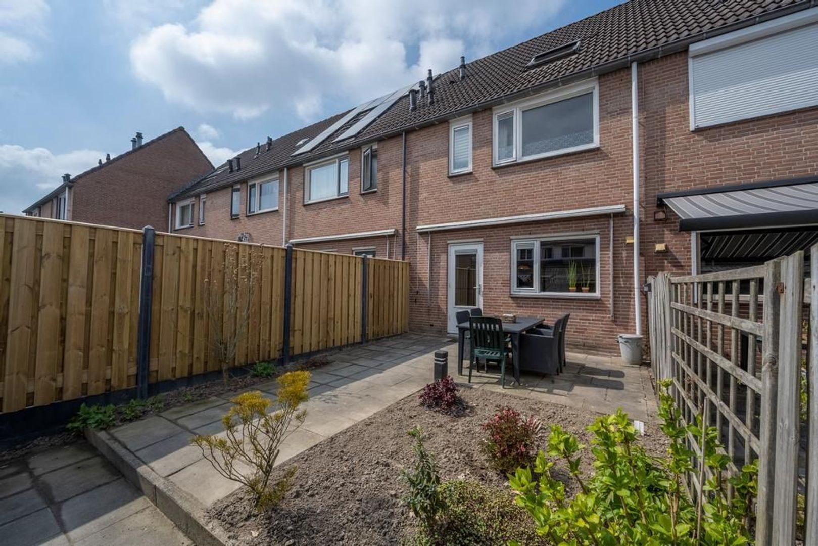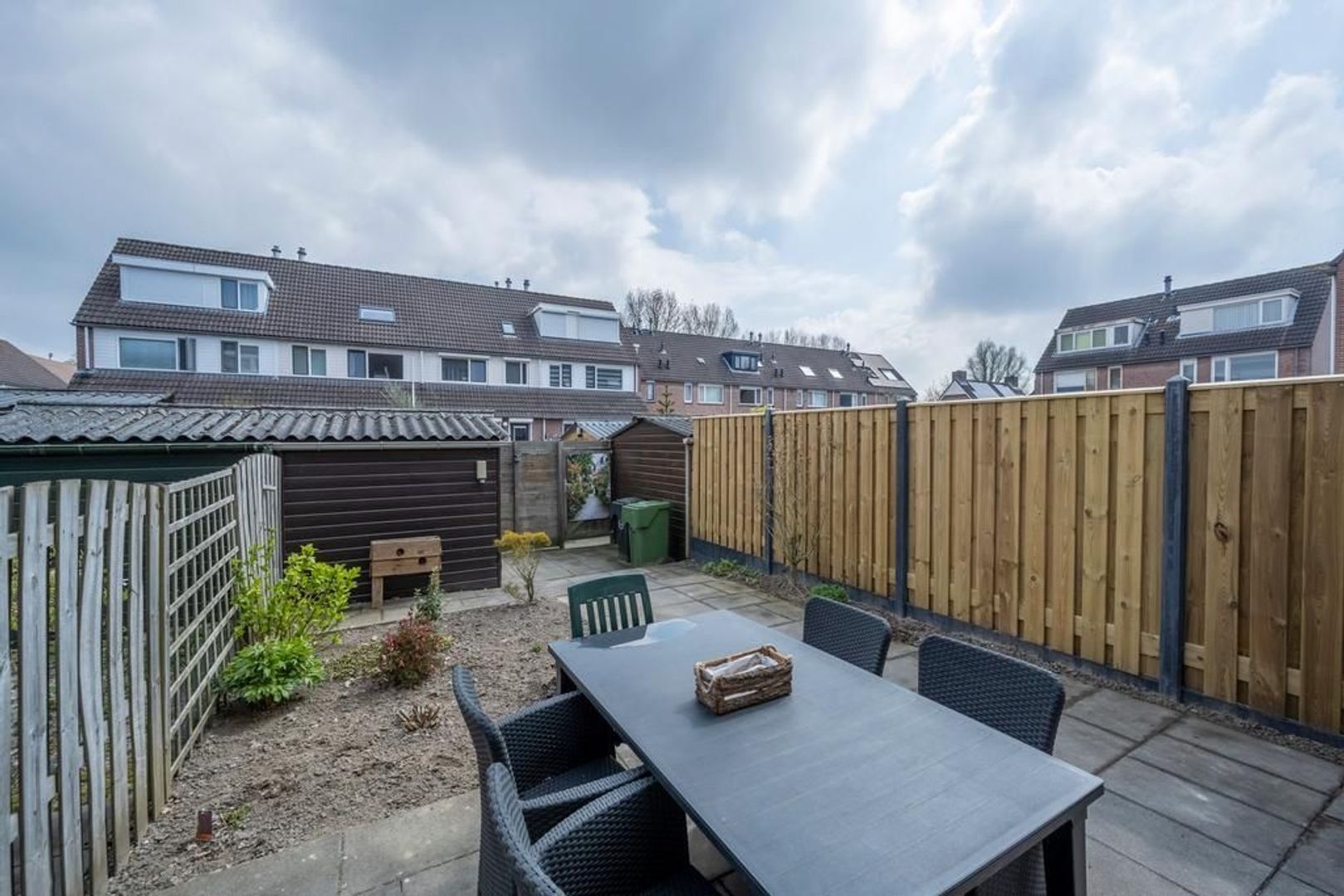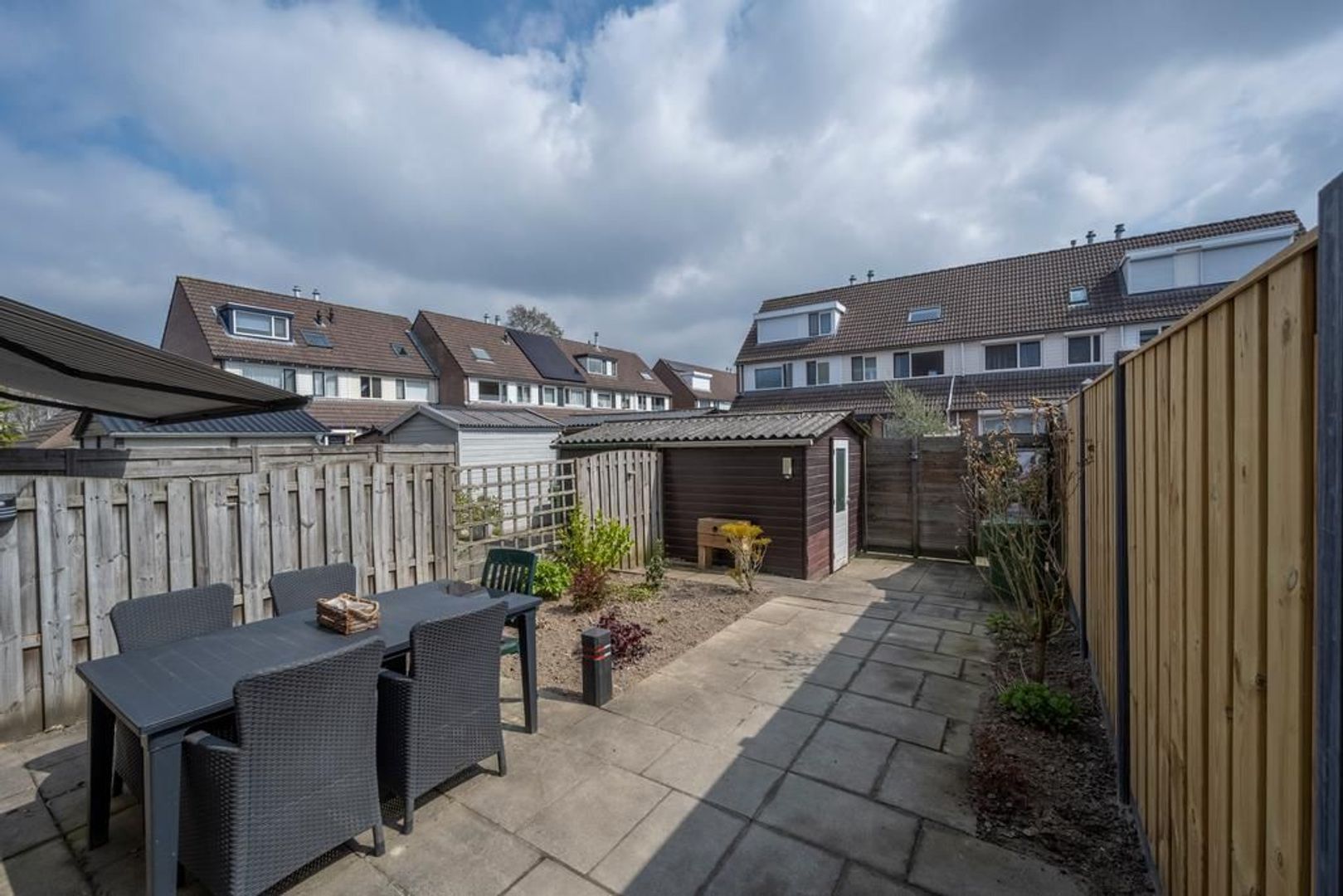 De tuin ligt op het oosten. Hierin wordt een nieuwe houten berging geplaatst. Een deel van de schutting is al vernieuwd.