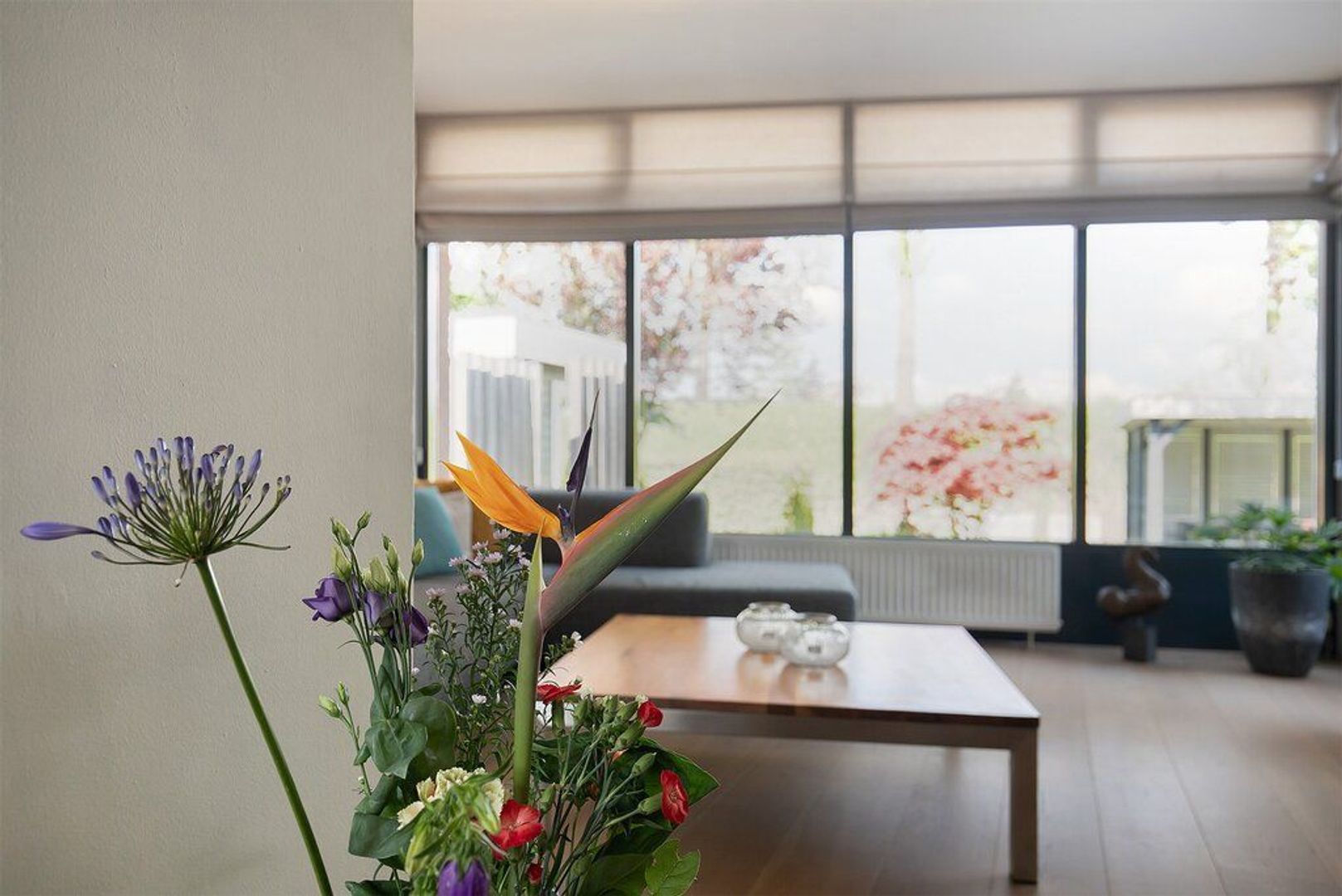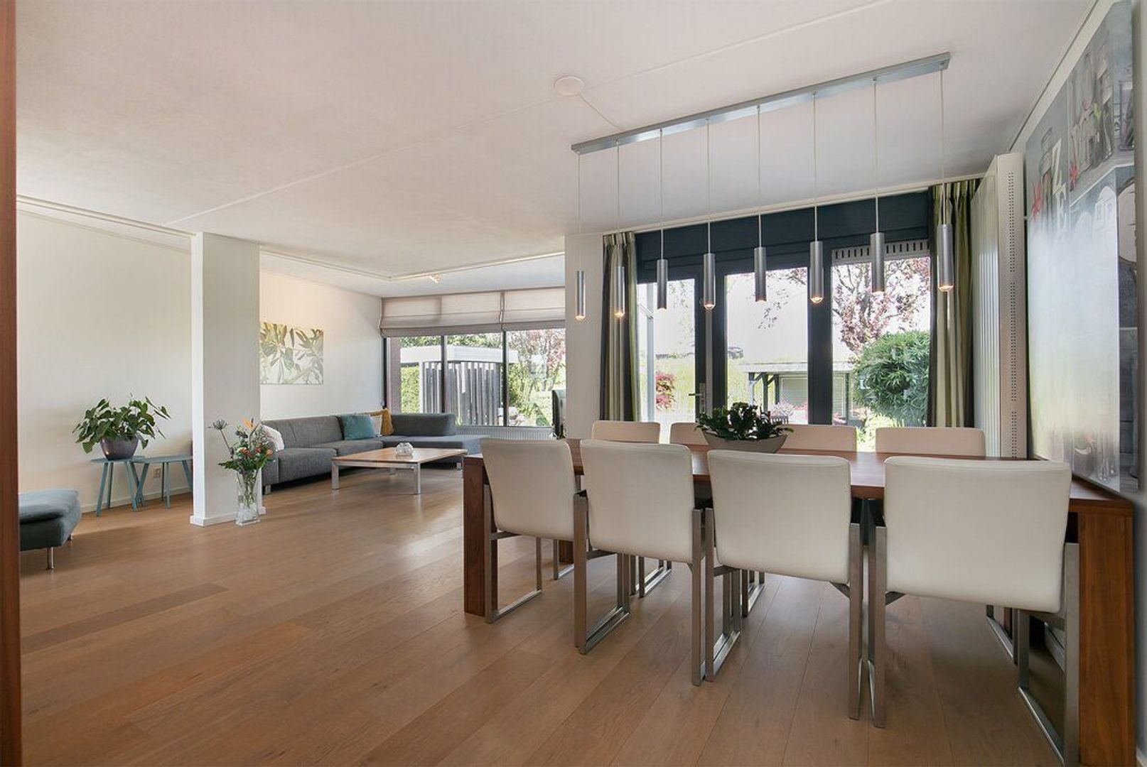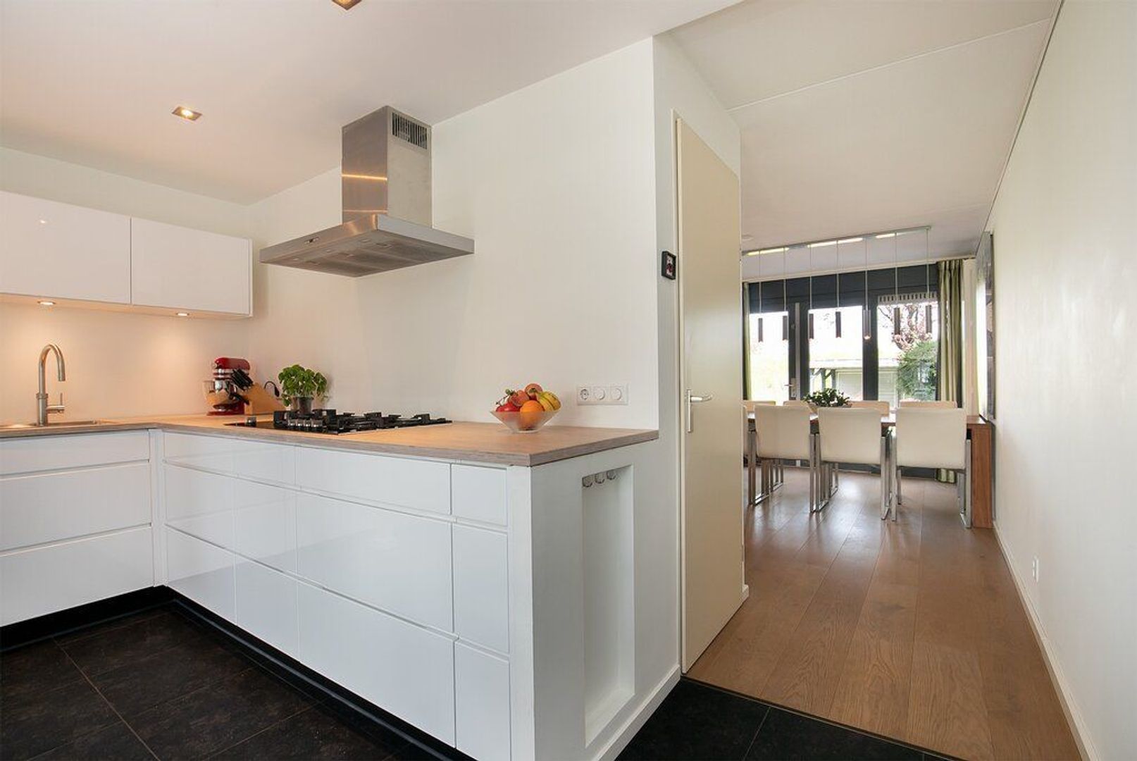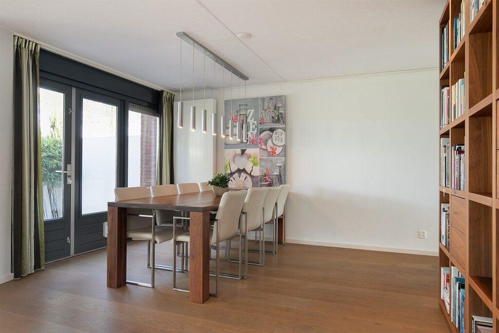 Ruime tuingerichte woonkamer met grote raampartij en openslaande deuren naar het terras. De halfopen keuken ligt aan de voorkant van het huis. Ook deze is royaal en biedt ruimte aan een extra eethoek. In 2018 is een nieuwe inrichting geplaatst in L-vormige opstelling met een extra diep aanrechtblad. Natuurlijk is deze uitgevoerd met inbouwapparatuur, alsmede een Quooker.