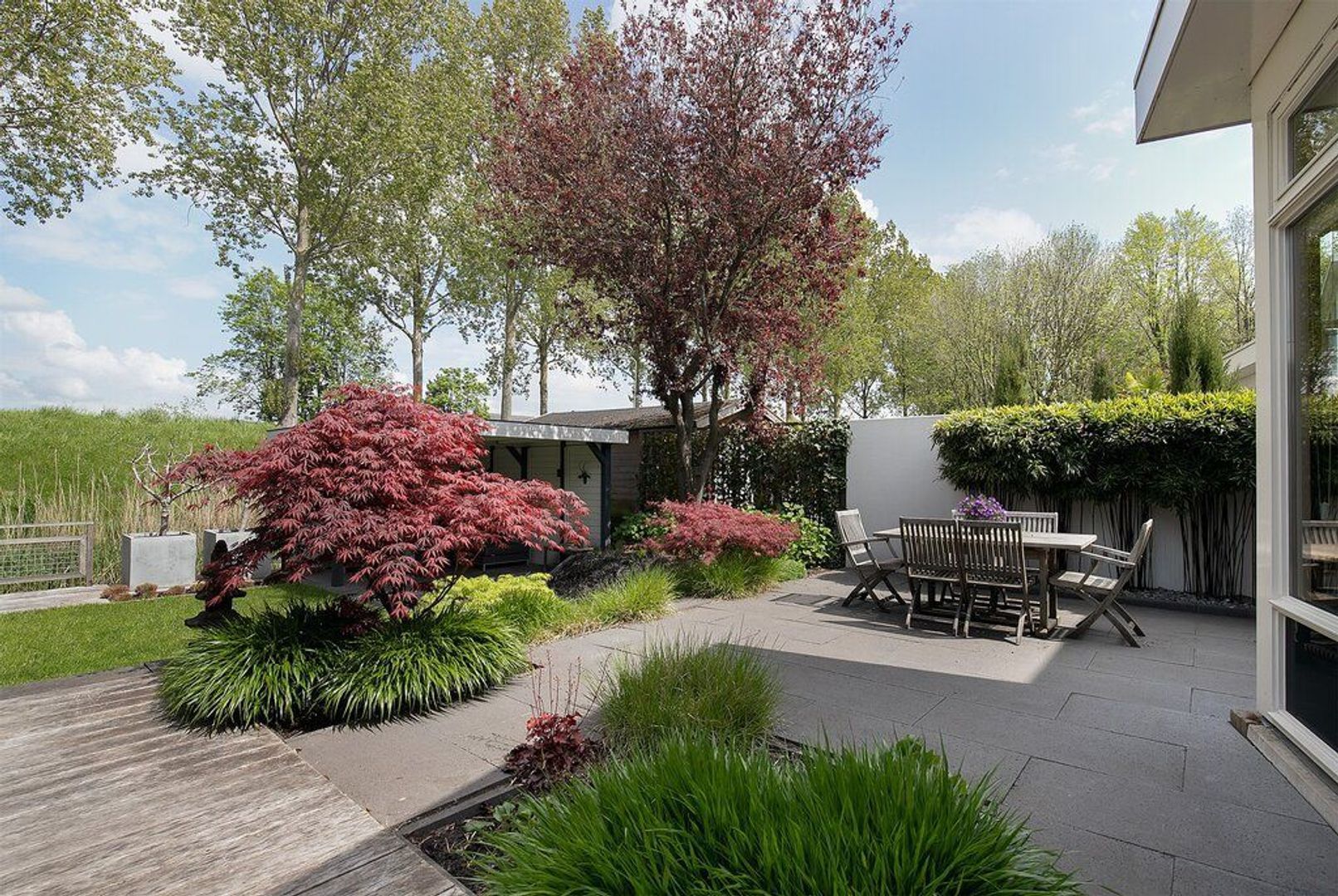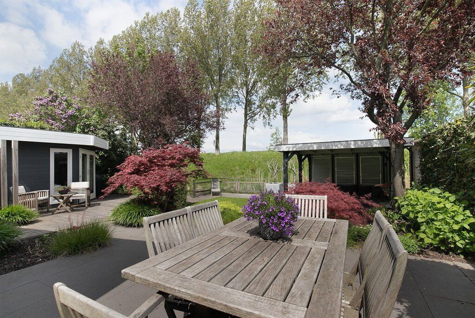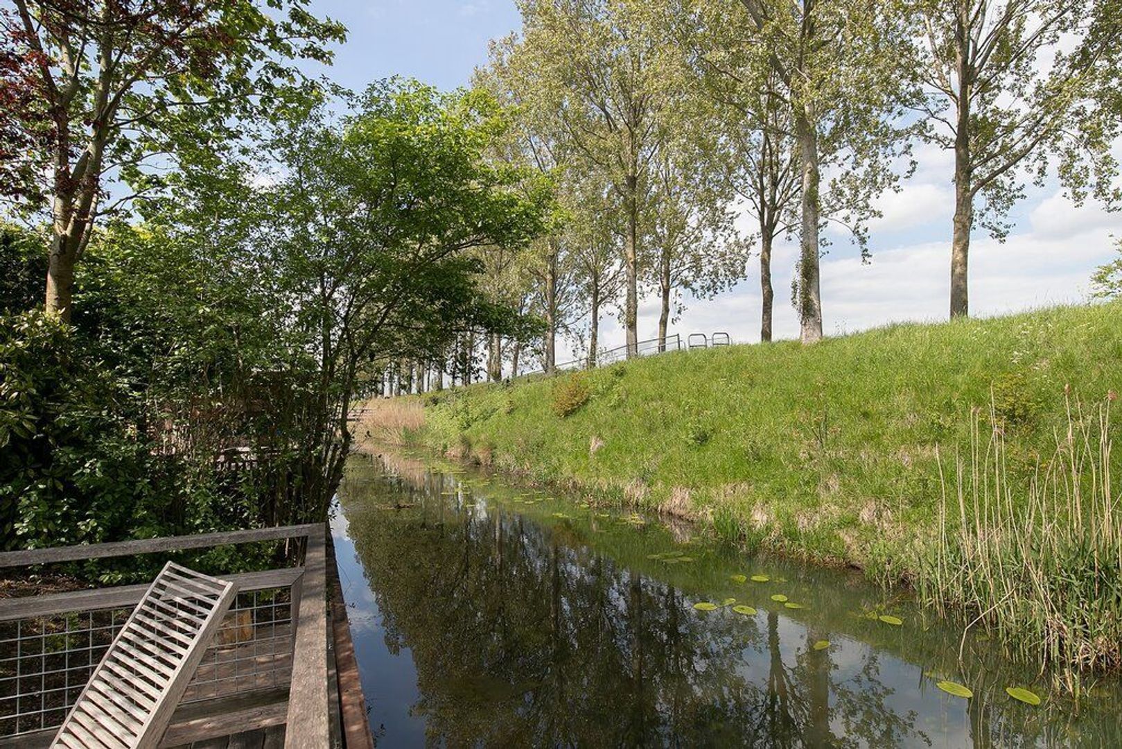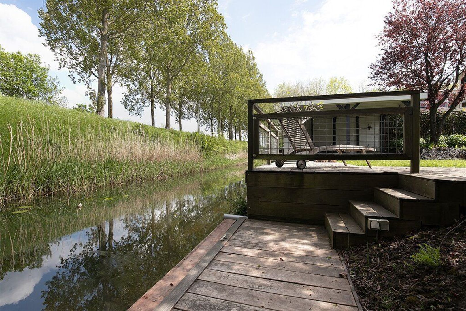 De diepe en zonnige achtertuin ligt op het noordoosten en grenst aan het water, waar een vlonder is gemaakt. Recent is een nieuwe damwand geplaatst.