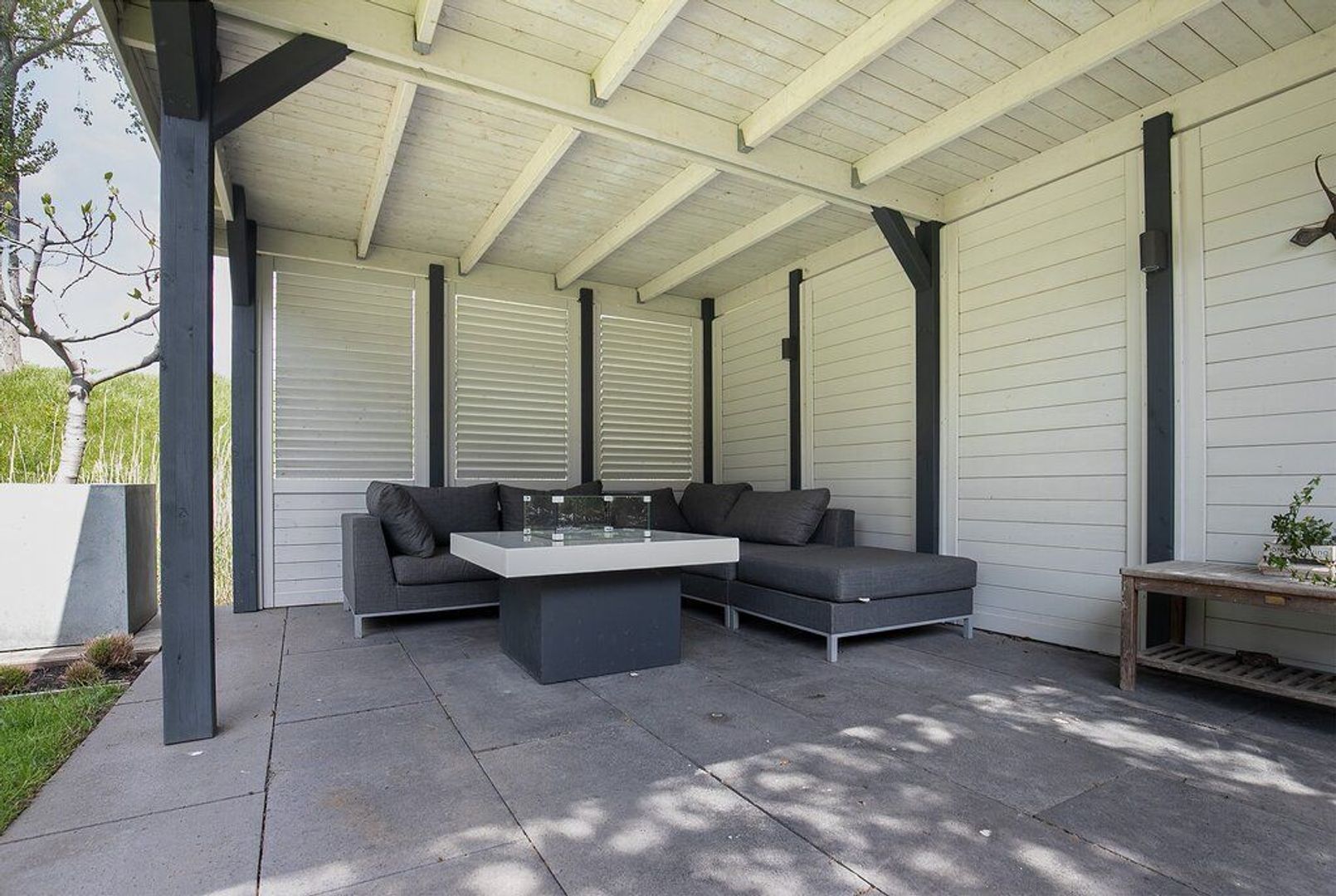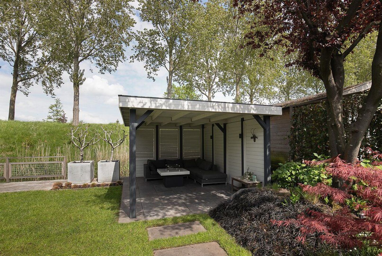 De tuin is een lust voor het oog. Achterin staat een mooie overkapping met ruimte voor een grote lounge set en een houten tuinhuis, eventueel te gebruiken als praktijk-/kantoorruimte.