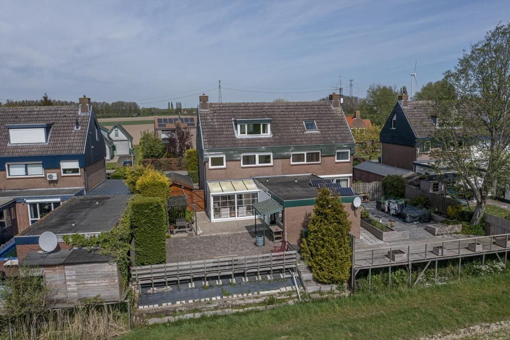 De achtertuin ligt op het zonnige zuiden. Achter is een stenen berging aangebouwd en naast de woning staat een houten garage.