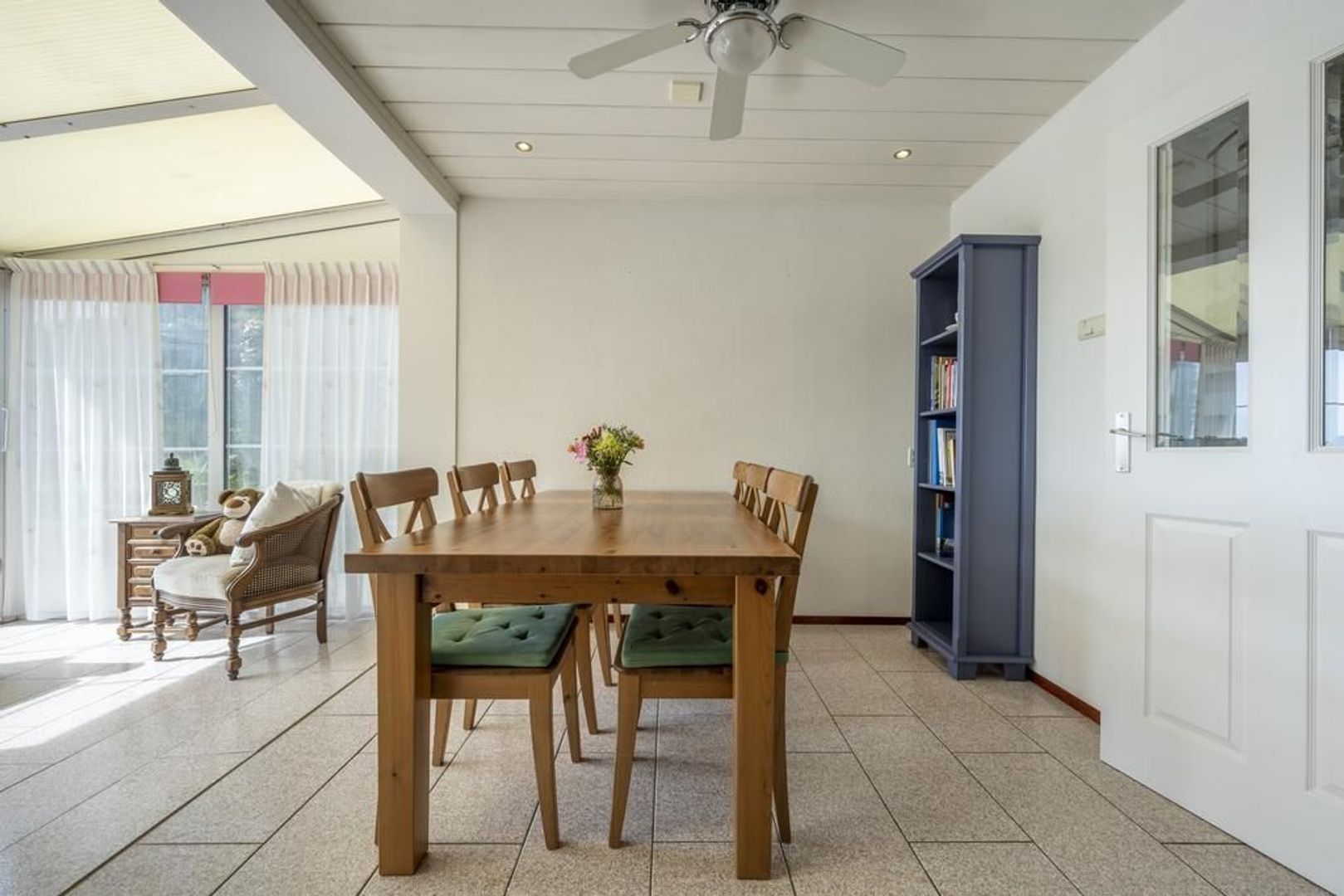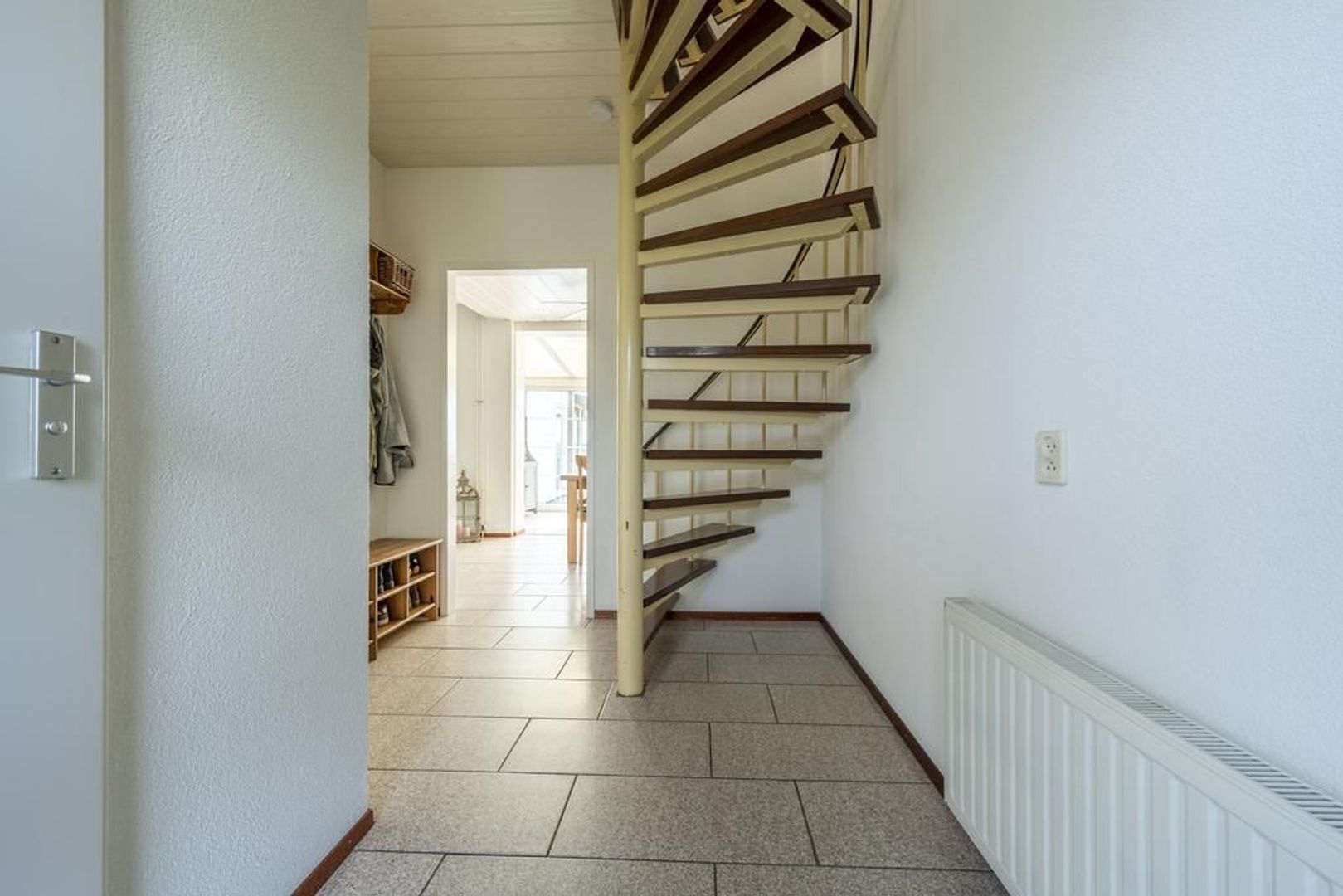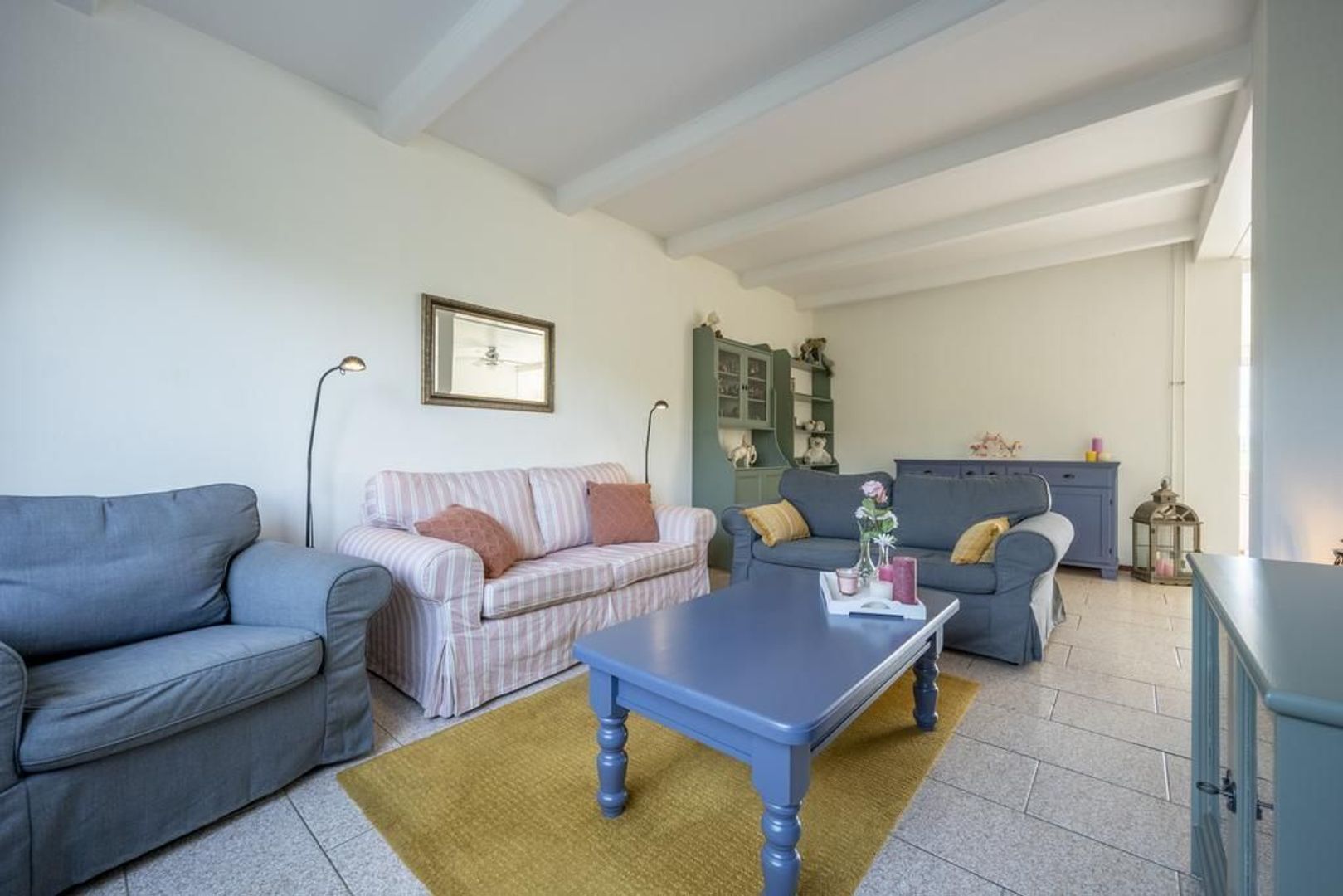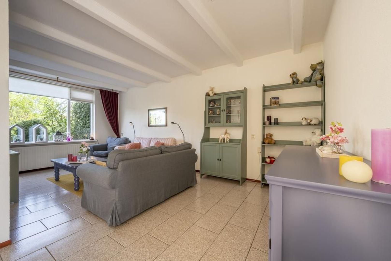 De vloer is afgewerkt met plavuizen en de wanden met structuurverf.