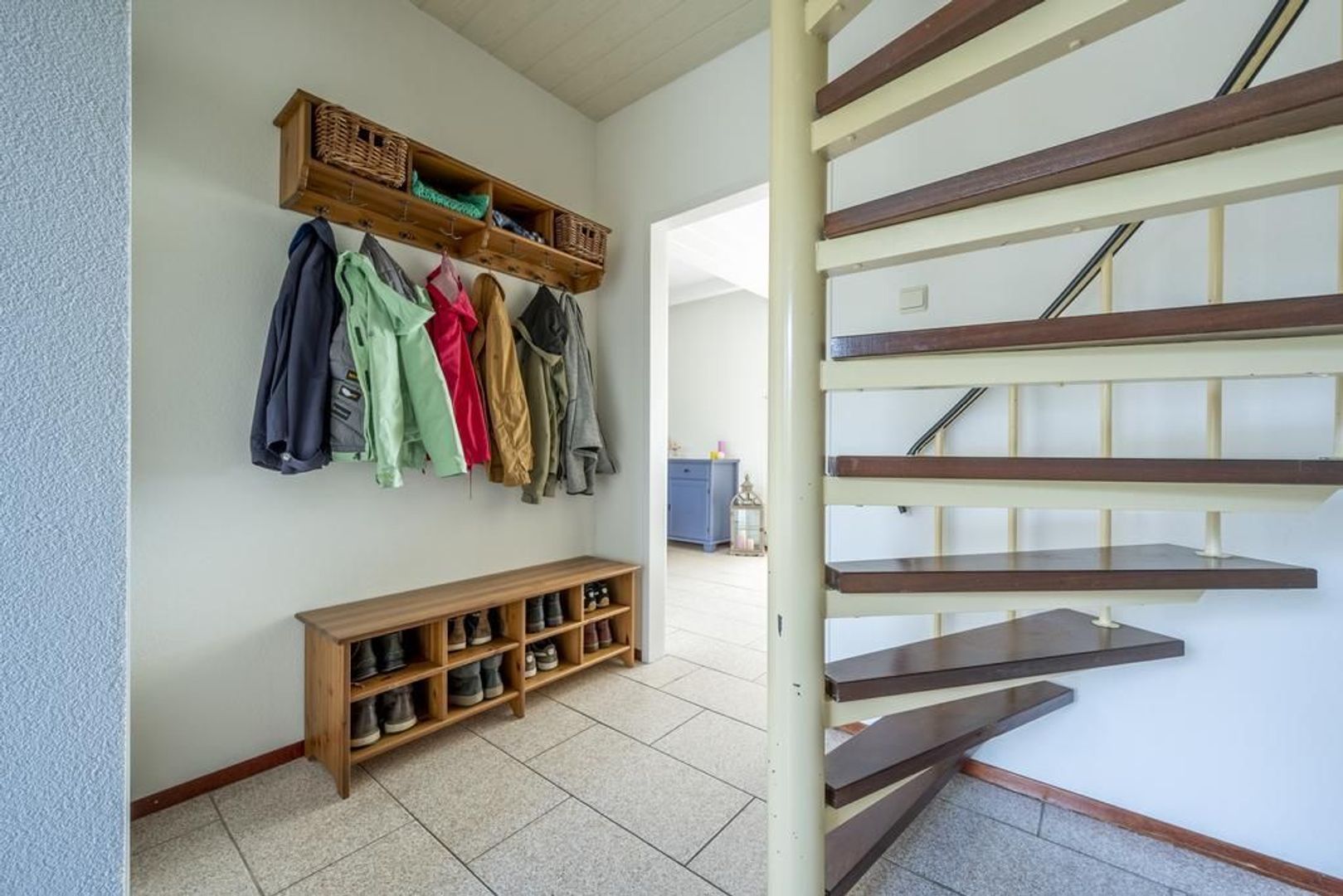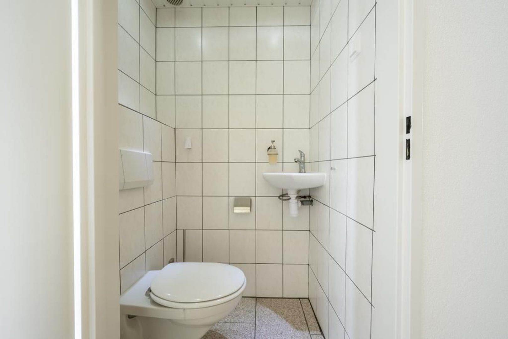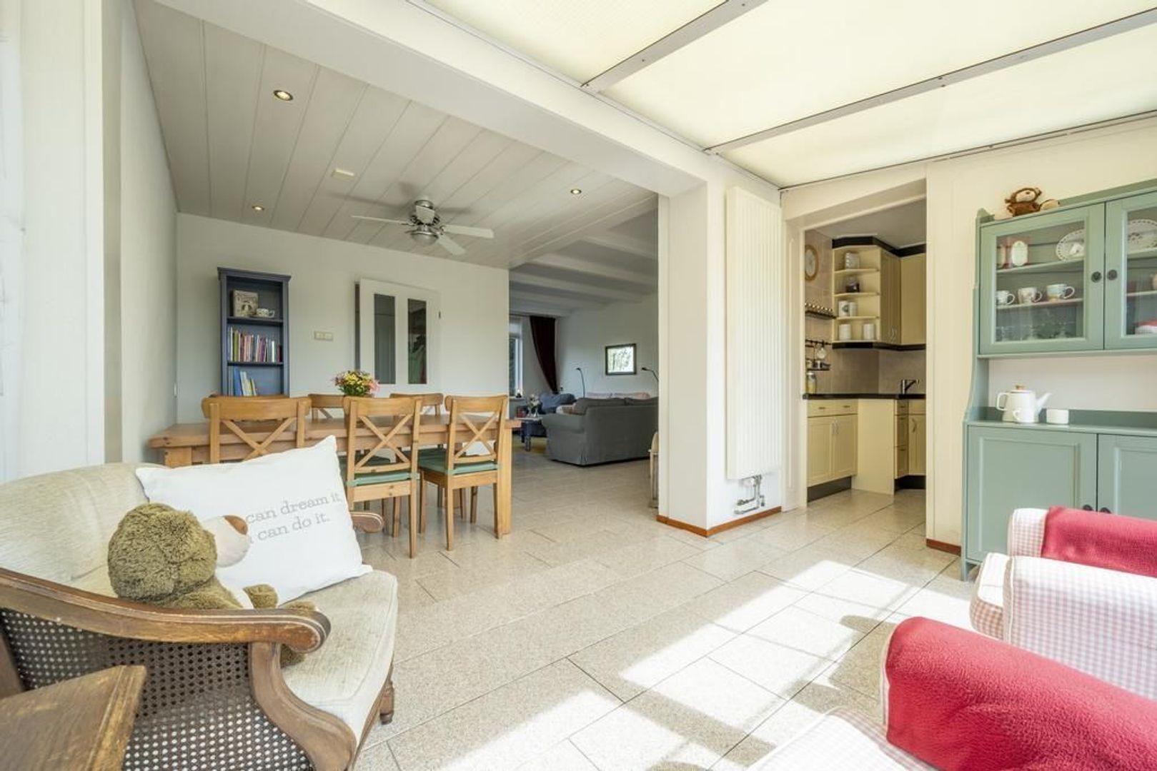 De vloer is afgewerkt met plavuizen en de wanden met structuurverf.