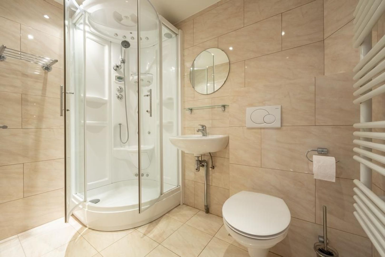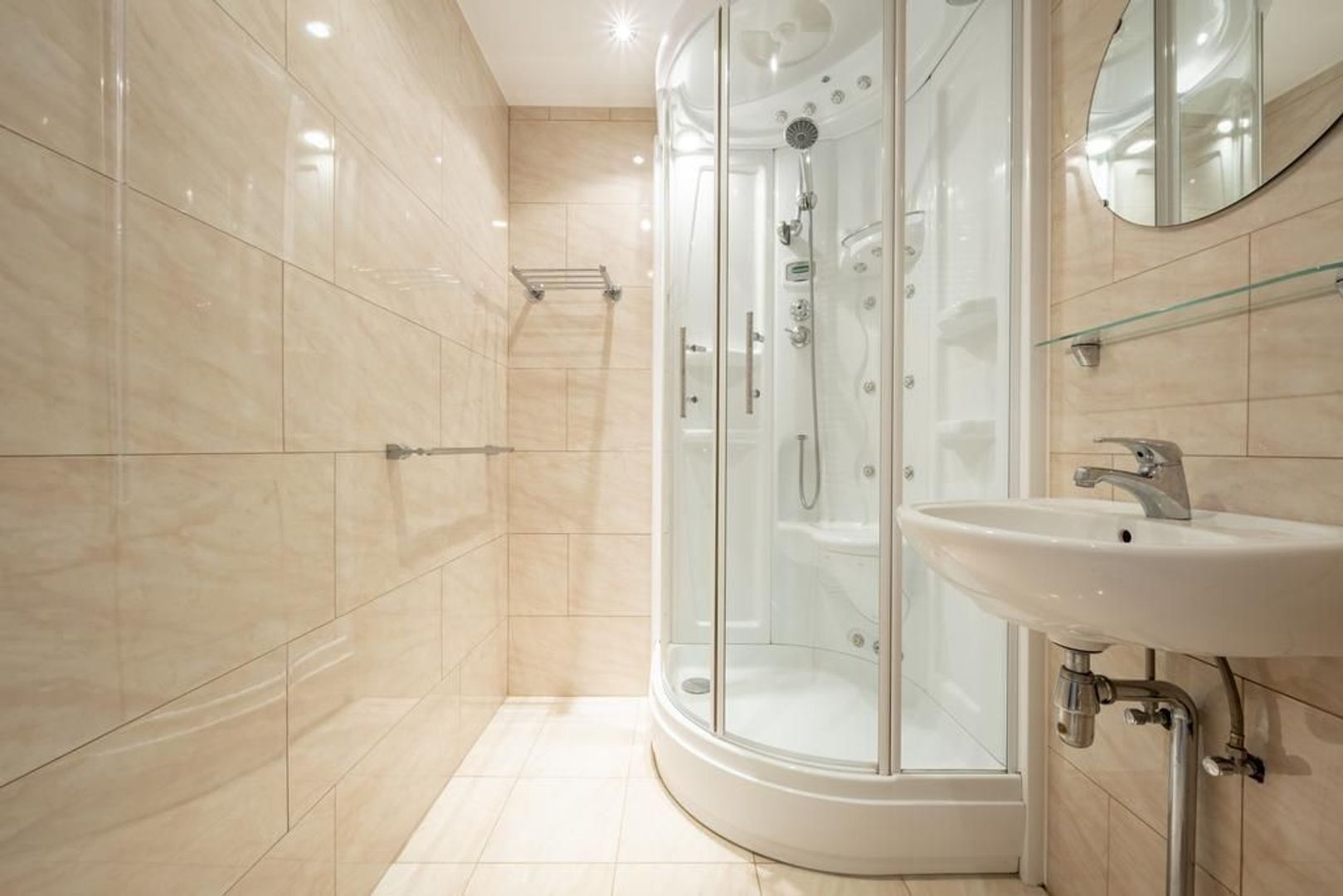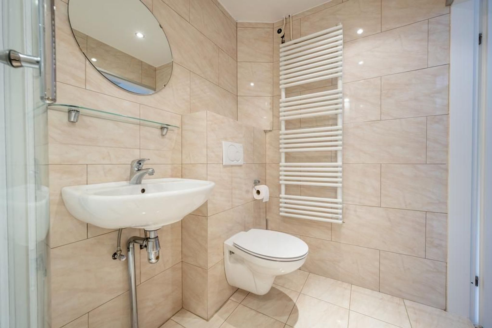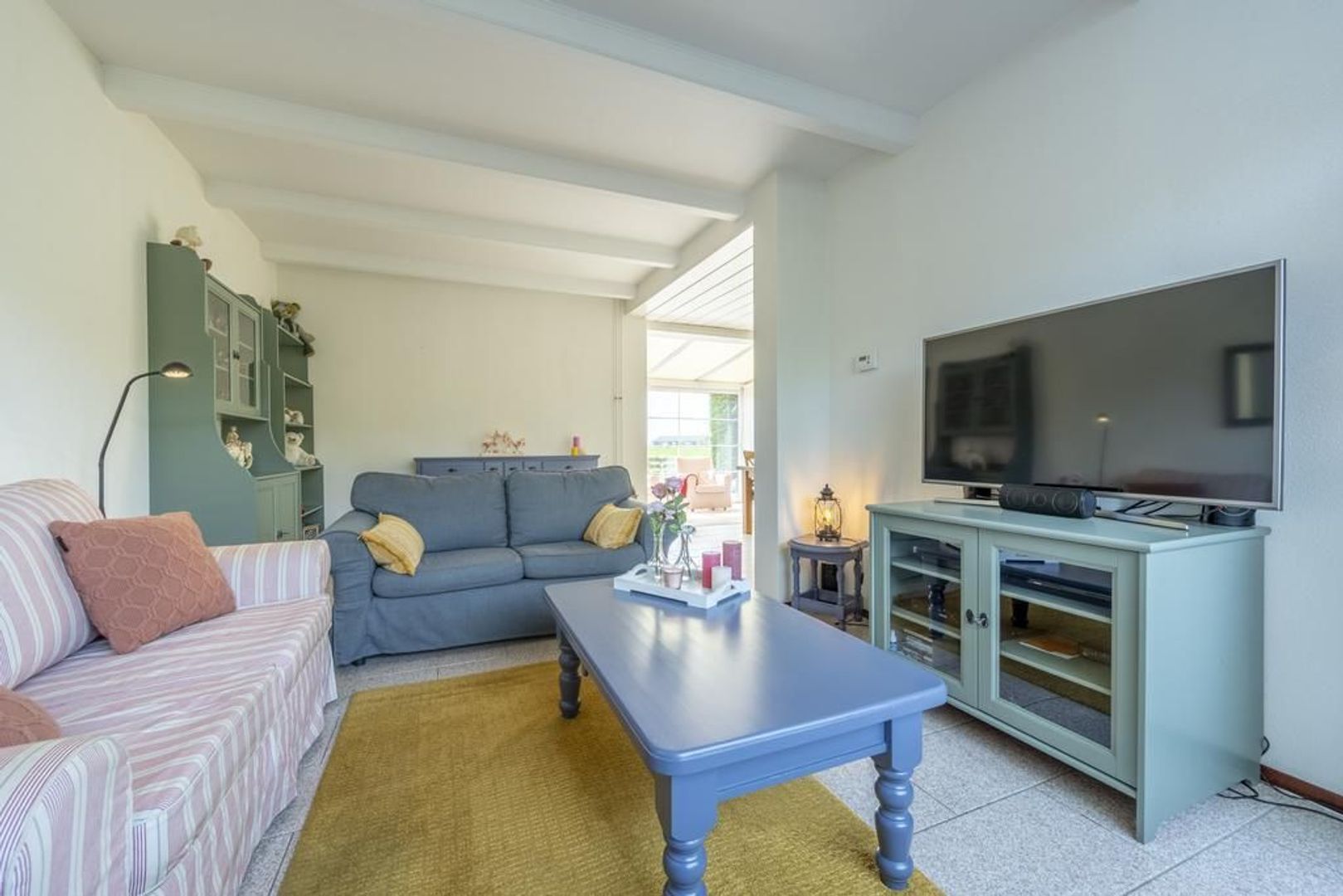 De vloer is afgewerkt met plavuizen en de wanden met structuurverf.