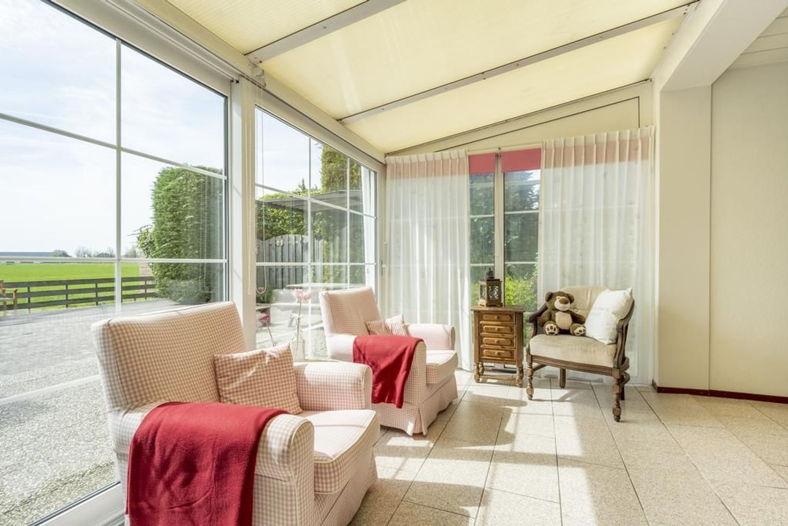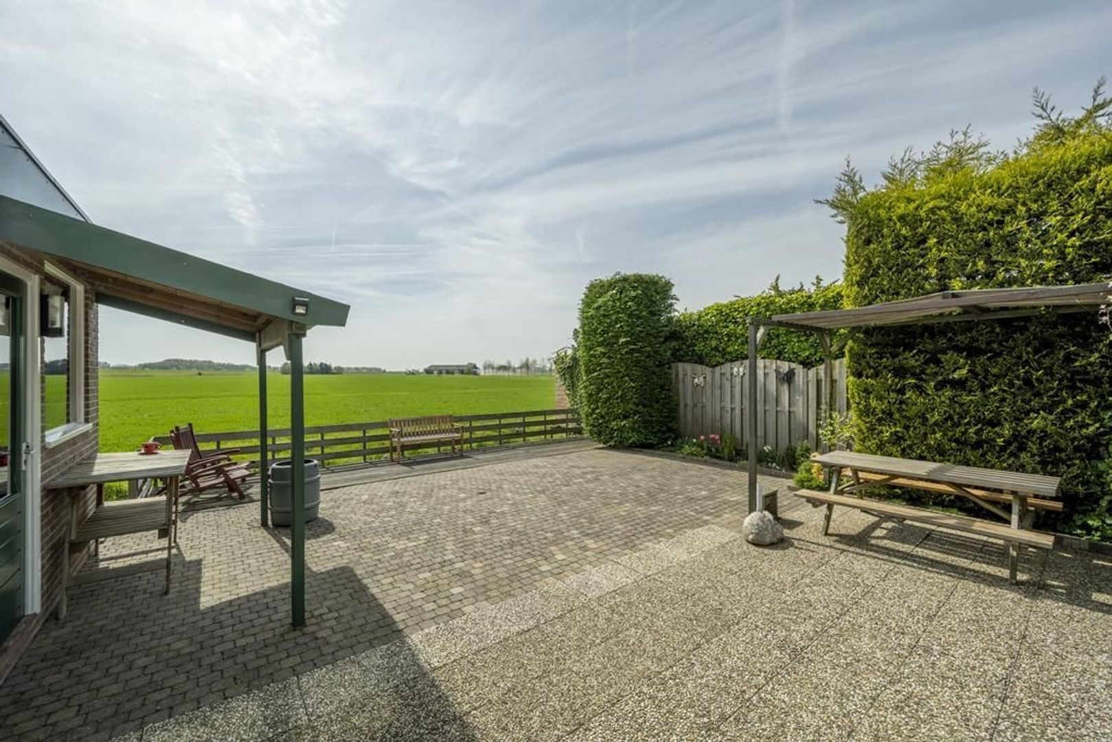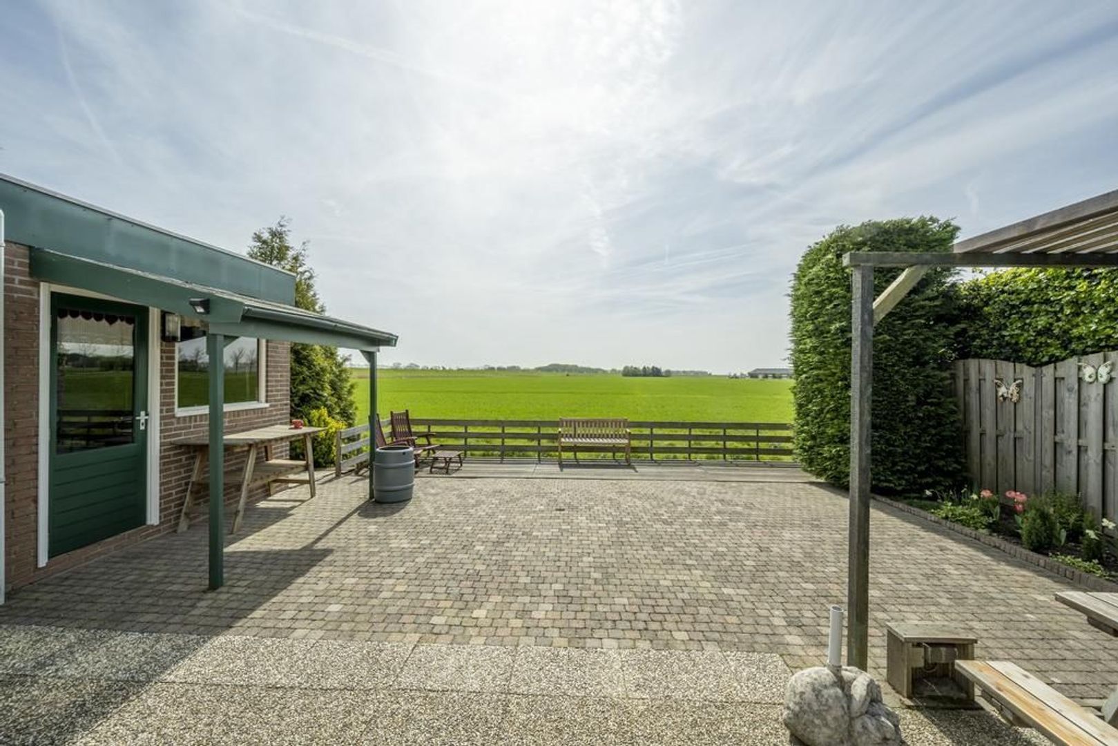De tuin grenst aan agrarische grond. In elk seizoen is het hier genieten van het veranderende uitzicht.