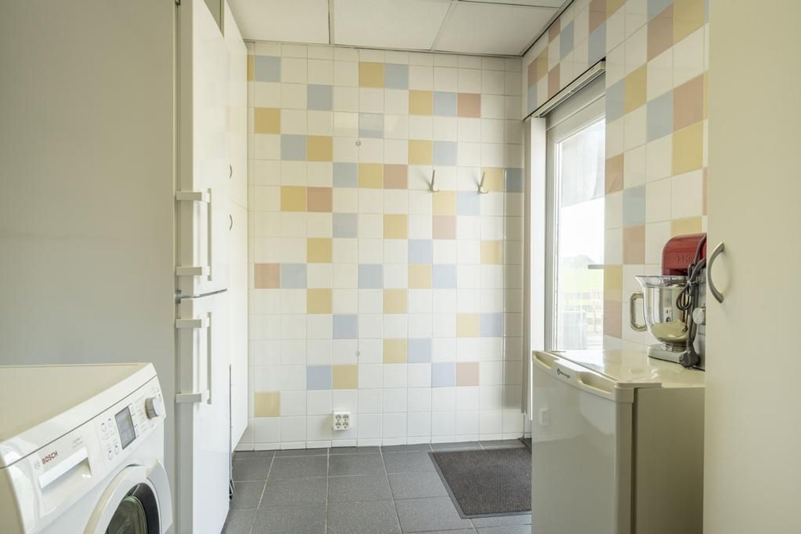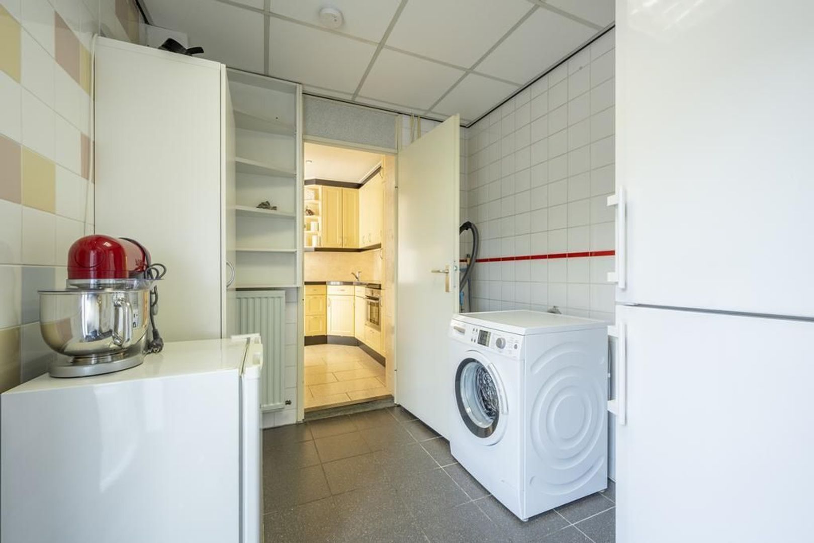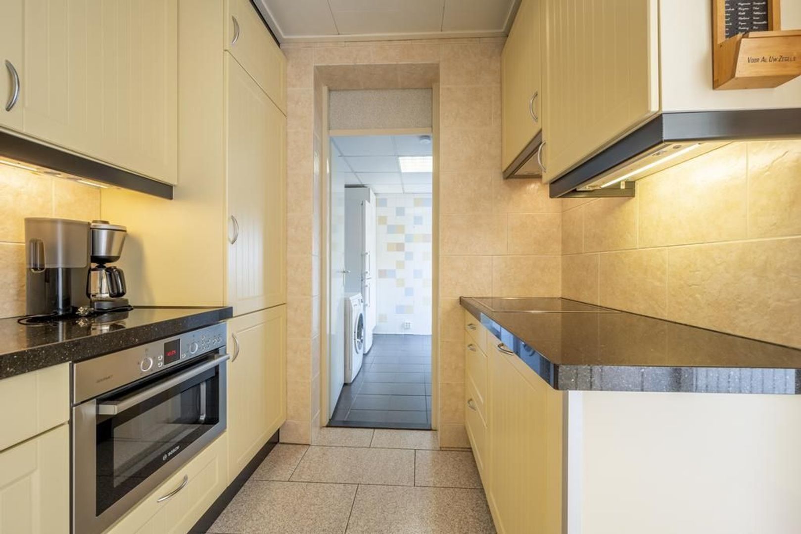 De dichte keuken is voorzien van een vierpits keramische kookplaat, afzuigkap, combi-magnetron en de vaatwasser. In de bijkeuken is plaats voor de koel-vriescombinatie en de aansluitingen voor de wasapparatuur.