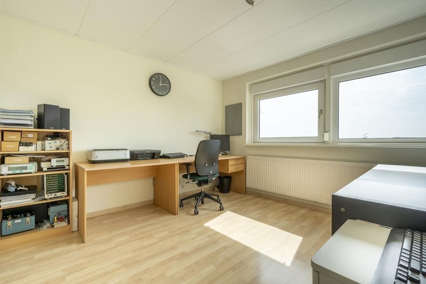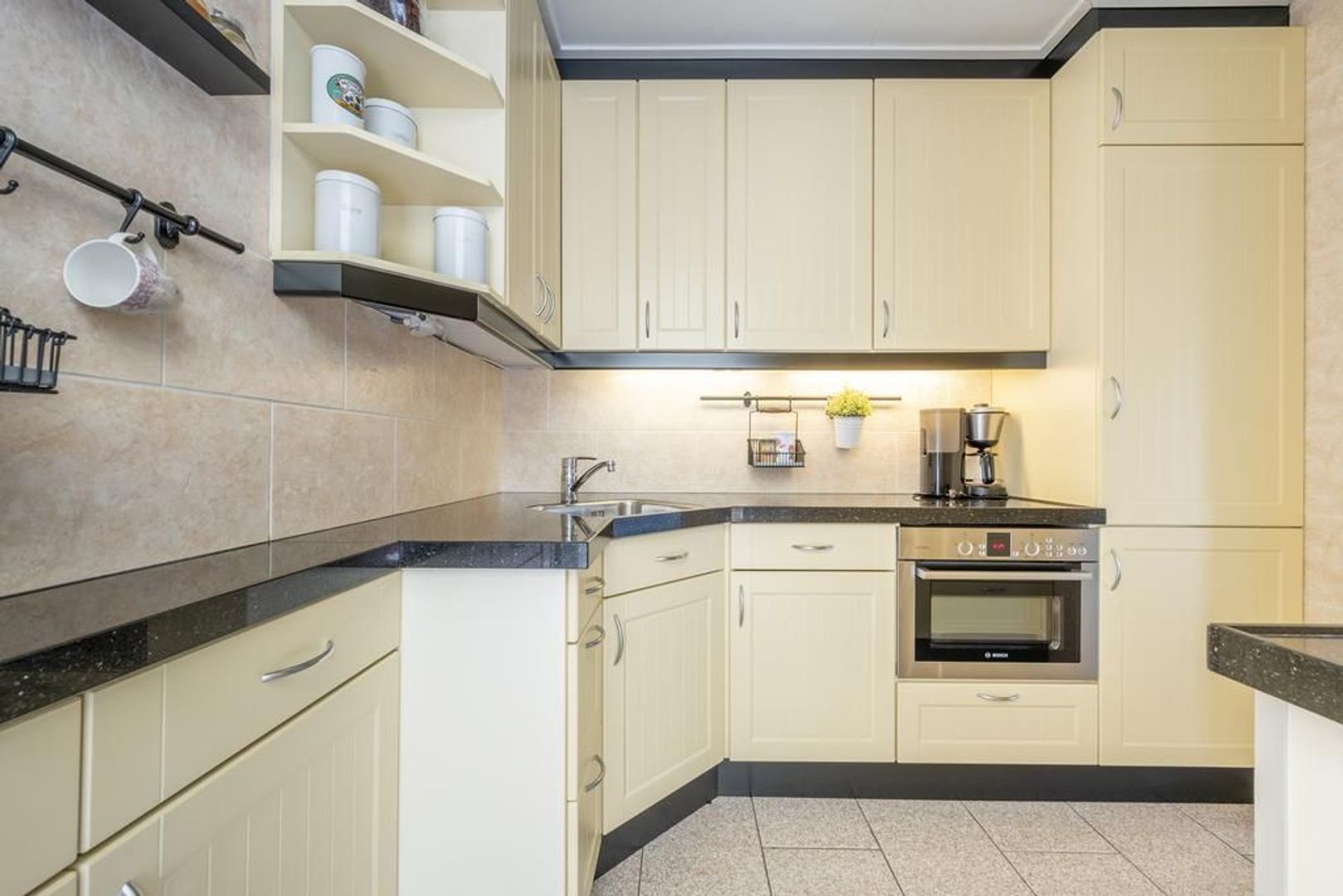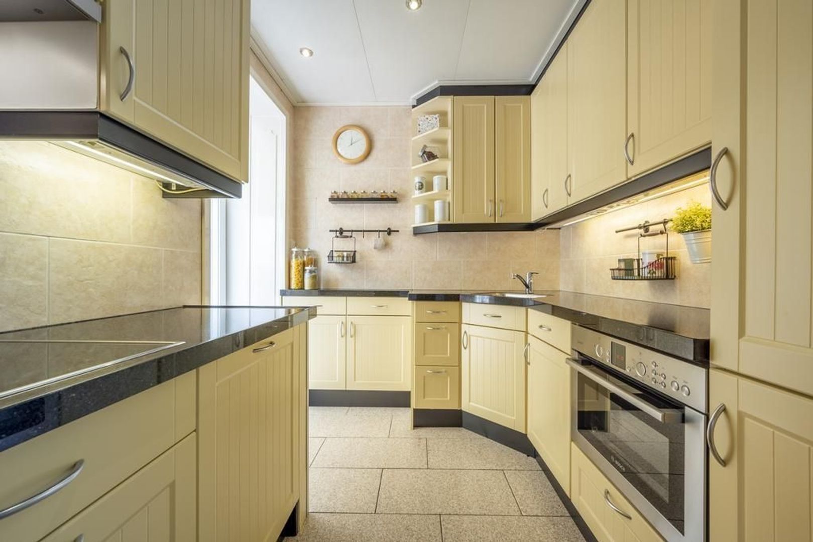 De dichte keuken is voorzien van een vierpits keramische kookplaat, afzuigkap, combi-magnetron en de vaatwasser. In de bijkeuken is plaats voor de koel-vriescombinatie en de aansluitingen voor de wasapparatuur.