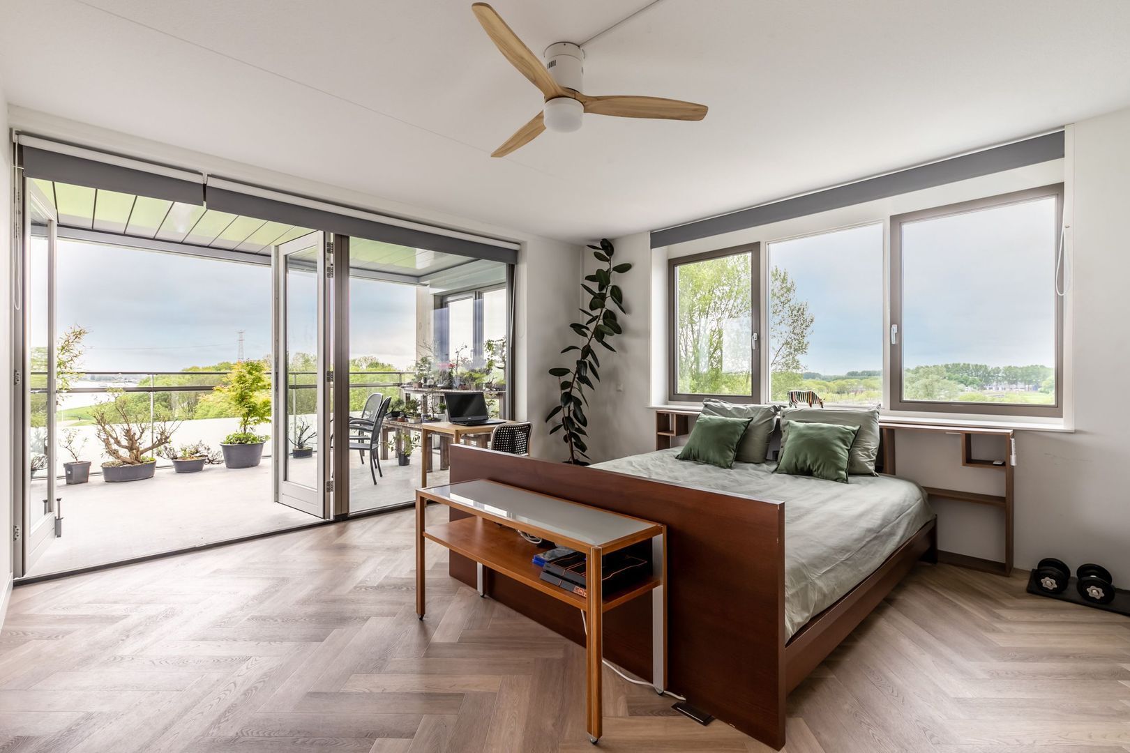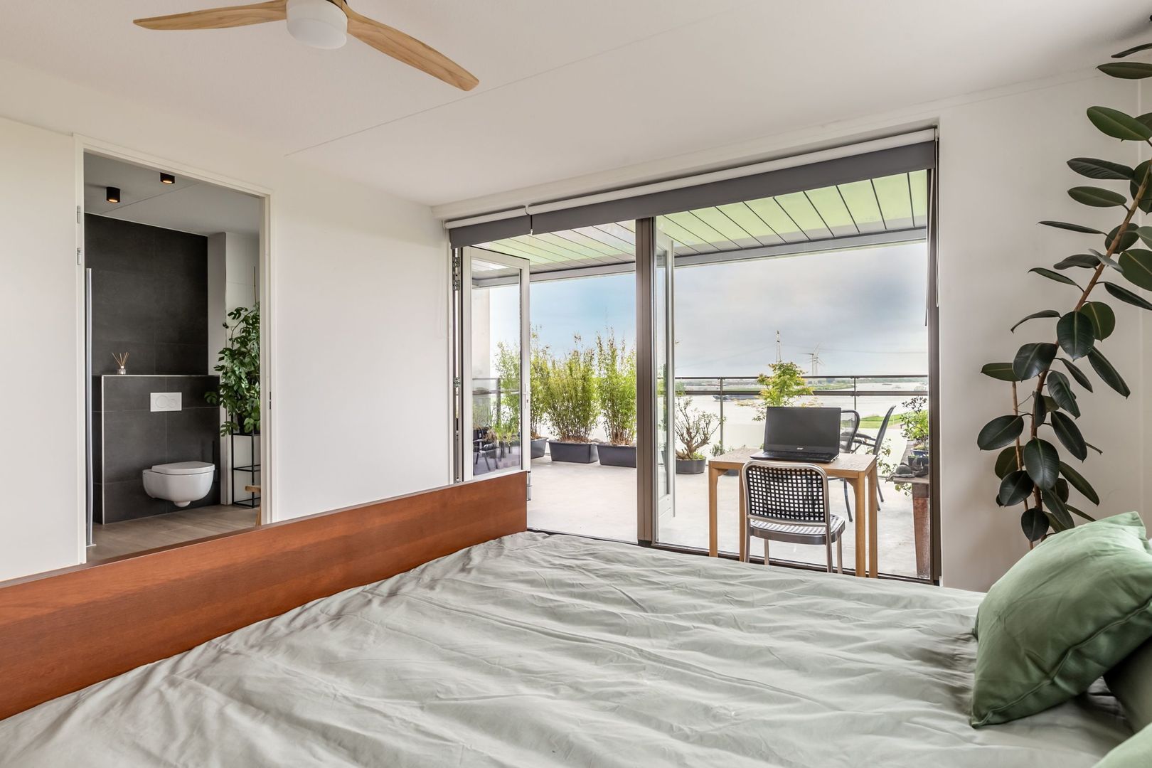 De grootste slaapkamer ligt aan de waterzijde en beschikt over een inpandige badkamer en openslaande deuren naar het tweede balkon. Dit is eveneens royaal van formaat. Wat een heerlijke plek om voor het naar bed gaan nog even van het uitzicht te genieten!