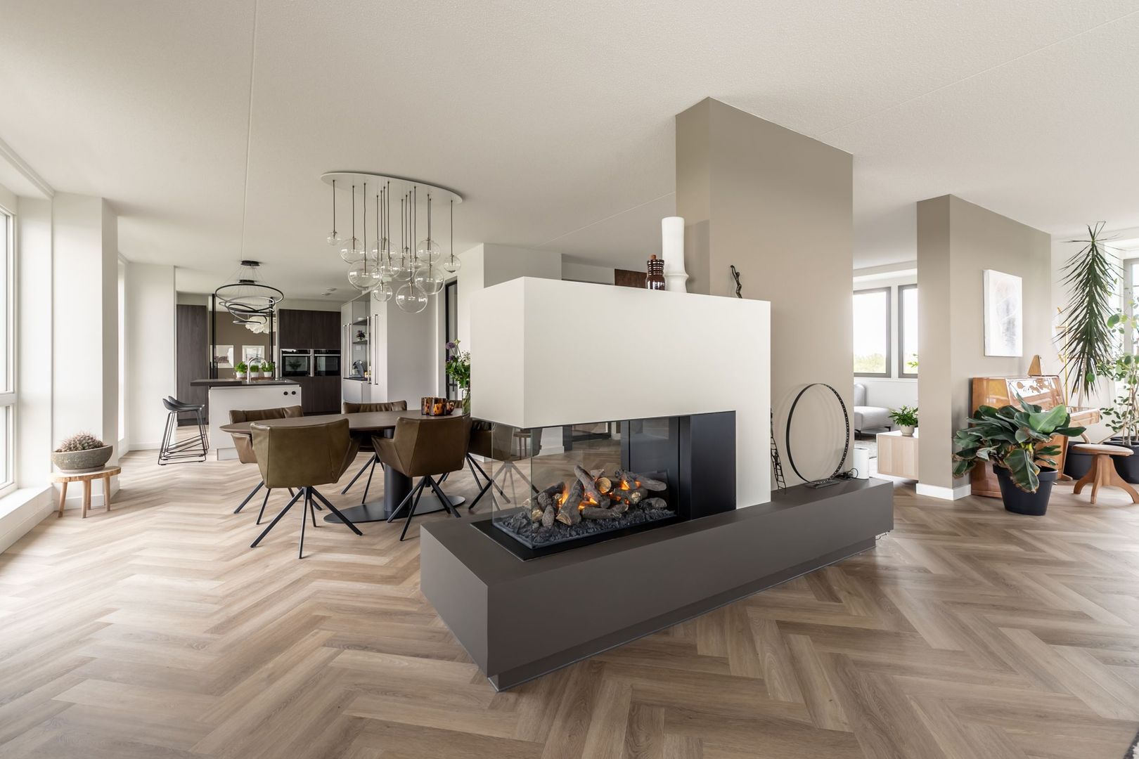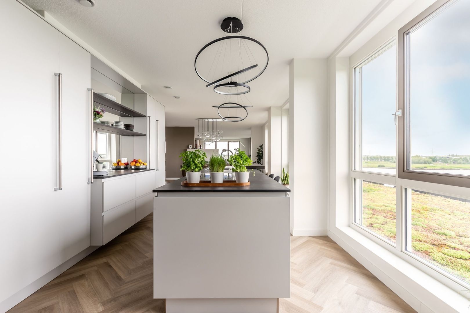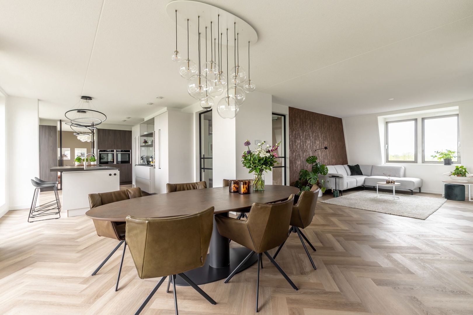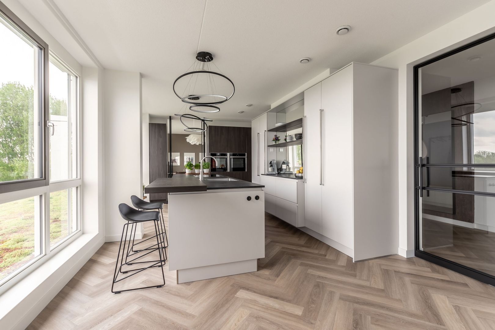 De afwerkingen zijn helemaal van deze tijd; een pvc vloer in visgraatmotief gelegd, een strakke greeploze keuken met eiland en twee badkamers in hotelchique-stijl.