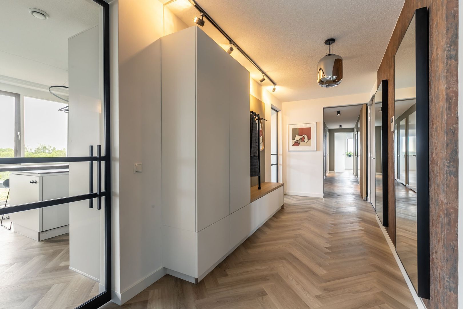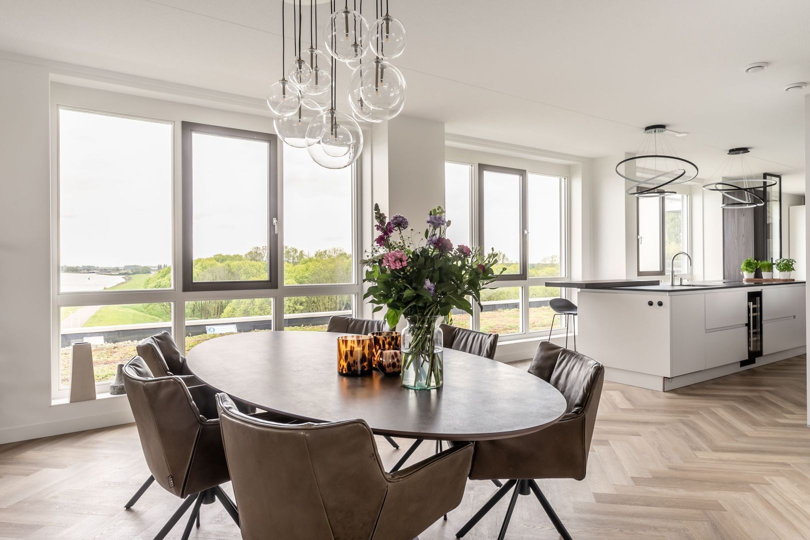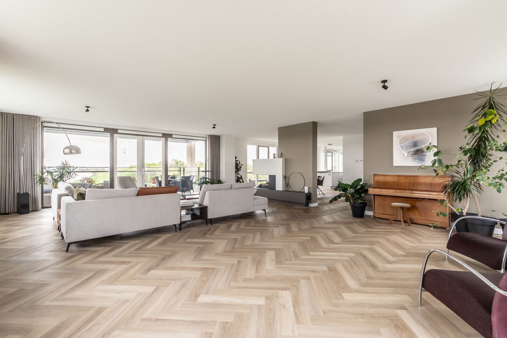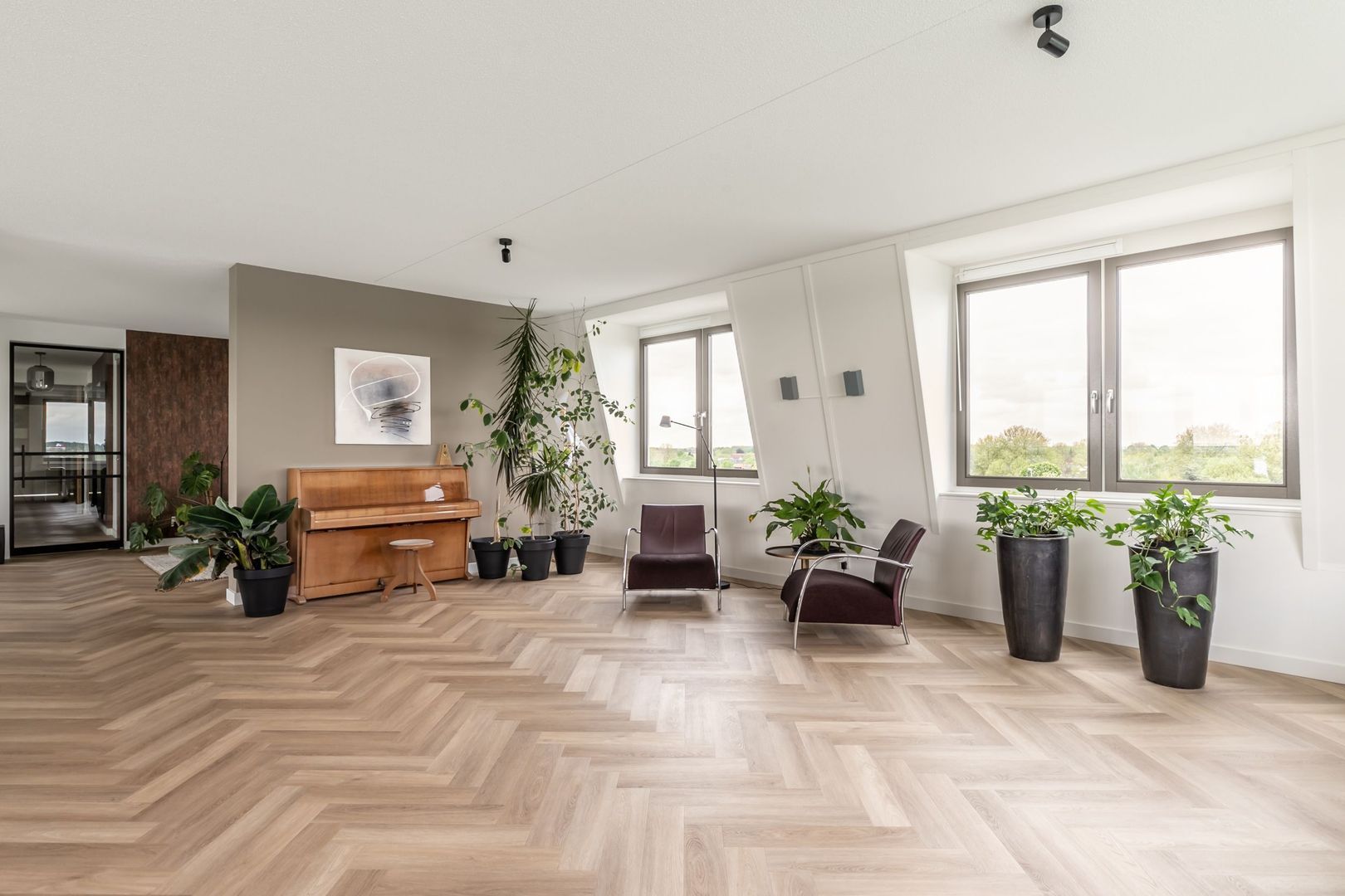 De afwerkingen zijn helemaal van deze tijd; een pvc vloer in visgraatmotief gelegd, een strakke greeploze keuken met eiland en twee badkamers in hotelchique-stijl.
