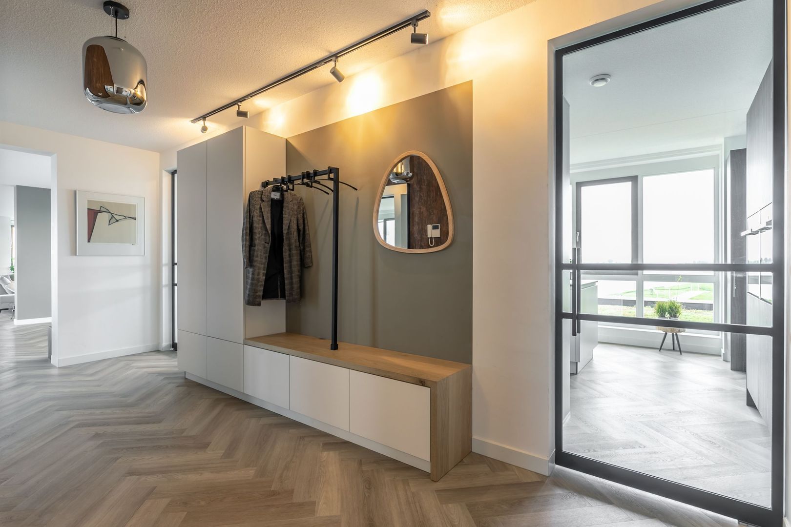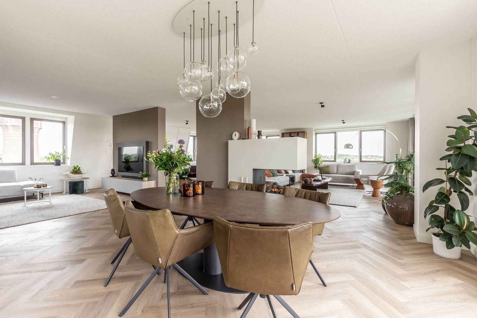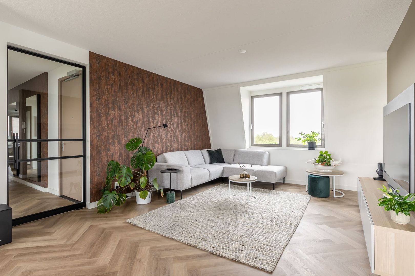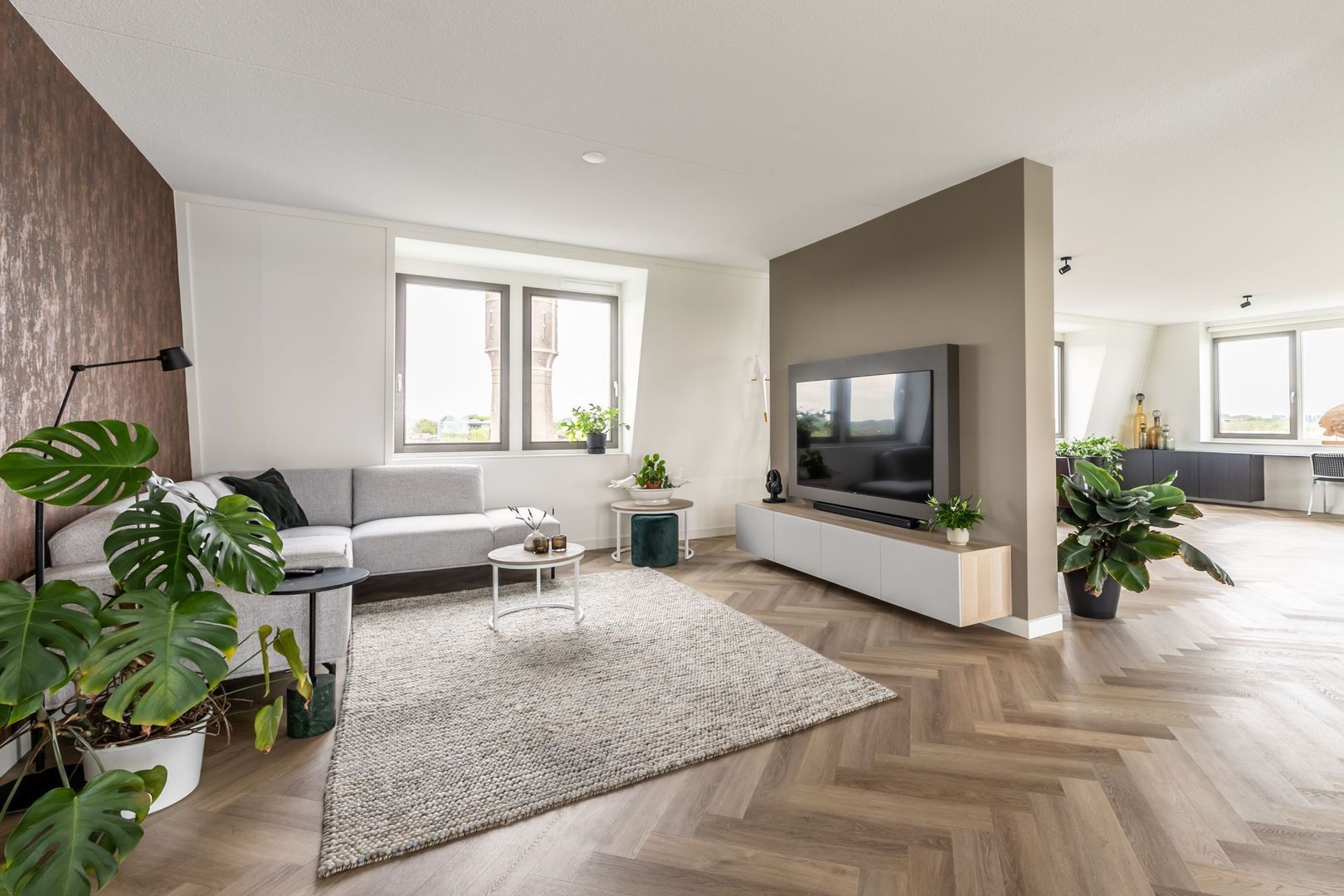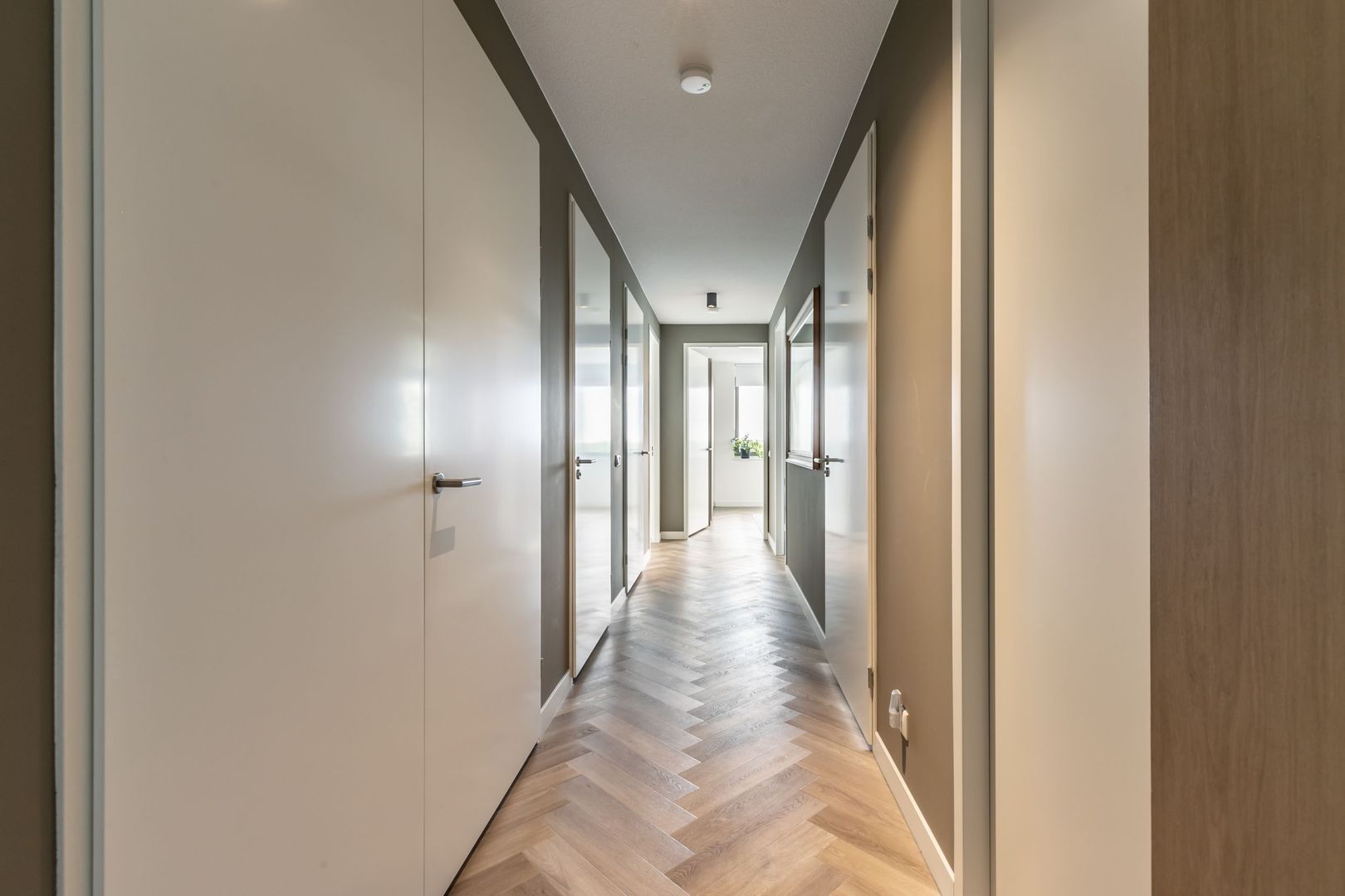 De afwerkingen zijn helemaal van deze tijd; een pvc vloer in visgraatmotief gelegd, een strakke greeploze keuken met eiland en twee badkamers in hotelchique-stijl.