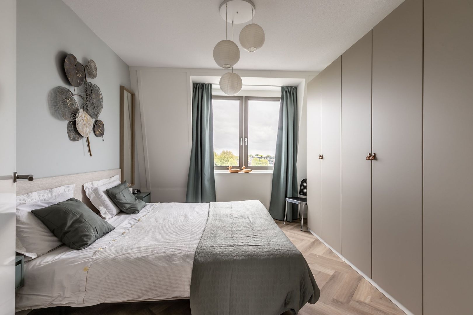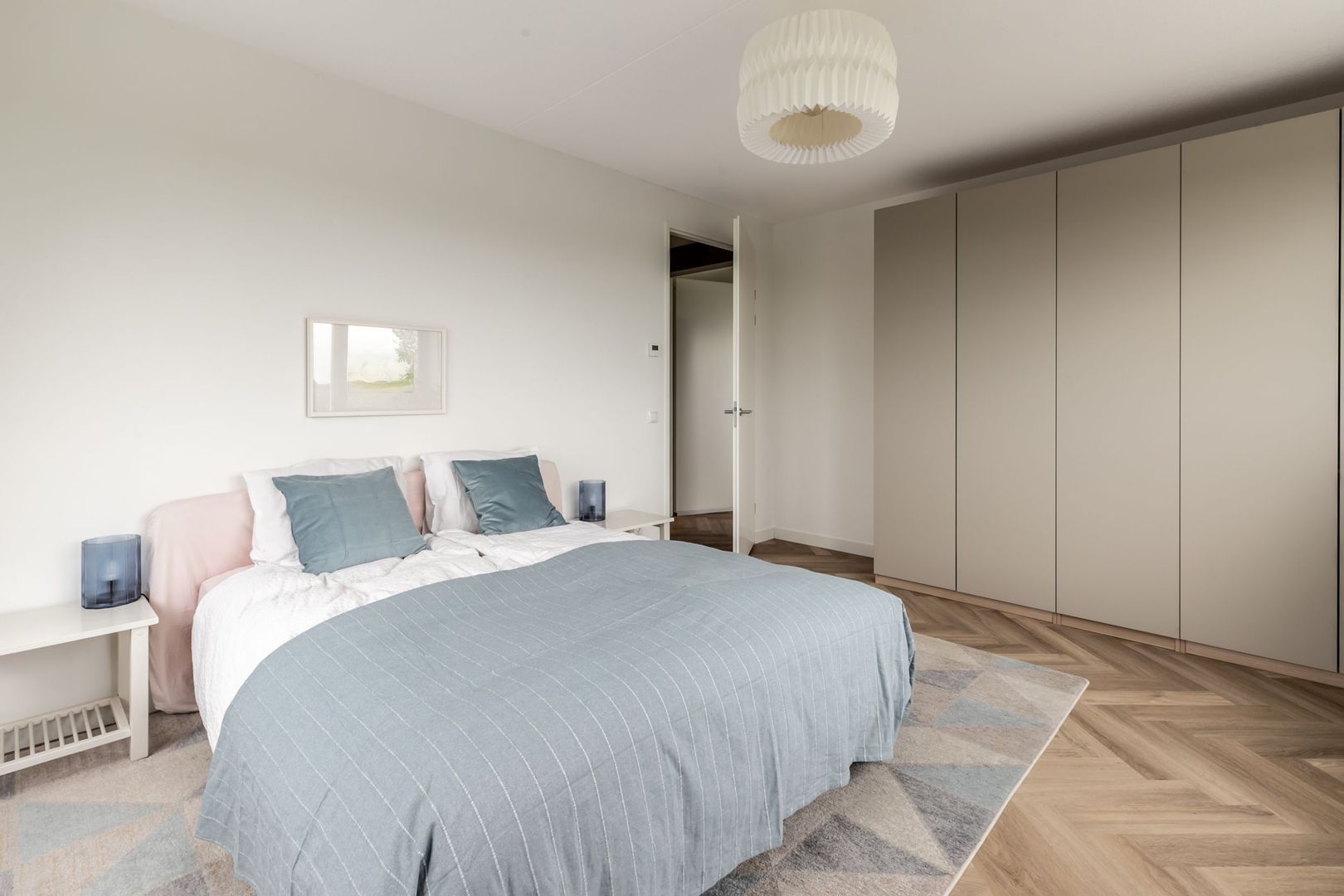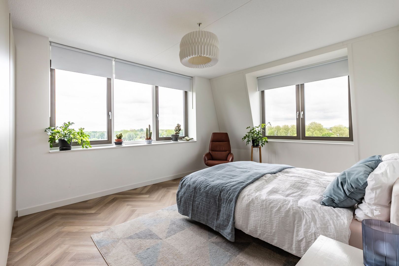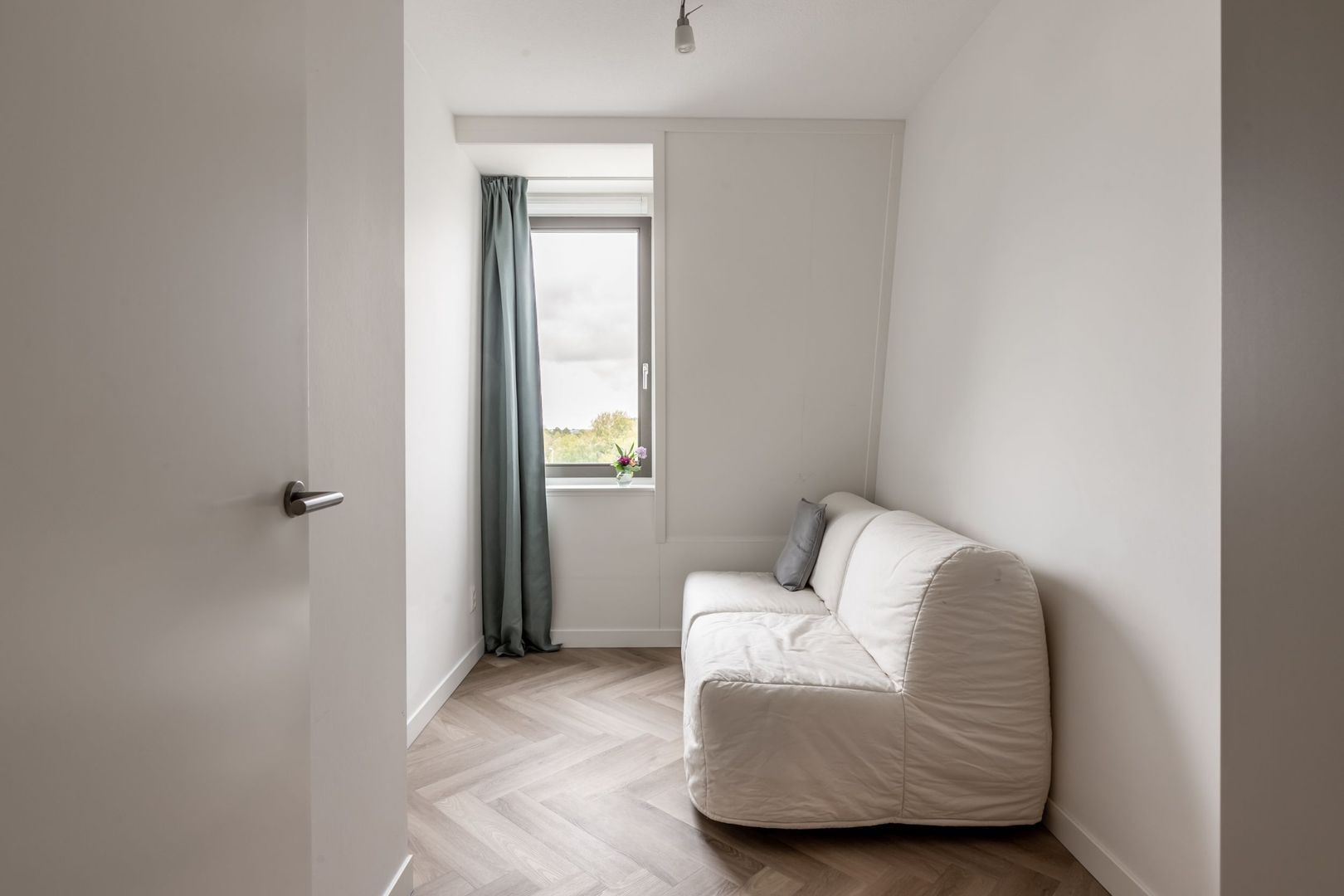 De afwerkingen zijn helemaal van deze tijd; een pvc vloer in visgraatmotief gelegd, een strakke greeploze keuken met eiland en twee badkamers in hotelchique-stijl.