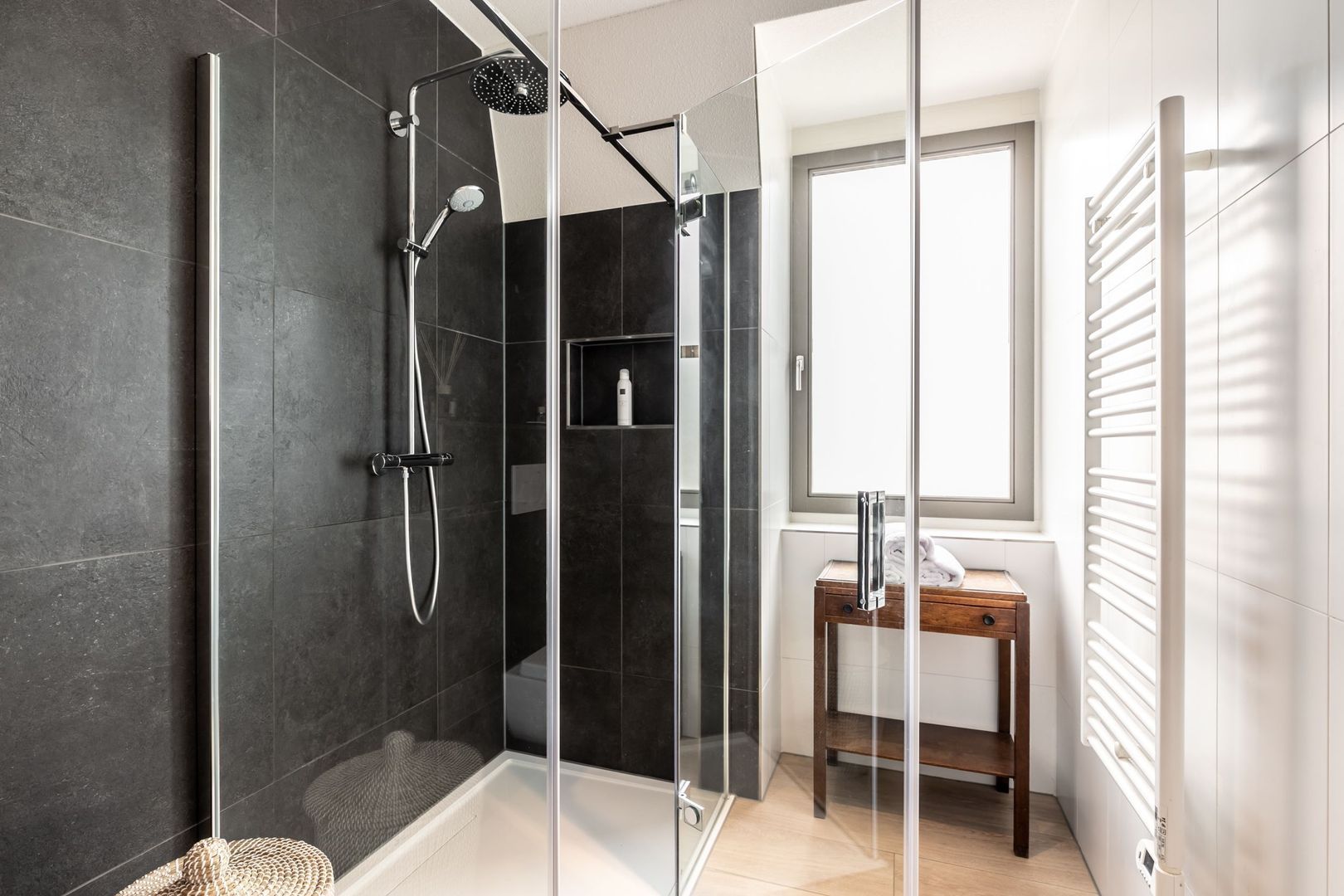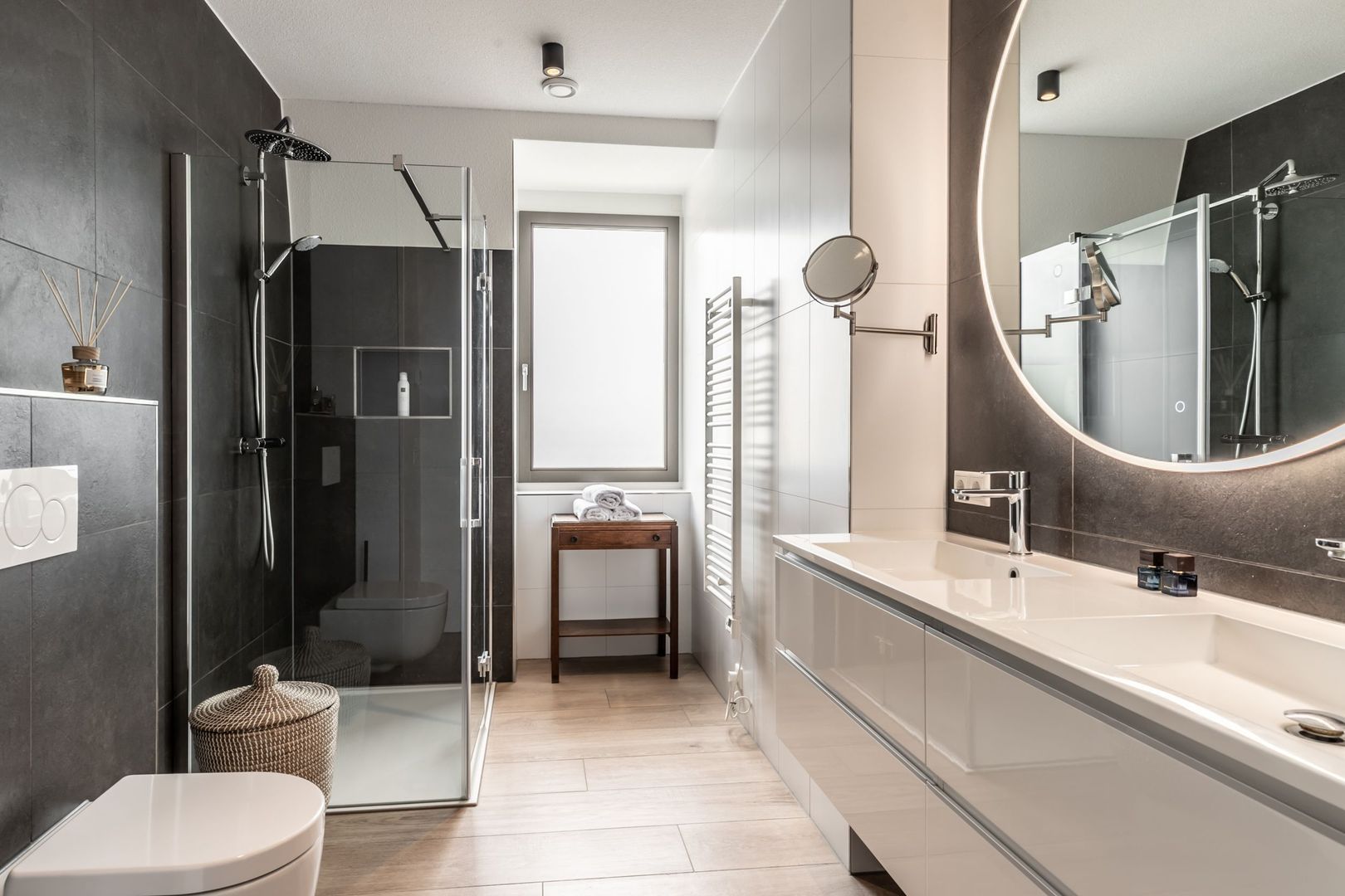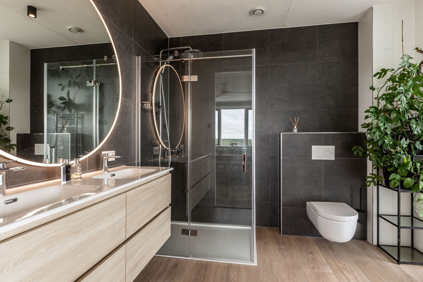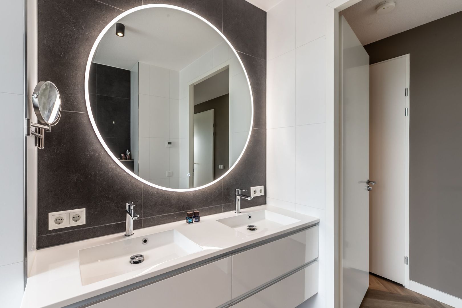 Beide badkamers zijn luxe en ingericht met een wastafelmeubel, een inloopdouche en wandtoilet. Mooie kranen, grote spiegels en fraai tegelwerk maken het beeld compleet.
