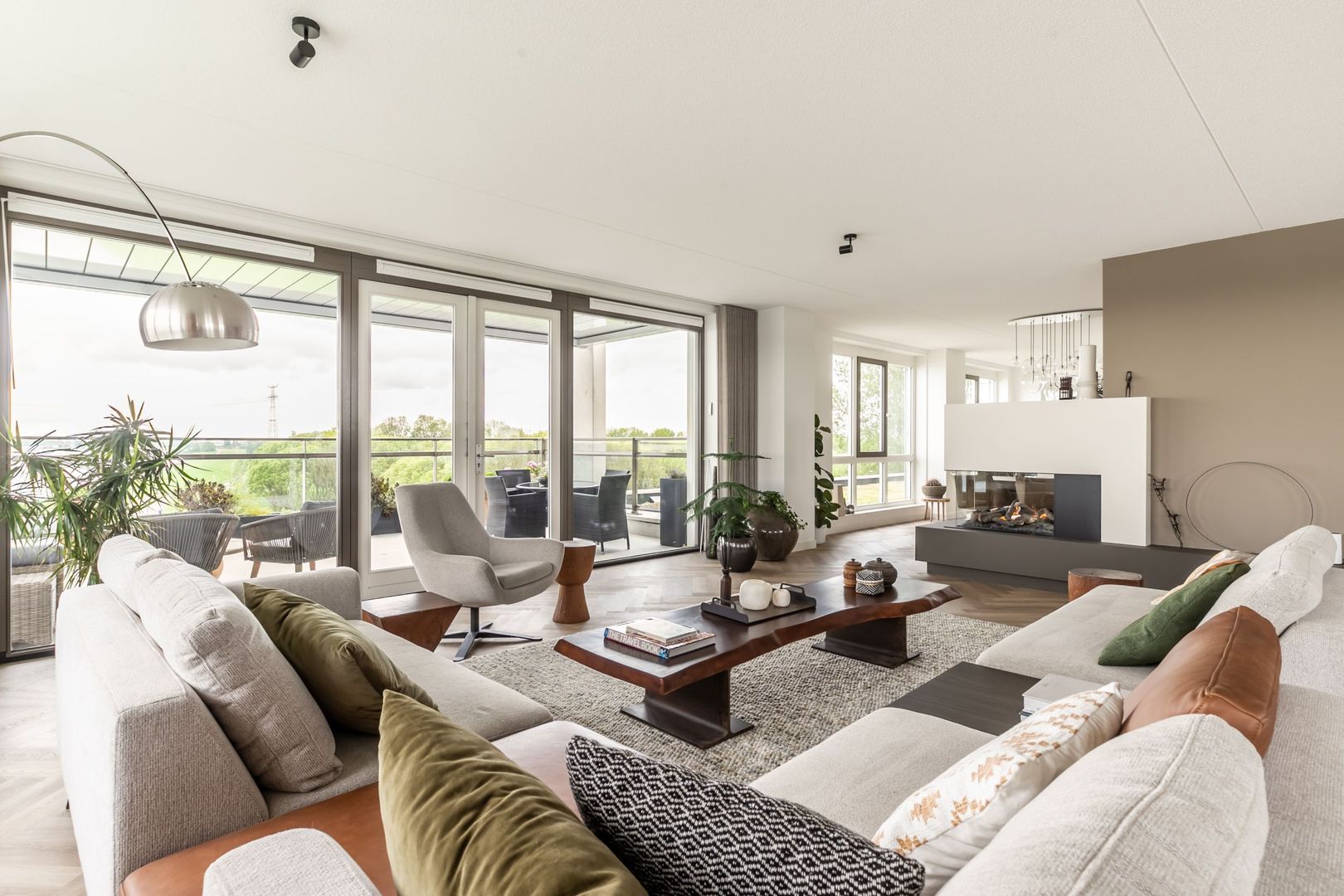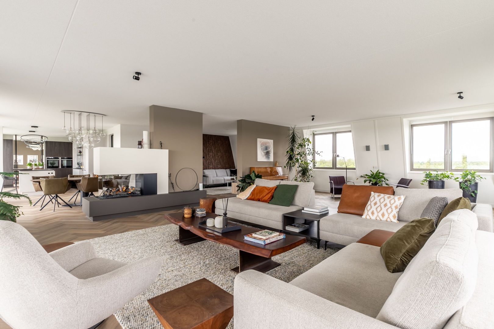 Via de entree geeft de centrale hal toegang tot de keuken en de woonkamer. Deze heeft een gedeeltelijke scheidingswand met daaraan een fraaie doorkijkhaard. Grote ramen en openslaande deuren zorgen voor een weids uitzicht en verbinding met het oer-Hollandse landschap buiten.