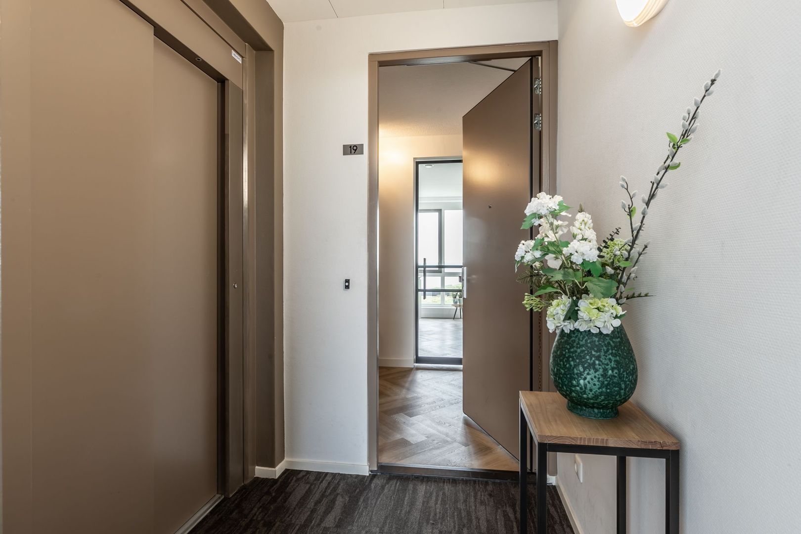 de lift (of de trap) leidt naar de zesde verdieping, die het volledige penthouse omvat.