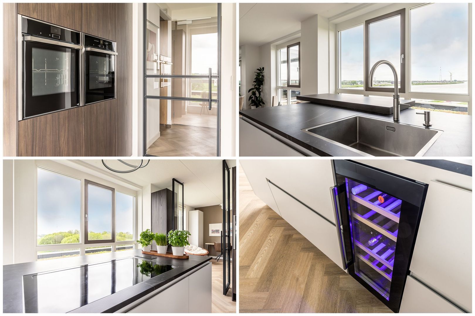 De open keuken, met keramisch aanrechtblad, is ingericht met uitgebreide wandkasten, een solitair eiland en uitgevoerd met luxe inbouwapparatuur, waaronder een stoomoven, wijnkoeler en Quooker.