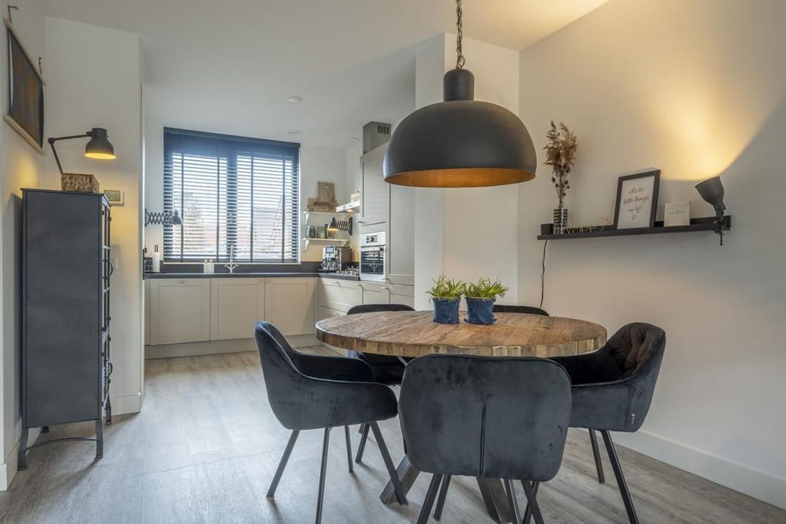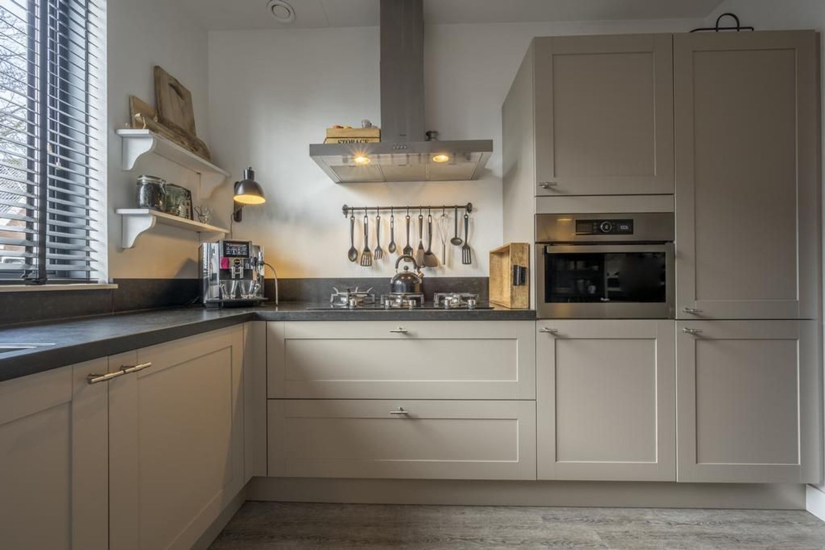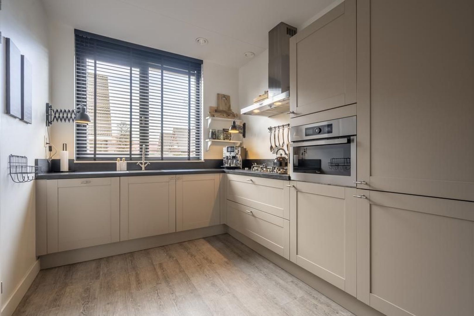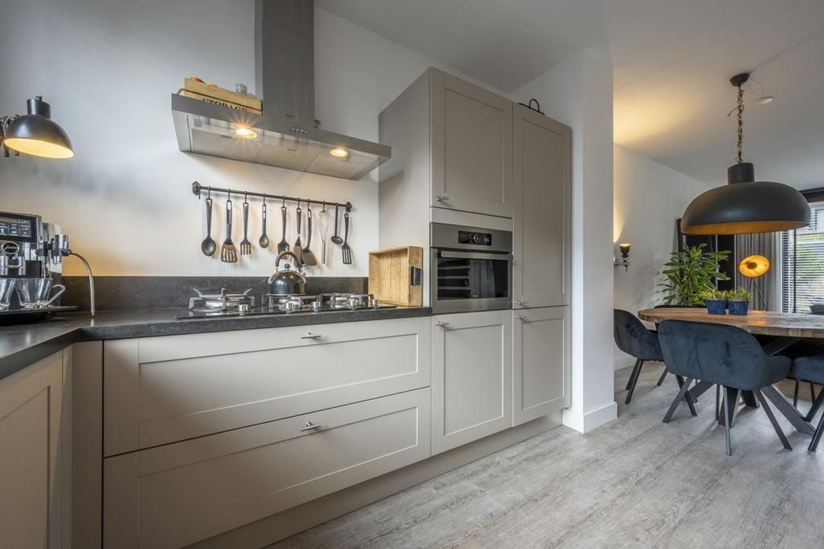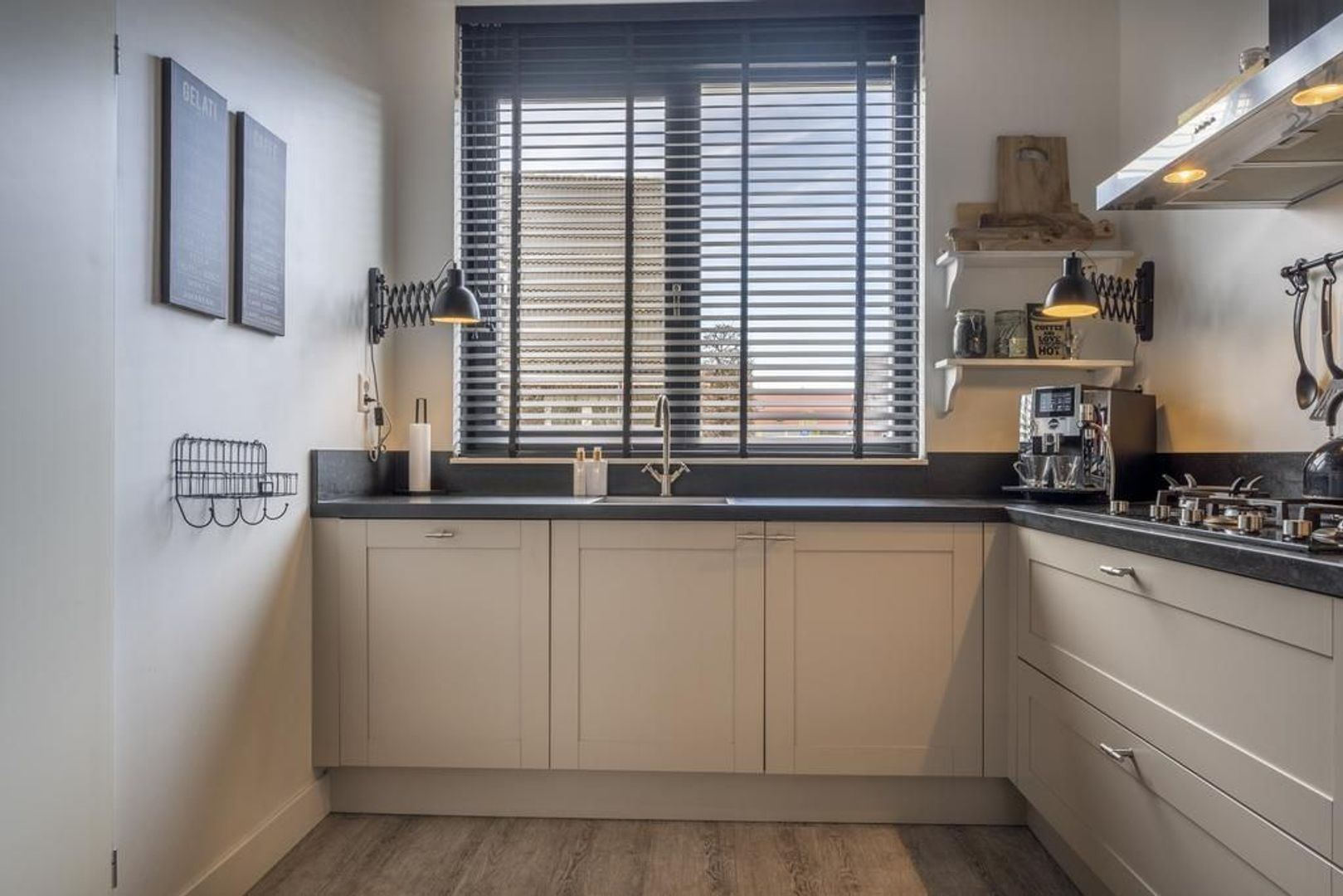 Luxe open keuken aan de straatkant, uitgevoerd met een L-vormige inrichting. Deze is voorzien van een koel-vriescombinatie, combi-magnetron, vijfpits gas-op-glas kookplaat, afzuigkap en vaatwasser.