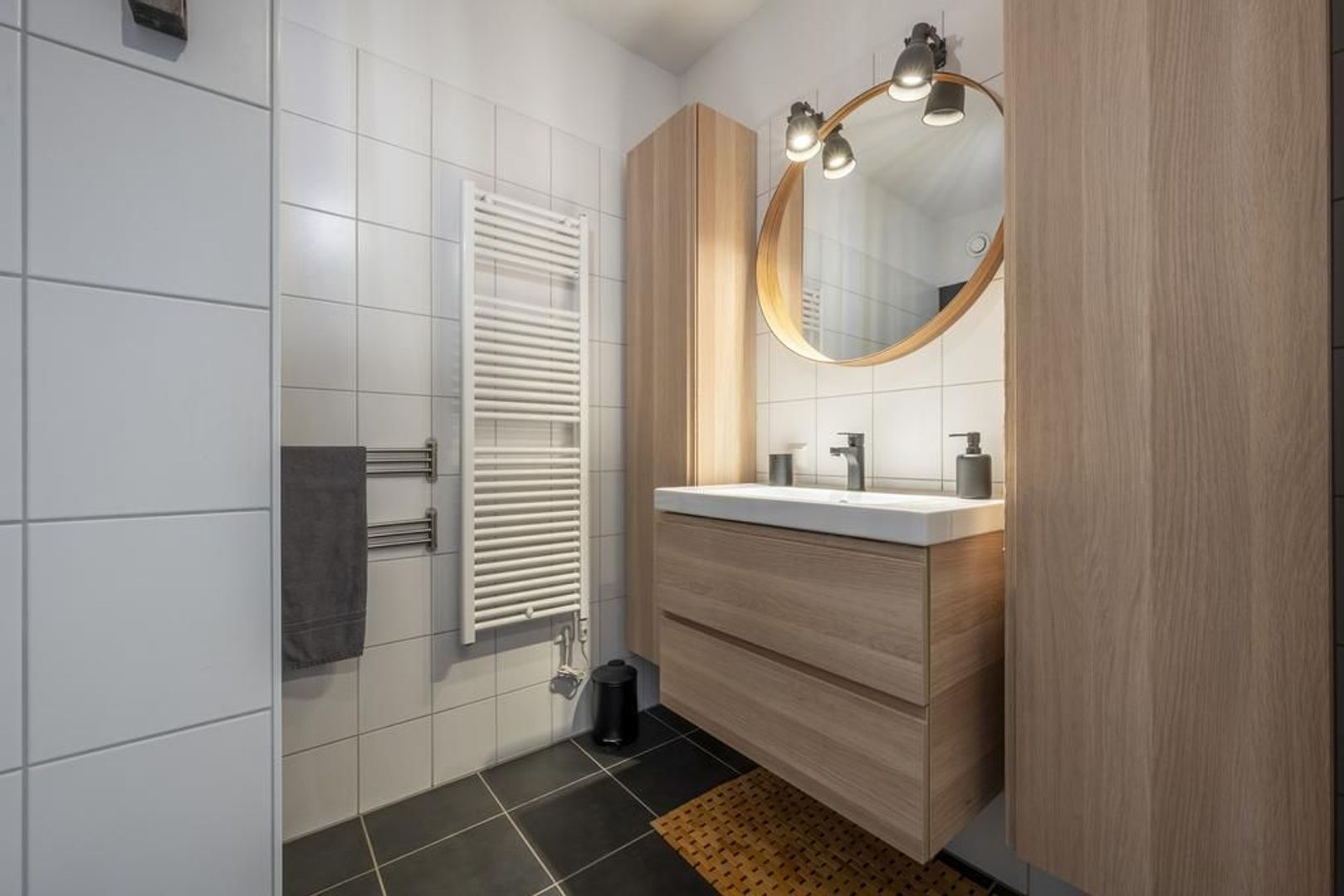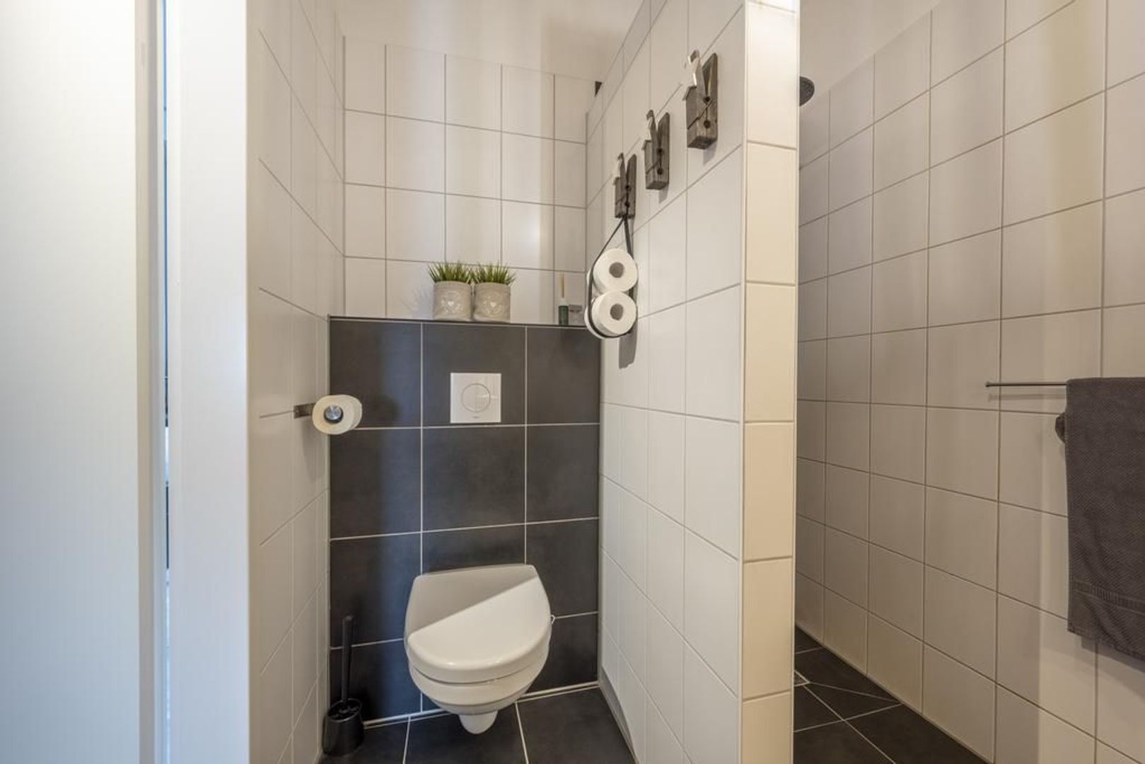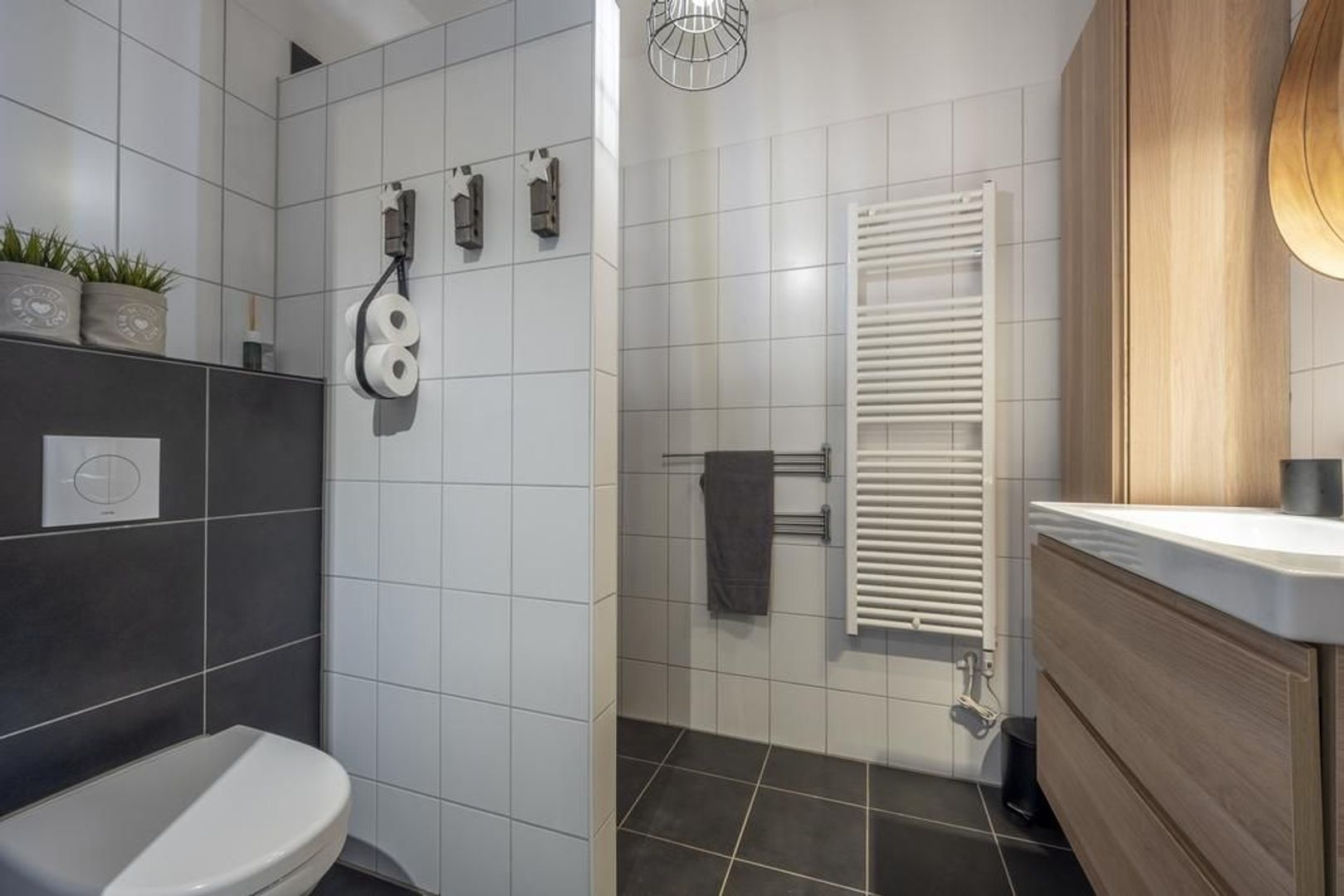 De moderne badkamer is ingericht met een inloopdouche, wastafelmeubel, tweede wandtoilet en een elektrische radiator. Ook hier is comfortabele vloerverwarming aanwezig.