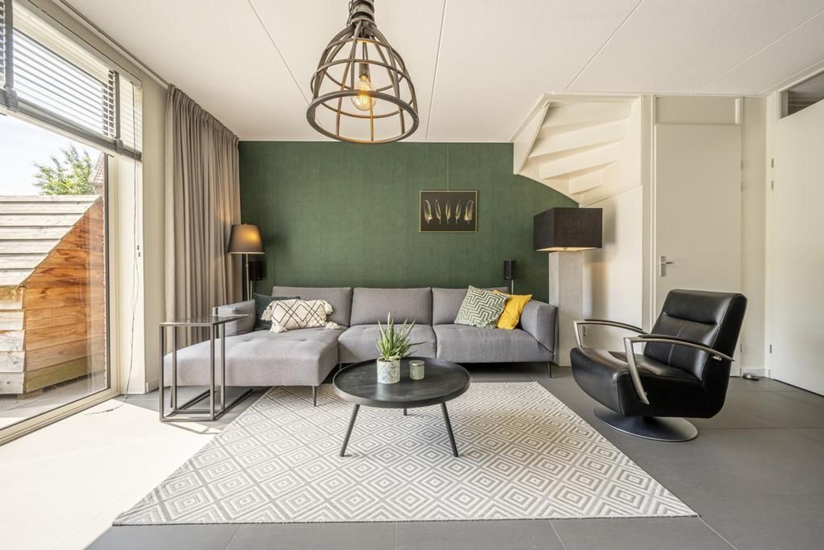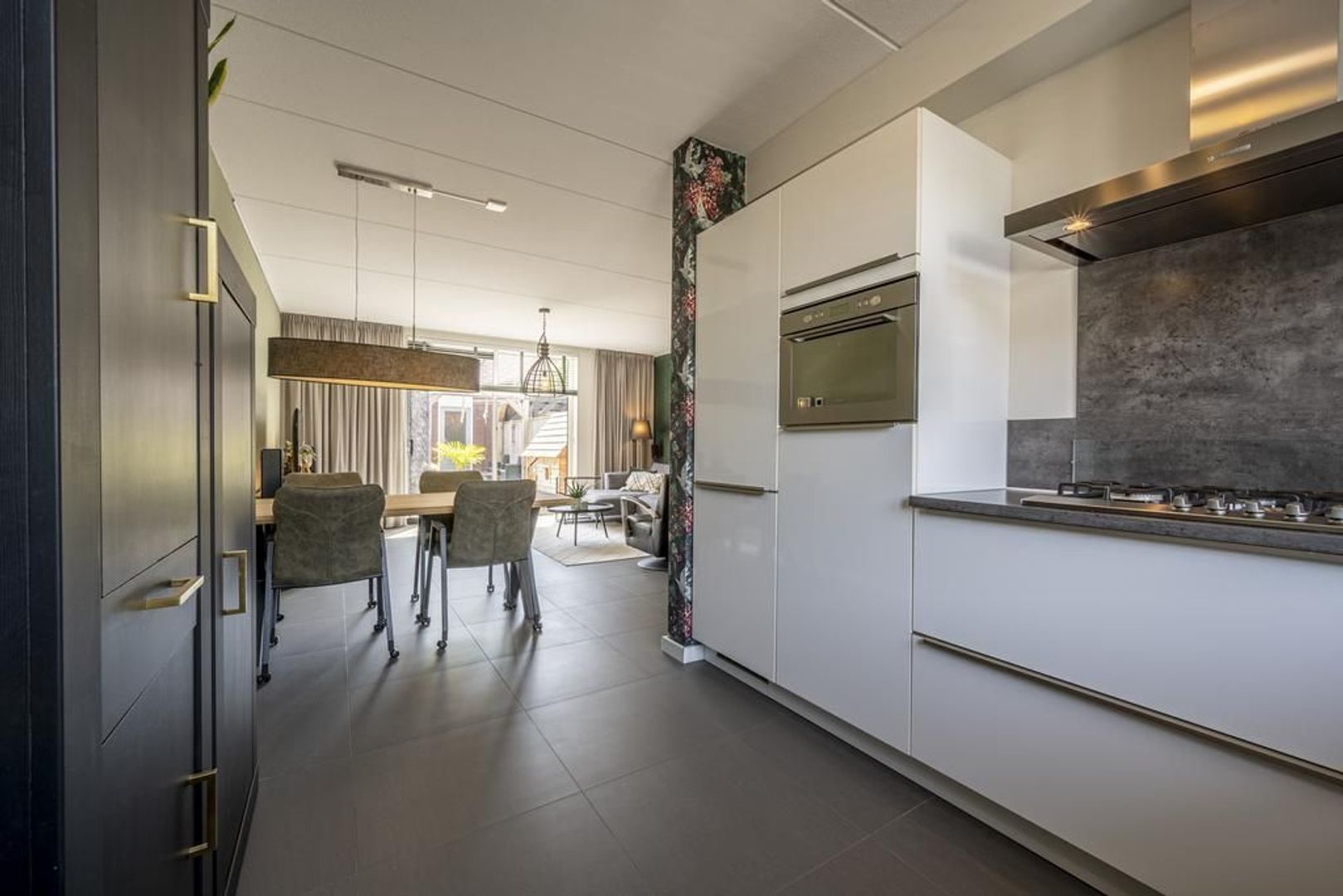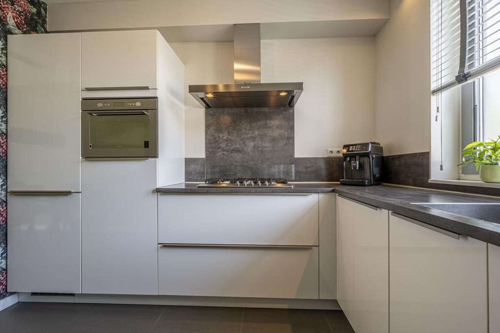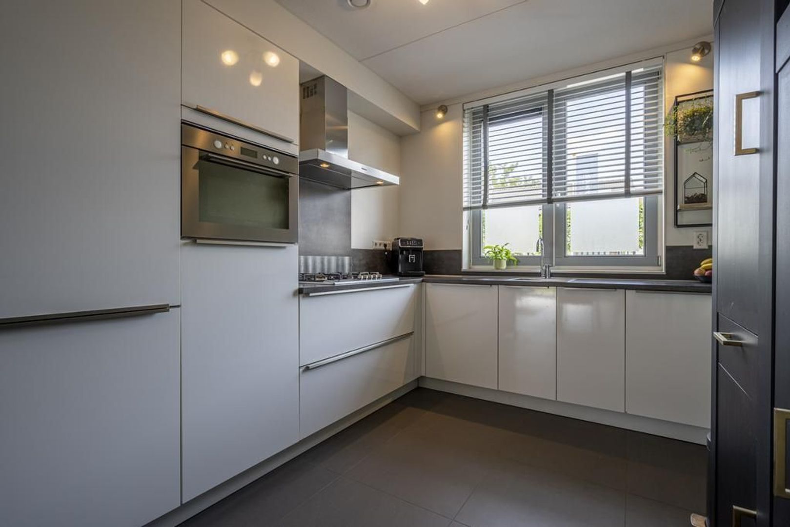Tuingerichte woonkamer met schuifpui en open keuken aan de straatkant. Deze heeft een L-vormige inrichting en is uitgevoerd met een 5-pits gaskookplaat, een combi-magnetron, koel-vriescombinatie, afzuigkap en vaatwasser.