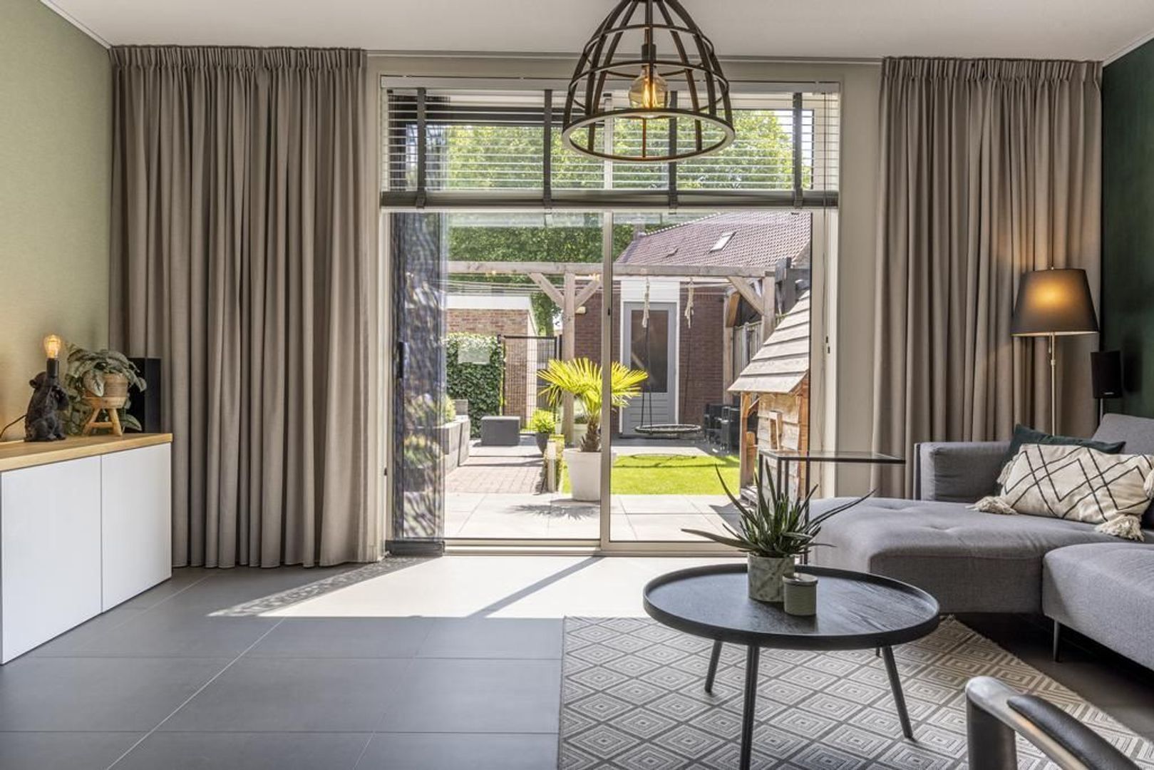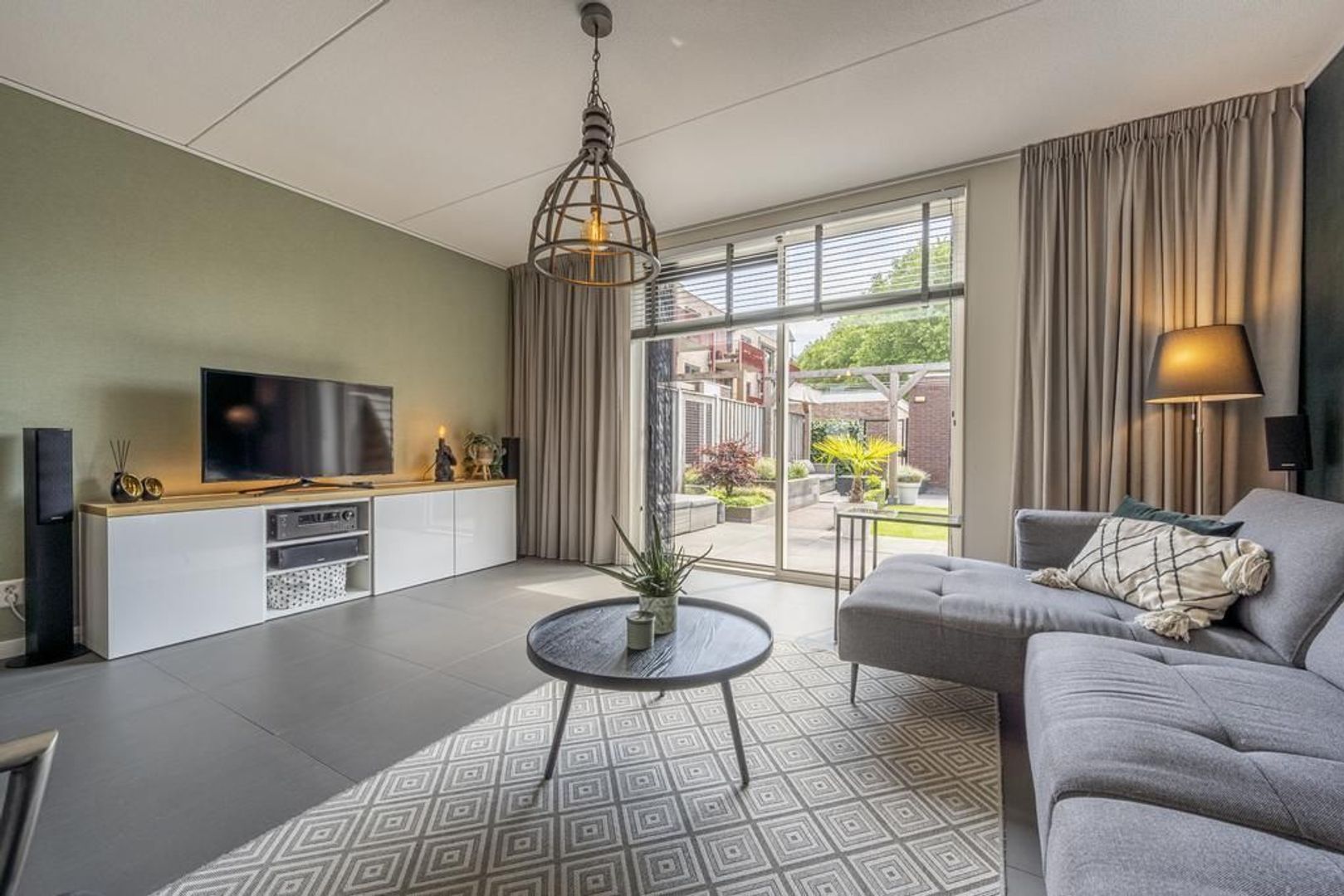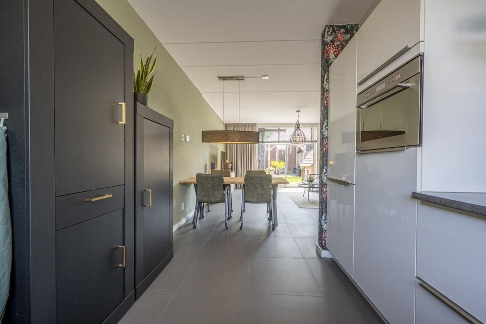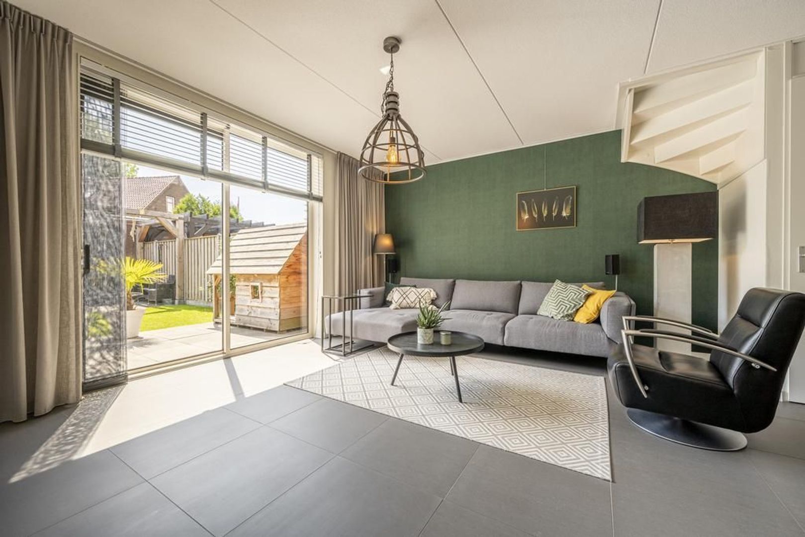 Tuingerichte woonkamer met schuifpui en open keuken aan de straatkant. Deze heeft een L-vormige inrichting en is uitgevoerd met een 5-pits gaskookplaat, een combi-magnetron, koel-vriescombinatie, afzuigkap en vaatwasser.