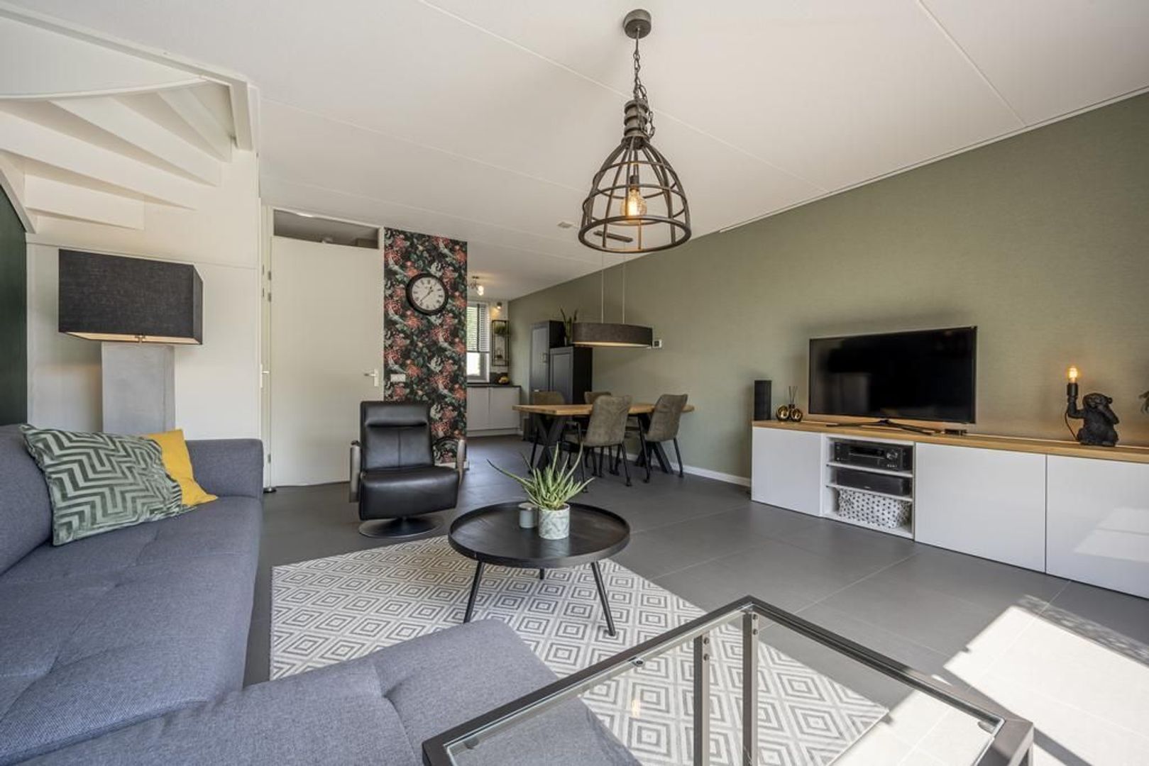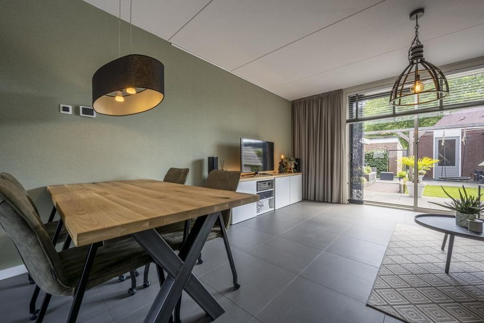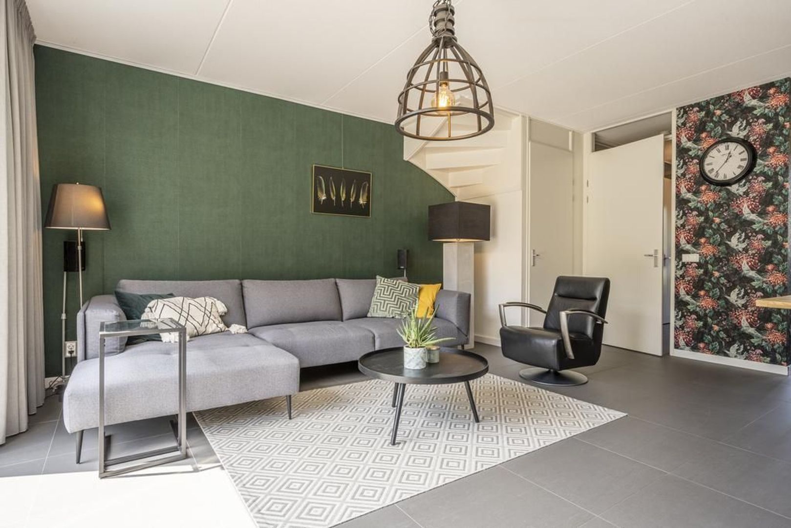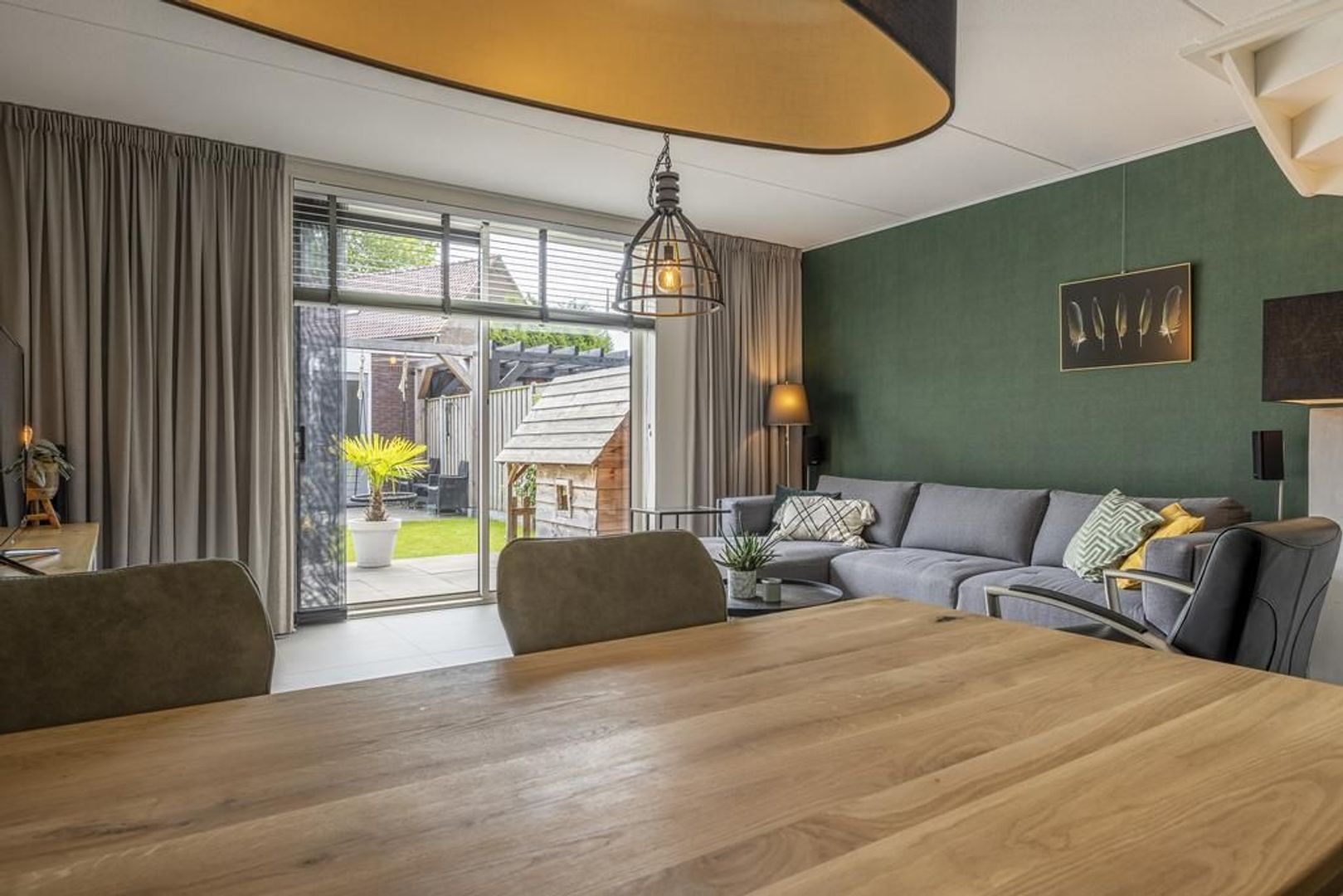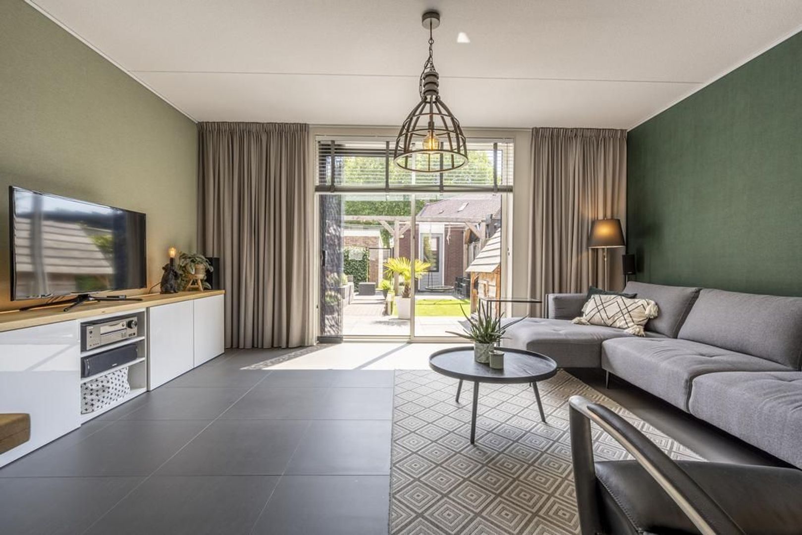Tuingerichte woonkamer met schuifpui en open keuken aan de straatkant. Deze heeft een L-vormige inrichting en is uitgevoerd met een 5-pits gaskookplaat, een combi-magnetron, koel-vriescombinatie, afzuigkap en vaatwasser.