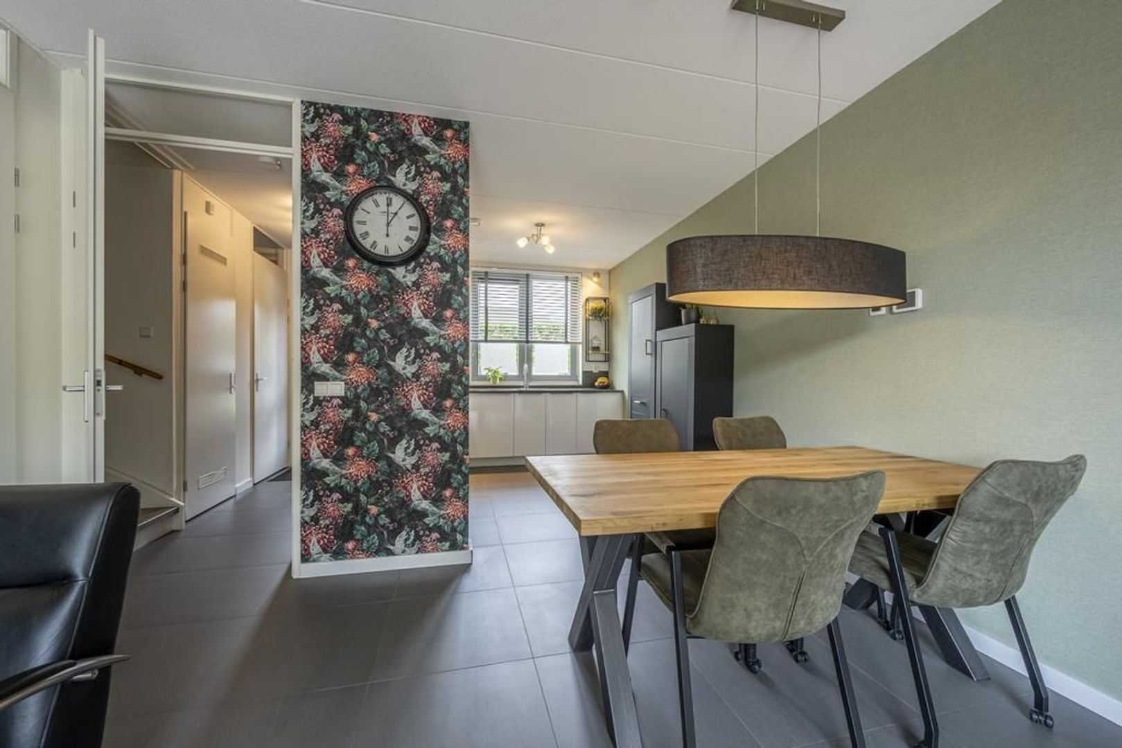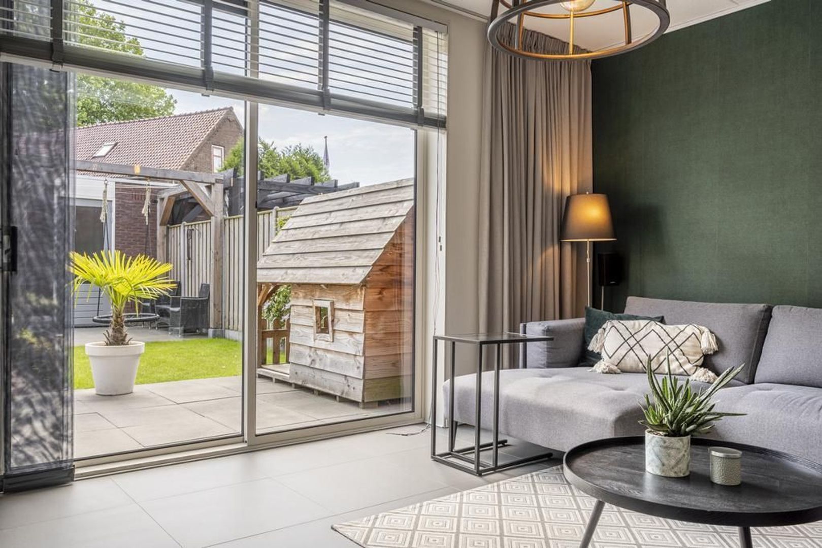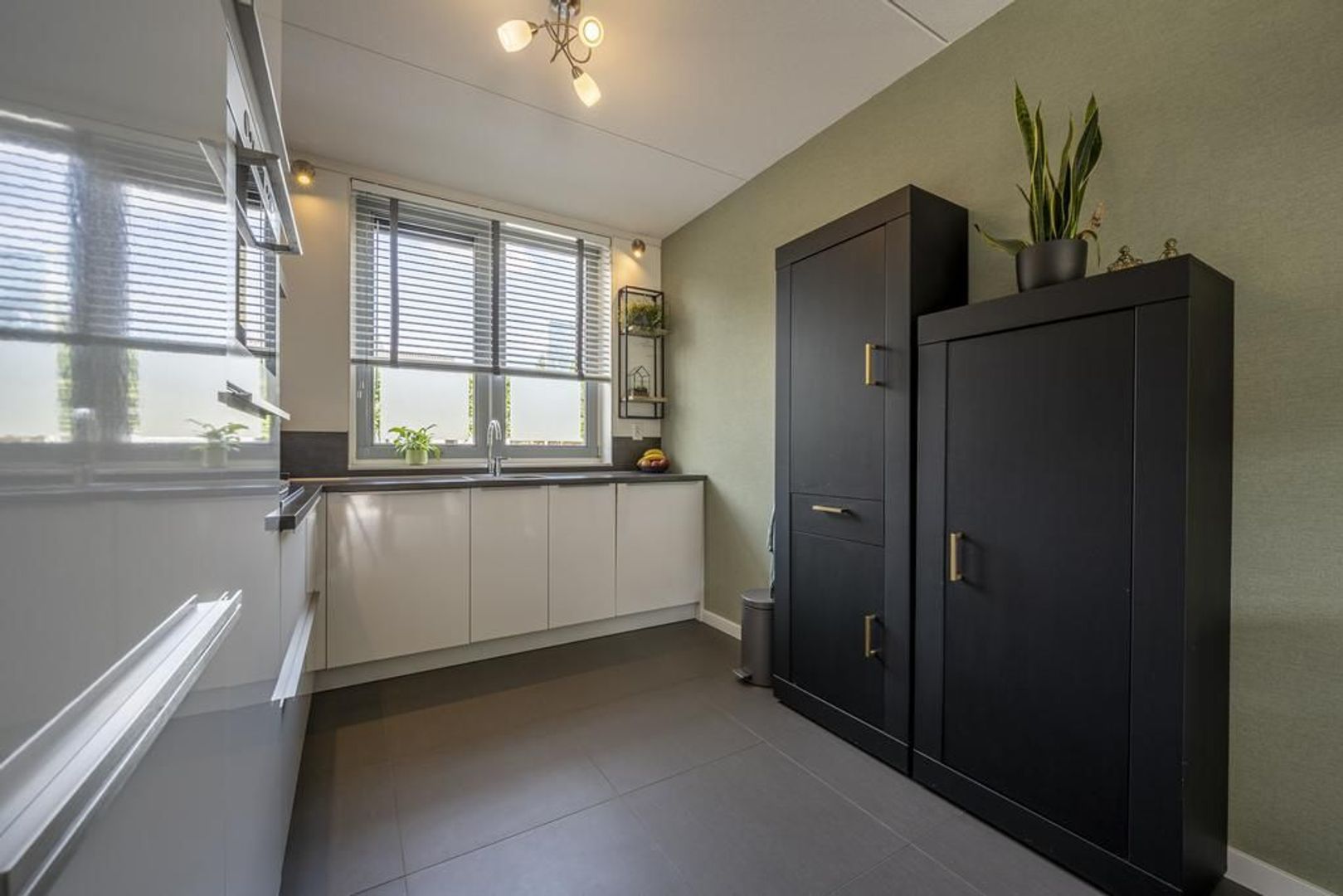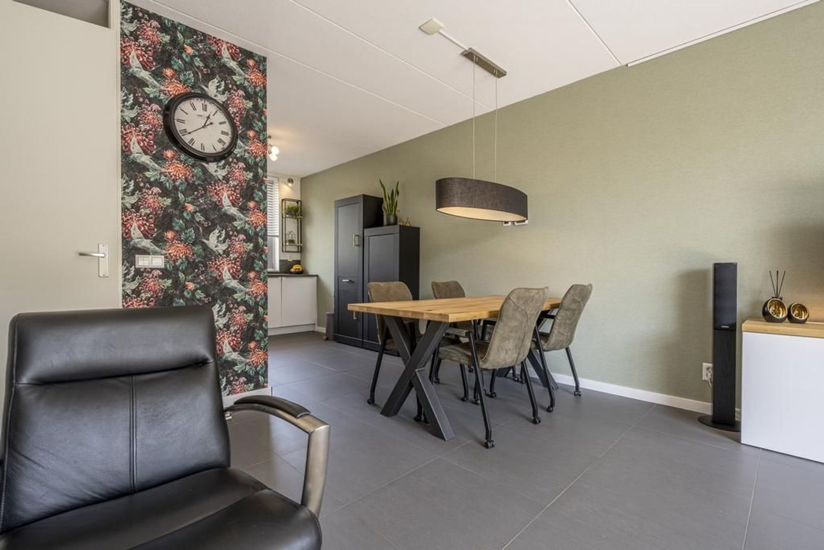 Tuingerichte woonkamer met schuifpui en open keuken aan de straatkant. Deze heeft een L-vormige inrichting en is uitgevoerd met een 5-pits gaskookplaat, een combi-magnetron, koel-vriescombinatie, afzuigkap en vaatwasser.