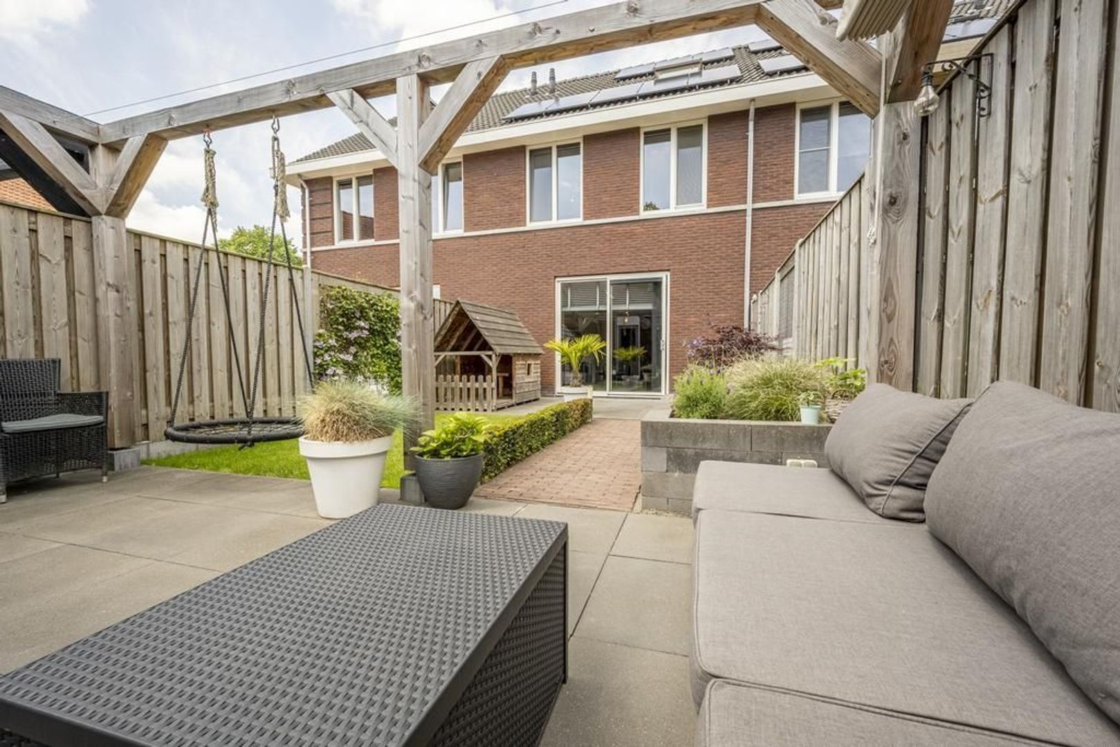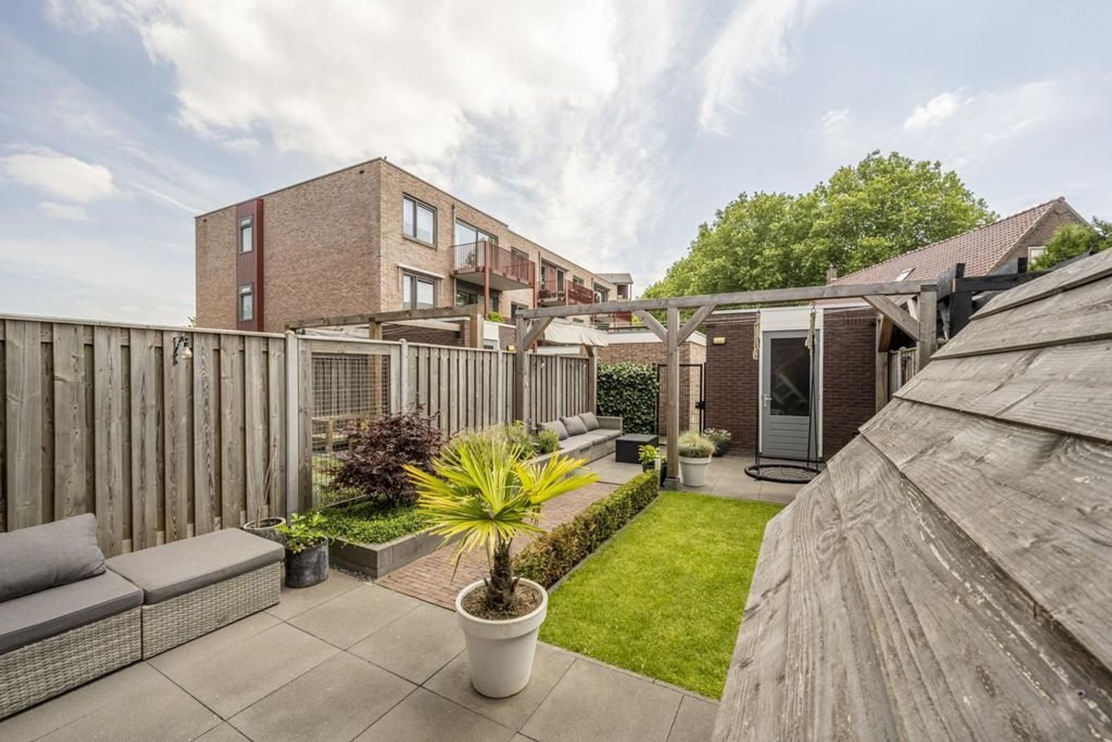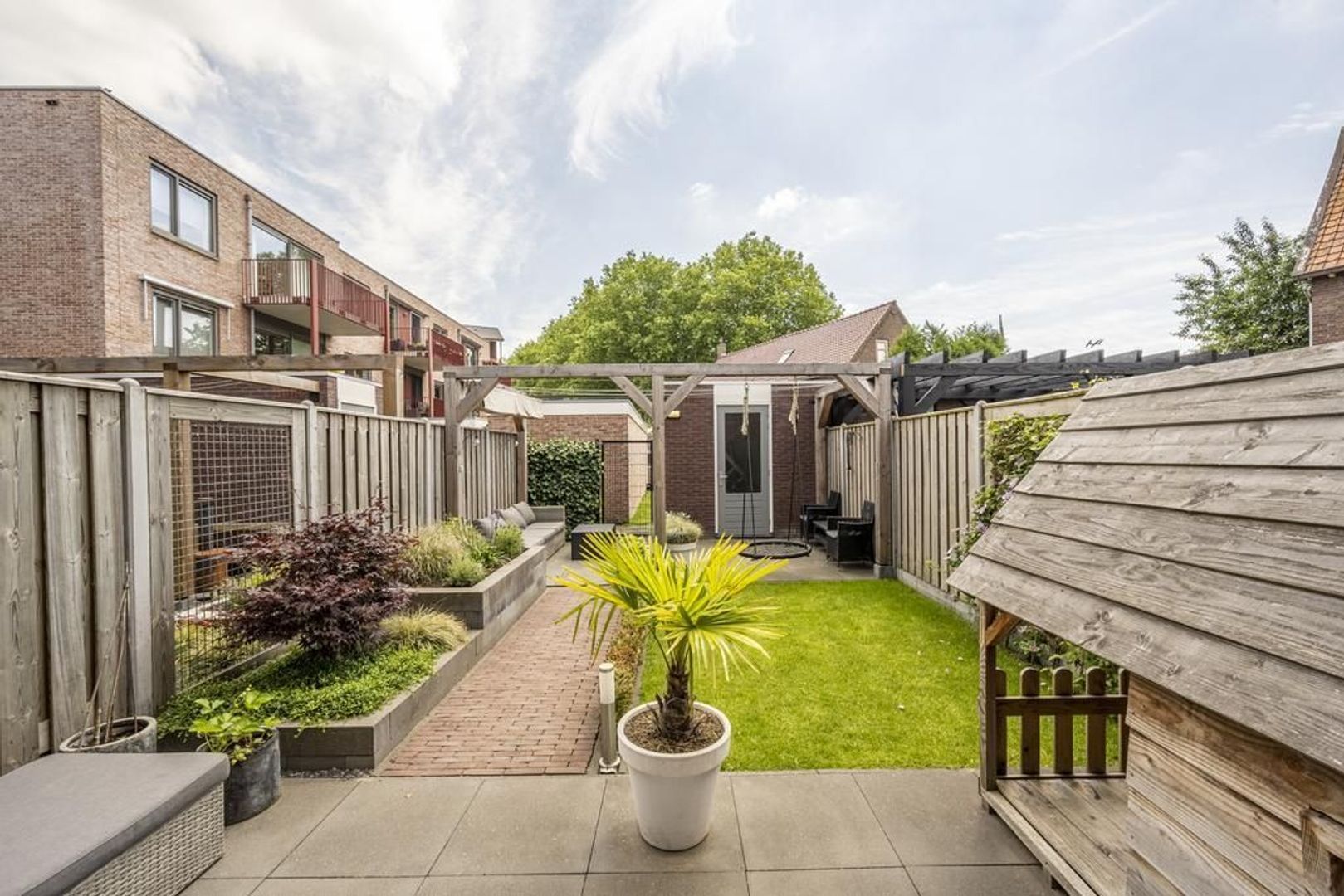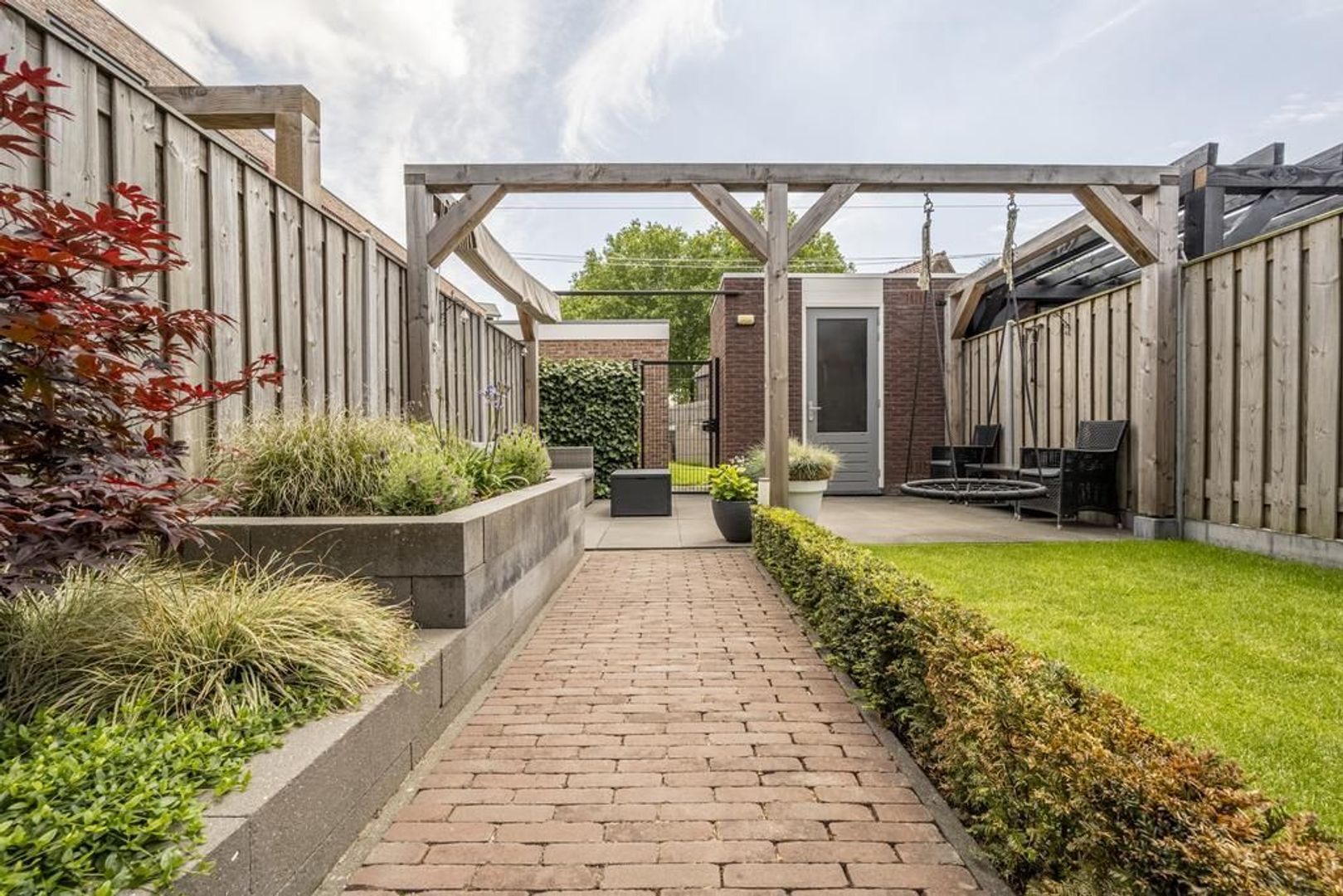 De achtertuin ligt op het zuidoosten en is mooi aangelegd en goed onderhouden. Achterin staat een stenen berging, voorzien van elektra.