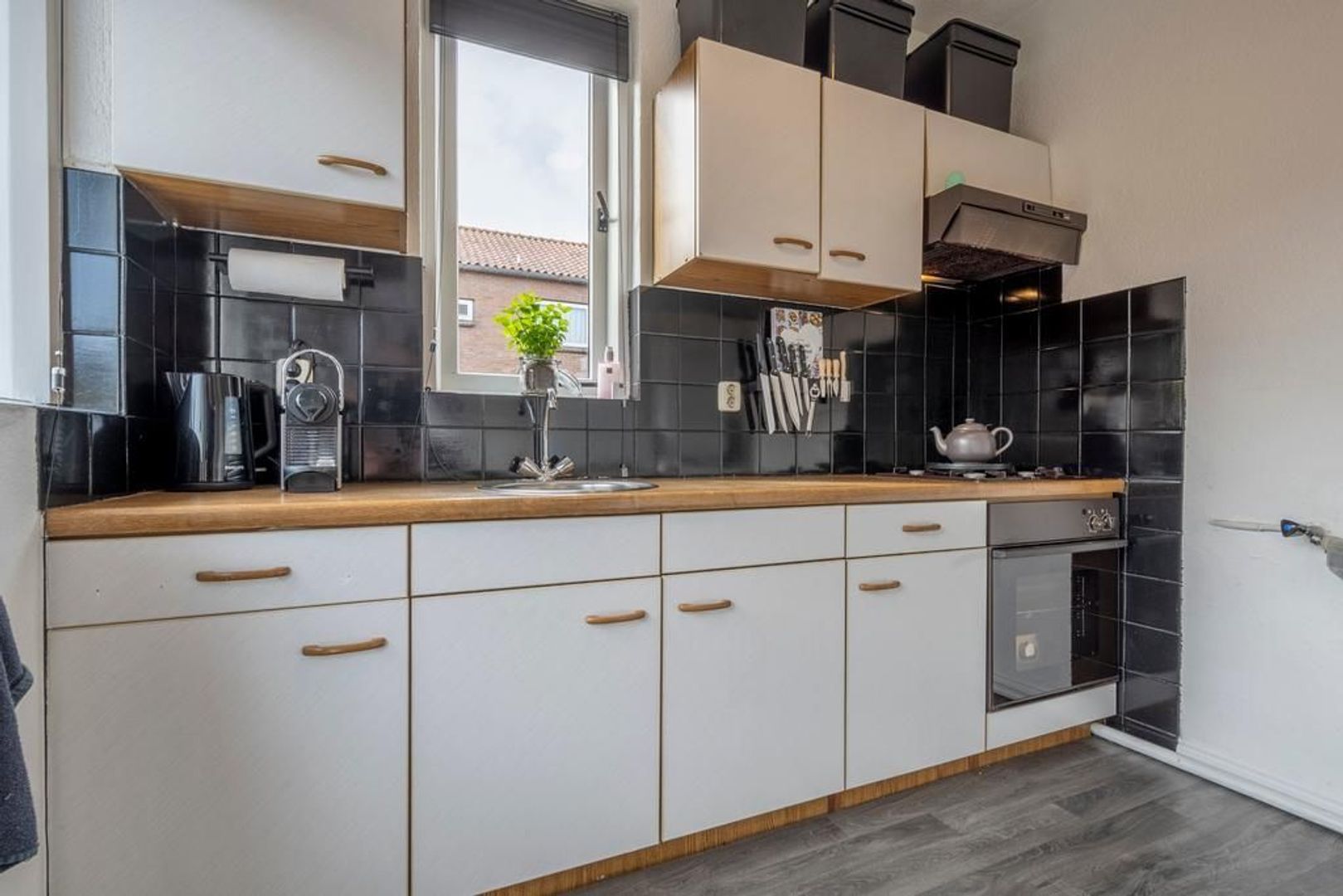 Halfopen keuken met eenvoudige inrichting, voorzien van een gaskookplaat, oven en afzuigkap. Het zijraam zorgt ook hier voor veel licht.