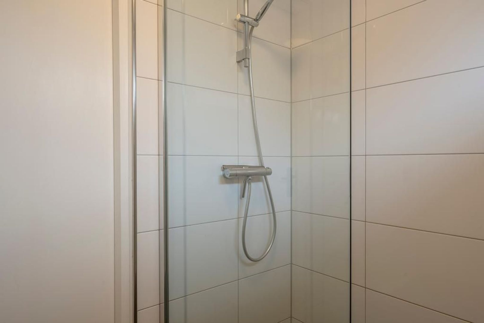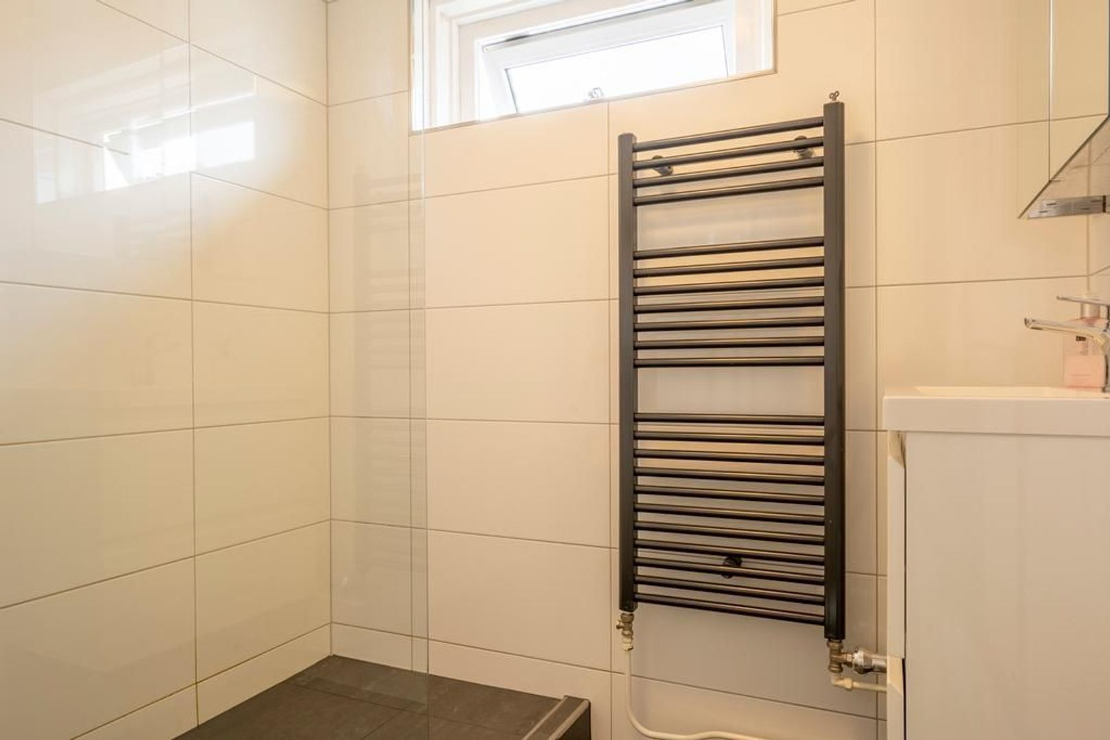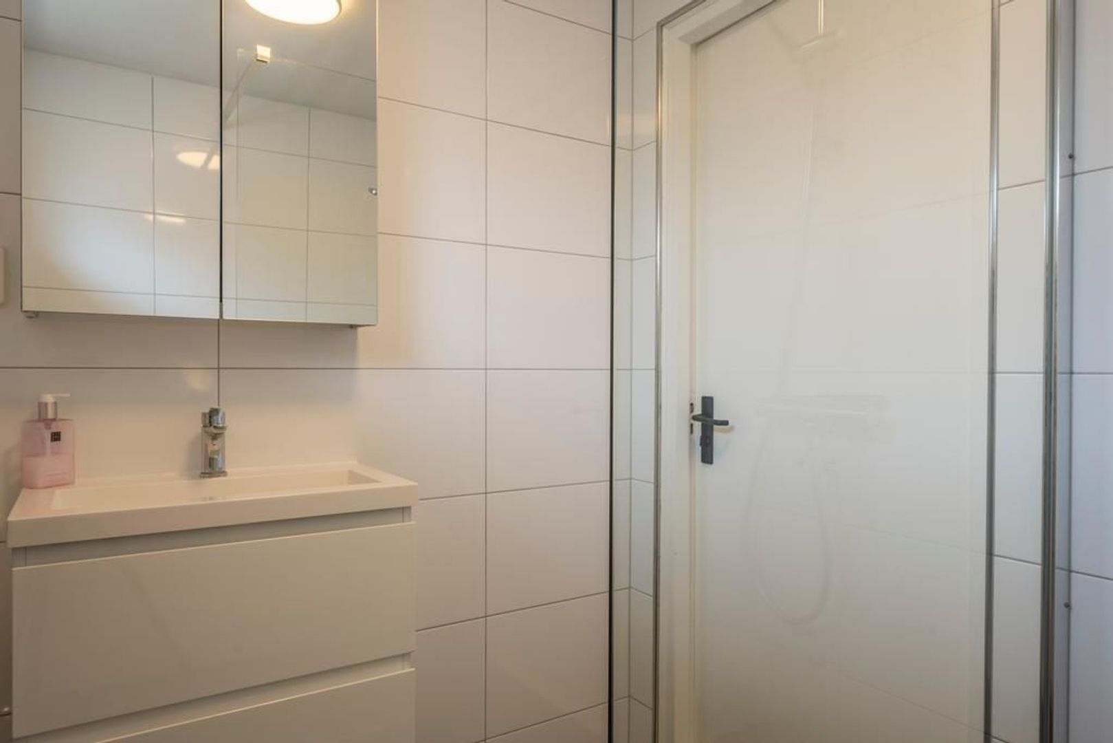 De badkamer is volledig betegeld en ingericht met een wastafelmeubel en inloopdouche.