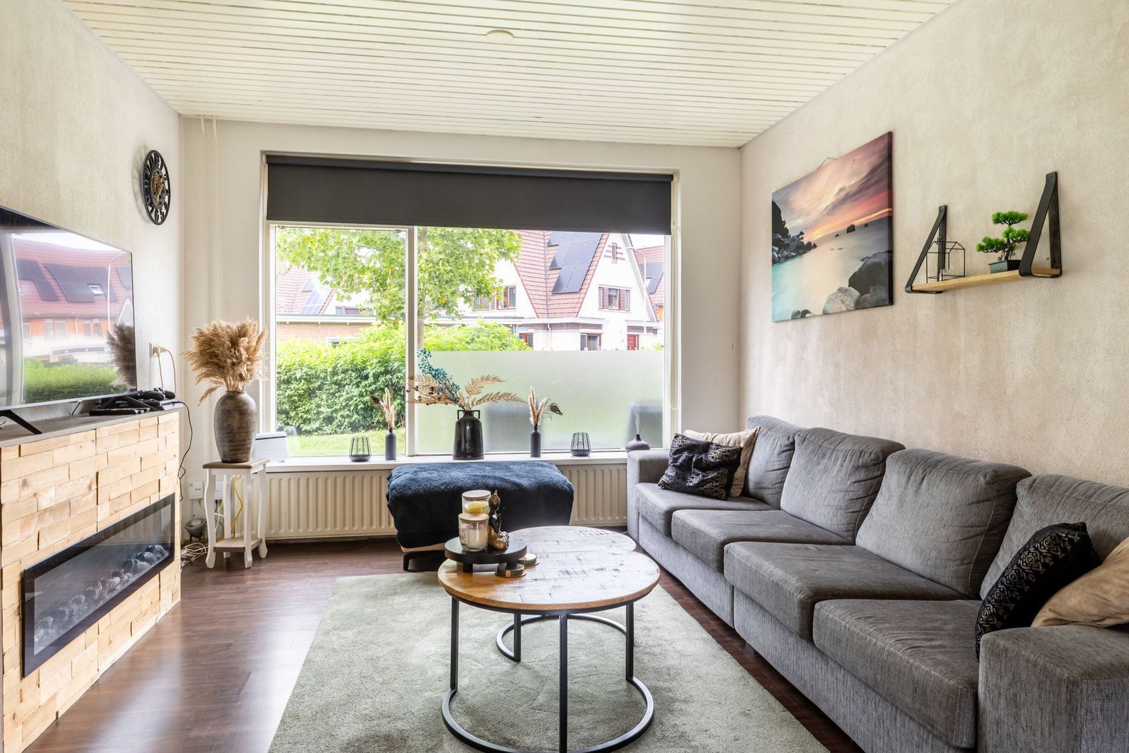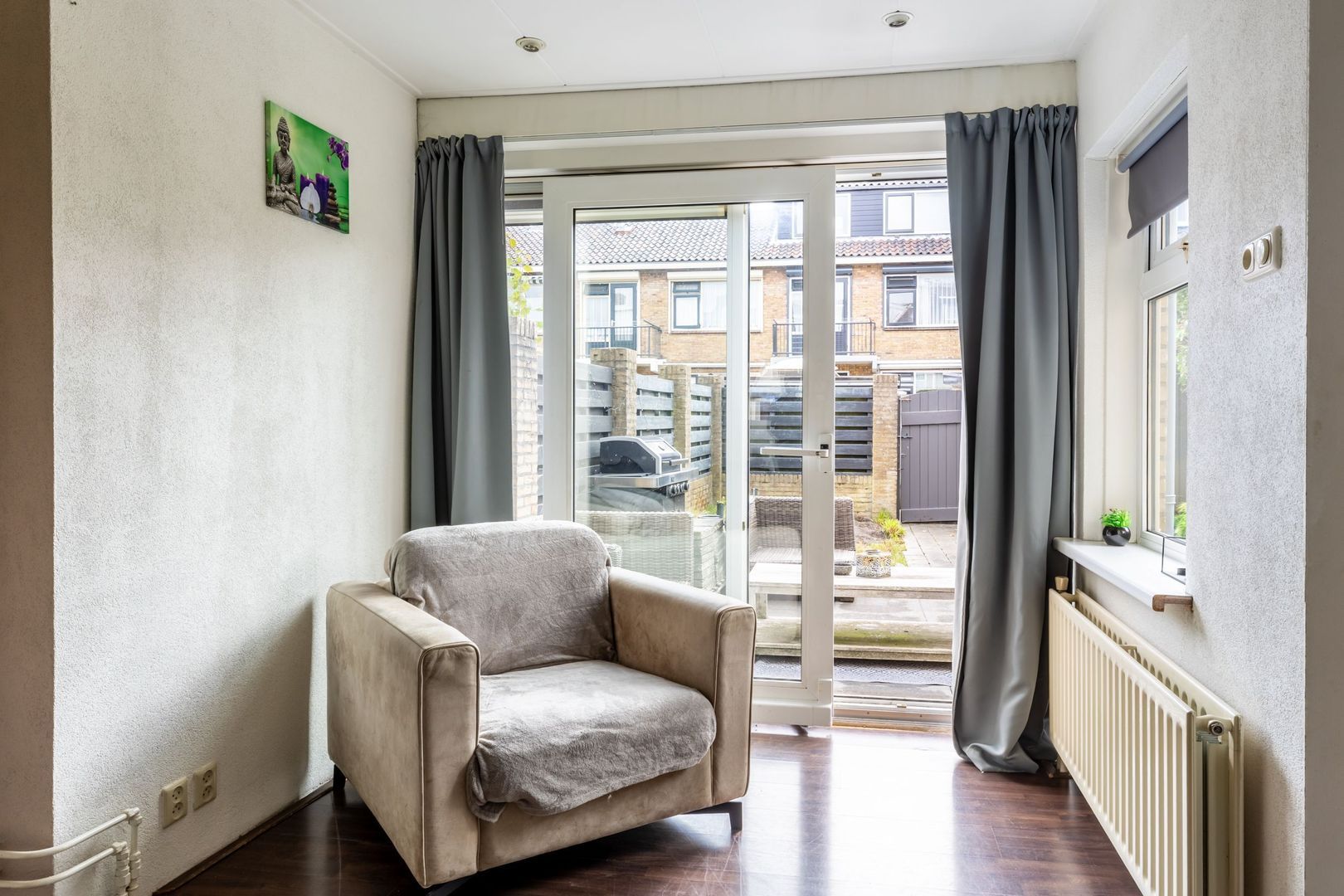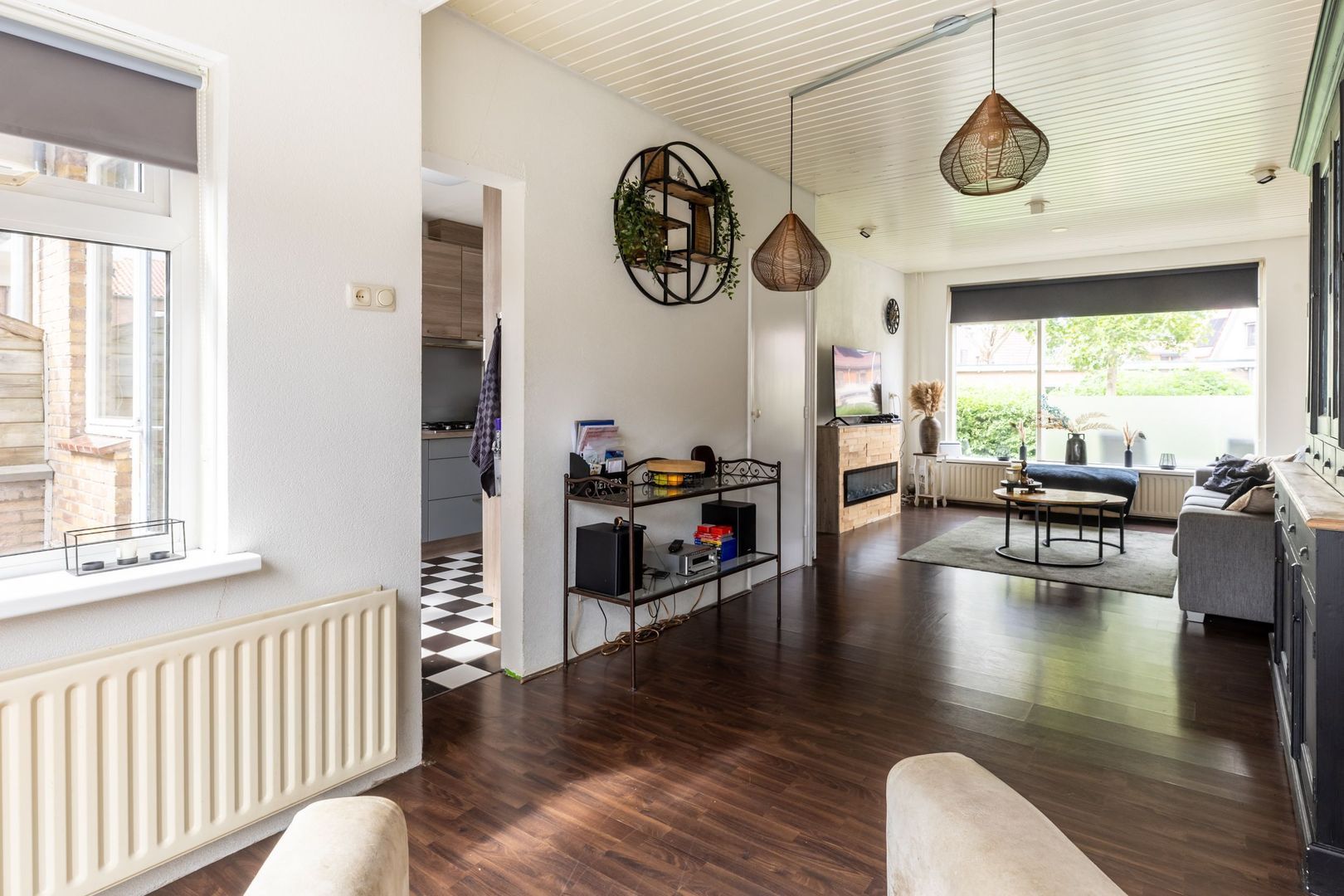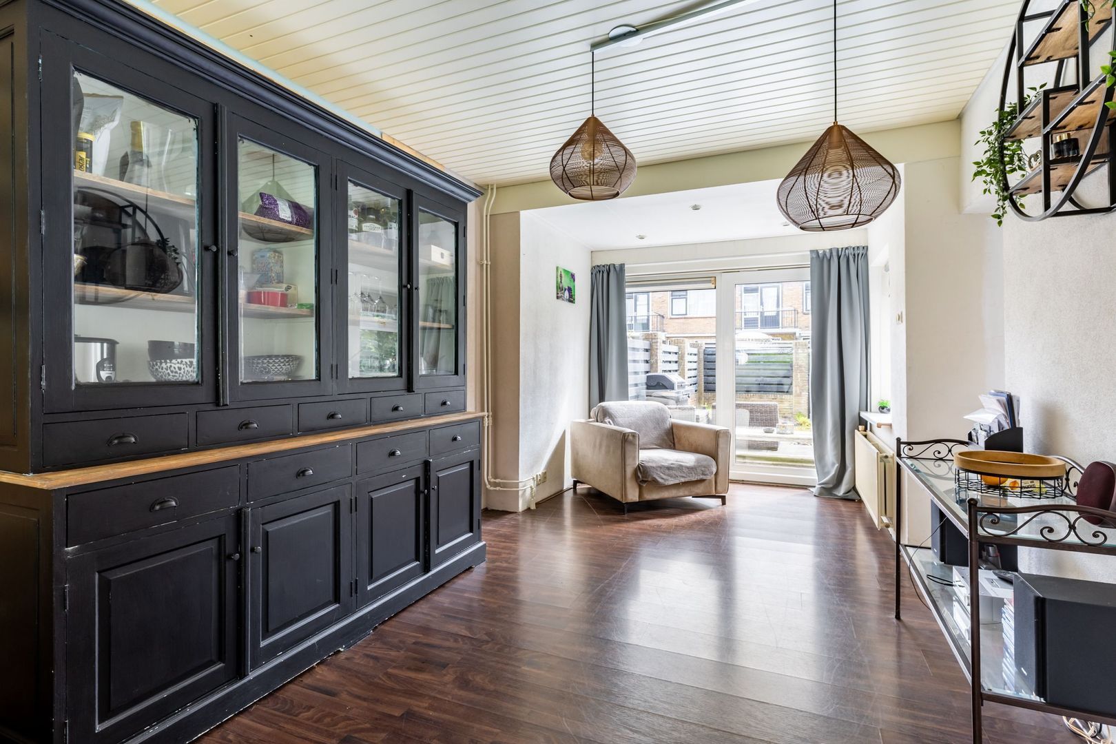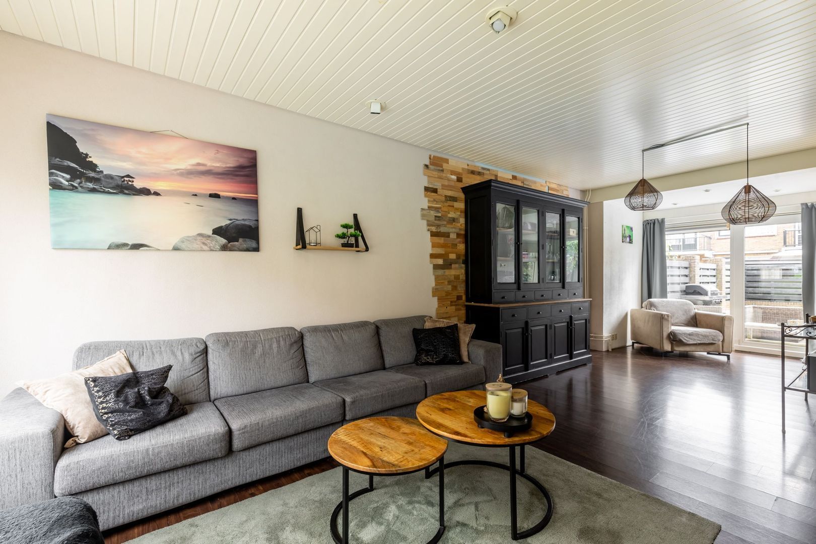 Doorzon woonkamer met aanbouw en schuifpui naar de tuin.