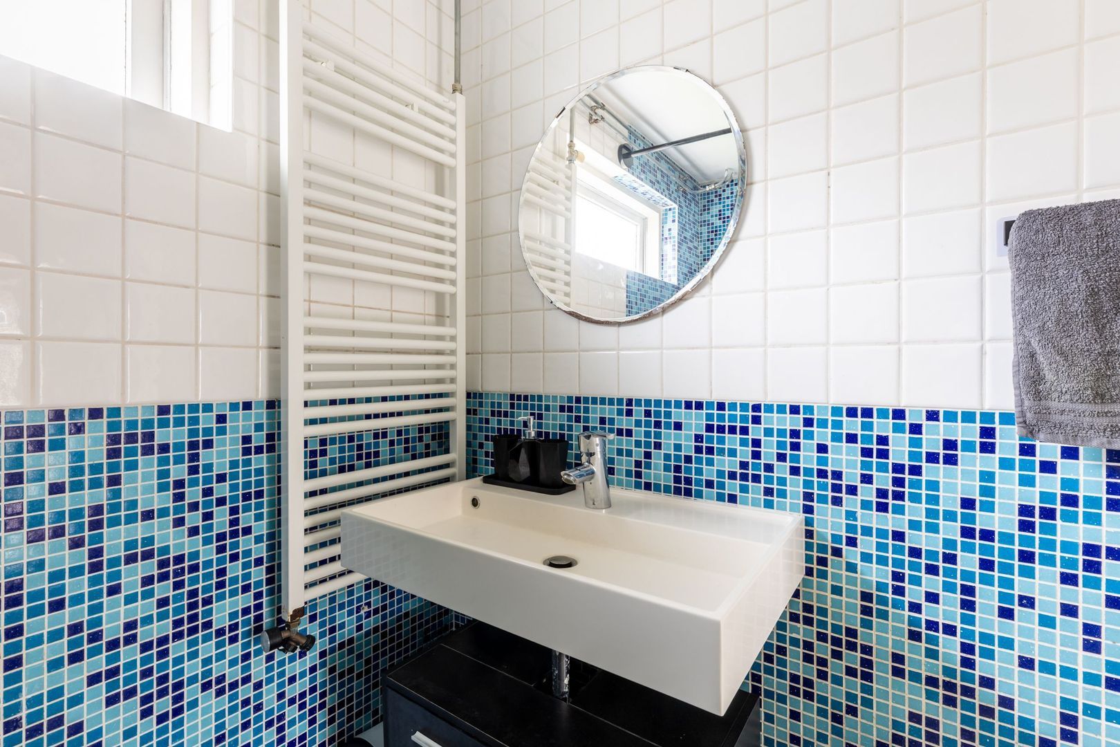 Op de eerste verdieping zijn drie slaapkamers, waarvan twee met vaste kasten. De badkamer is ingericht met een doucheruimte, een wastafel en een designradiator. Het raam kan open, waardoor er met frisse buitenlucht geventileerd kan worden.