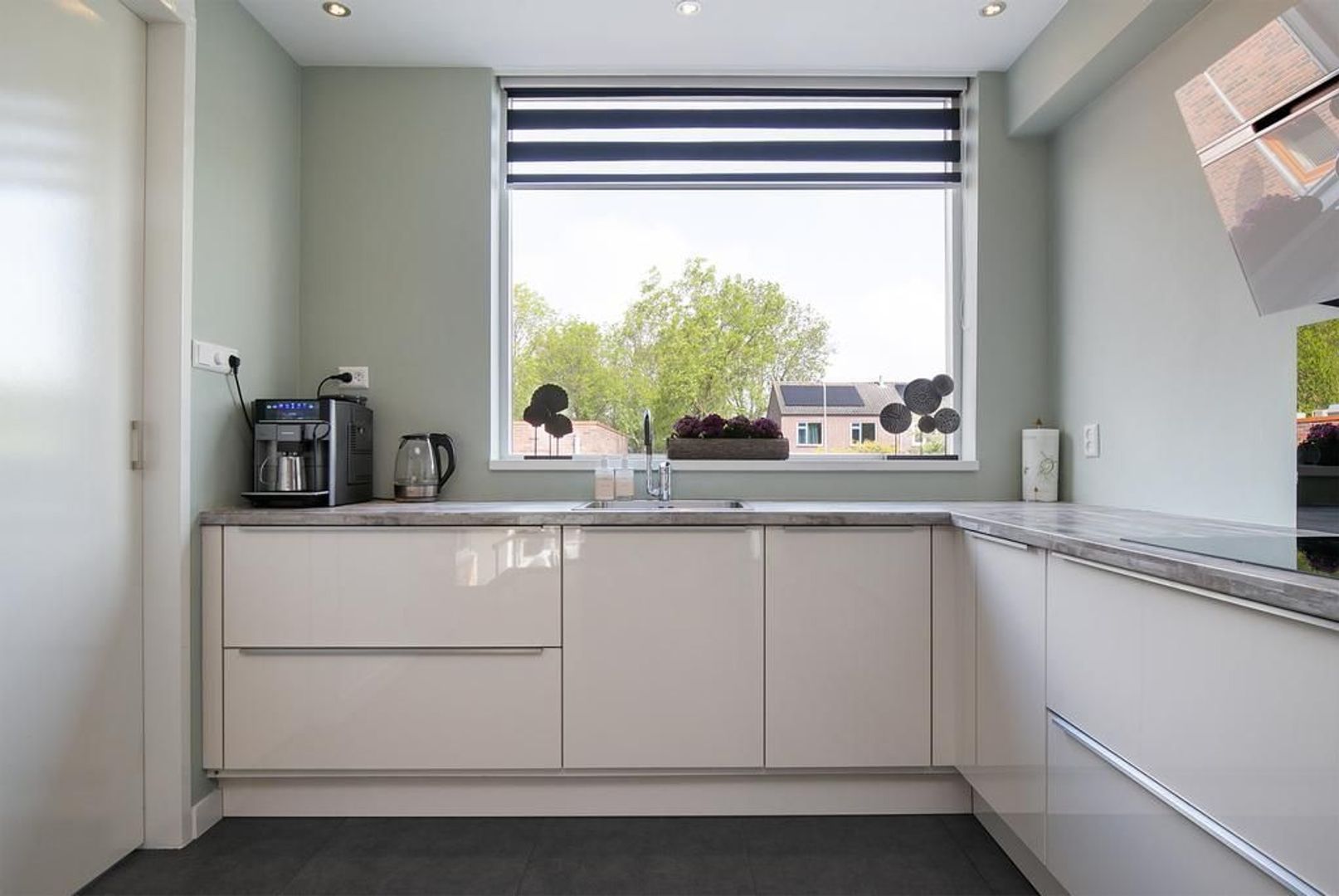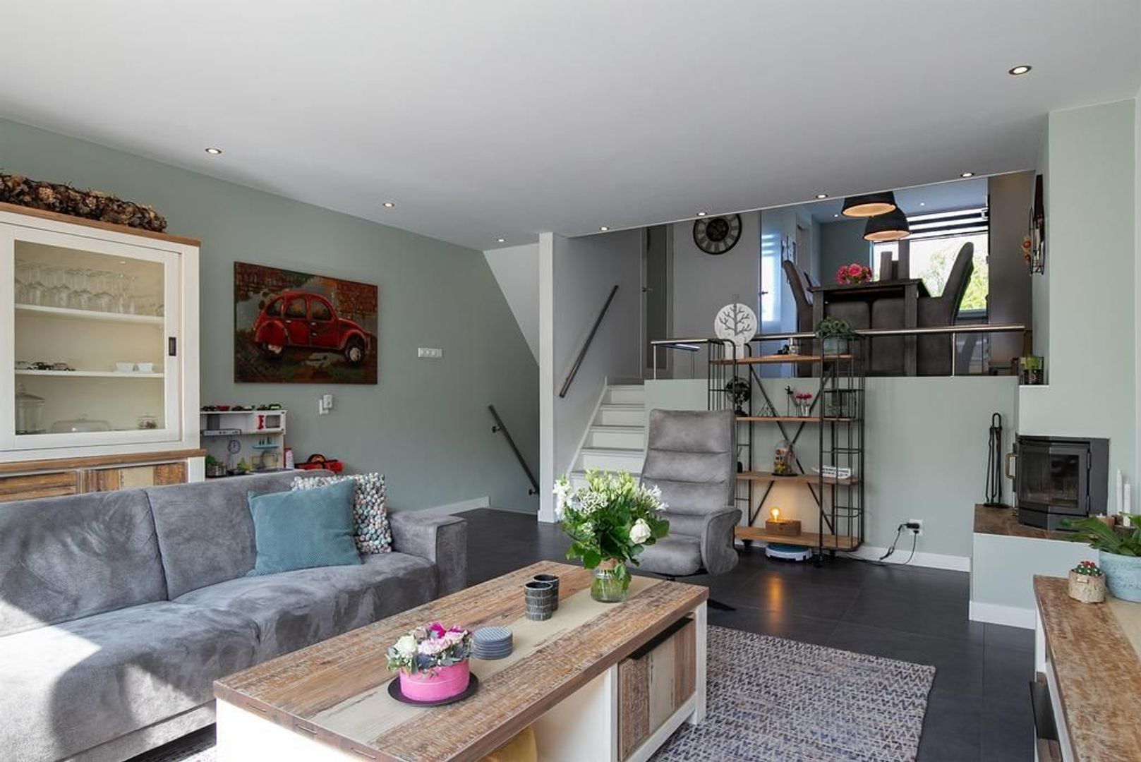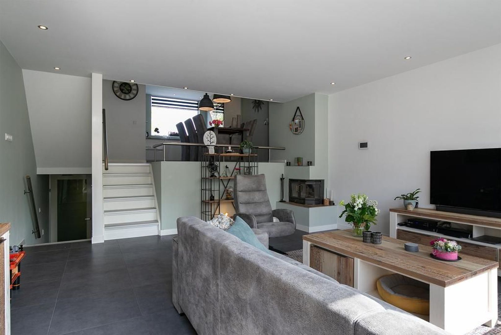 Mooie vierkante woonkamer met gezellige schouw met houtkachel en deur naar de tuin. De leefkeuken ligt een aantal treden hoger en staat in open verbinding met de woonkamer. De eigentijdse wandopstelling is voorzien van een koelkast, combi-oven, inductiekookplaat en een afzuigkap. Ook is er een vaste kast in de keuken.