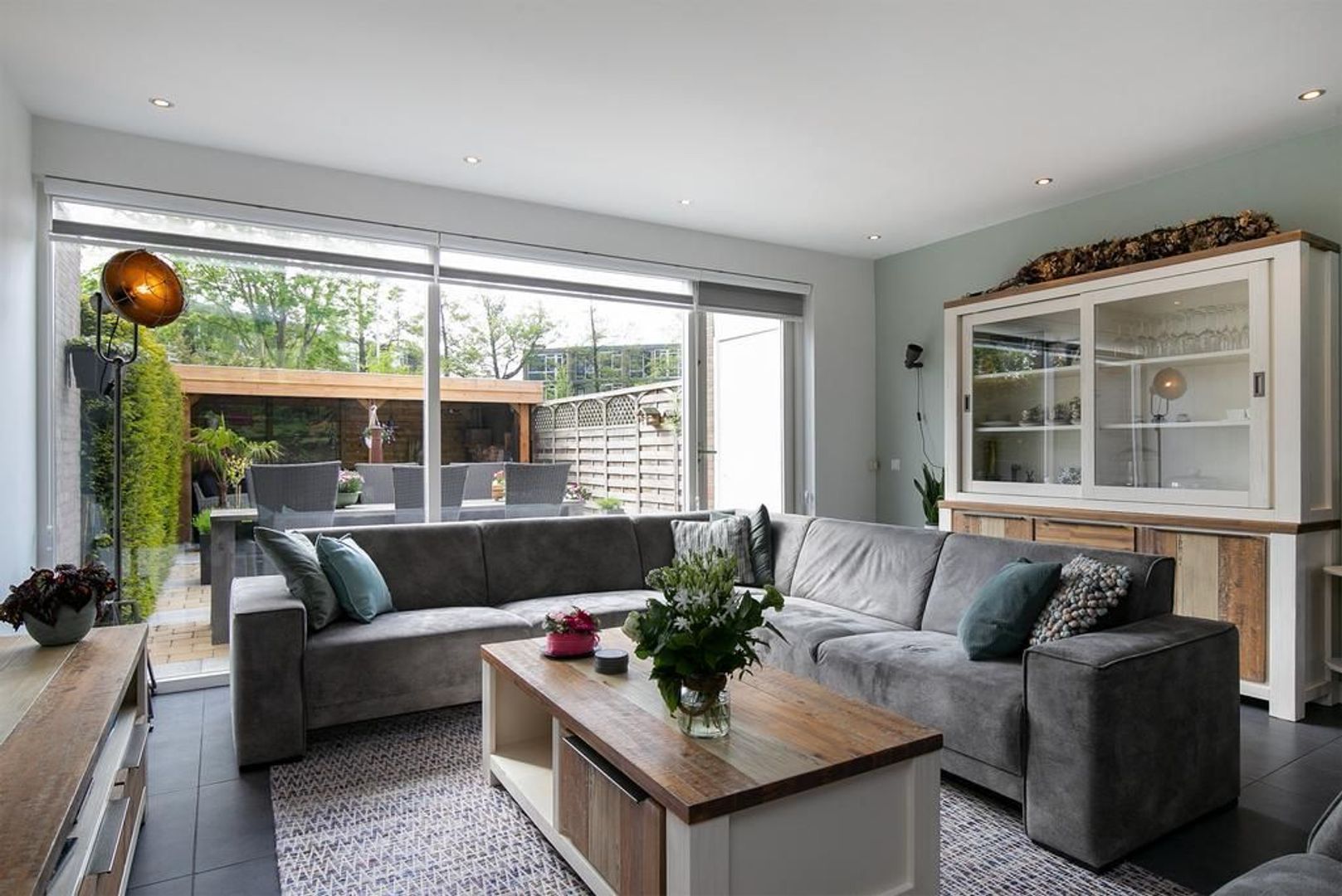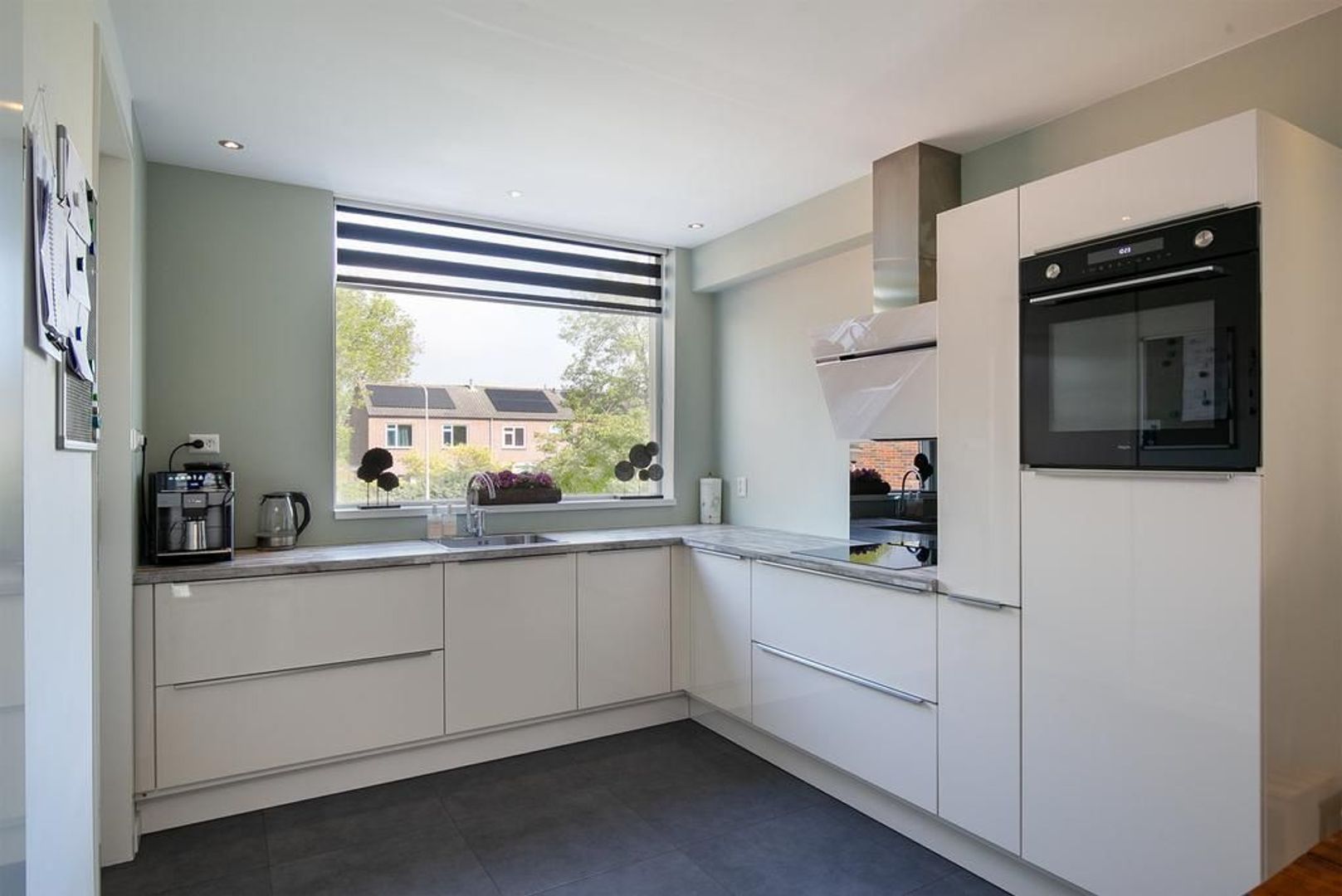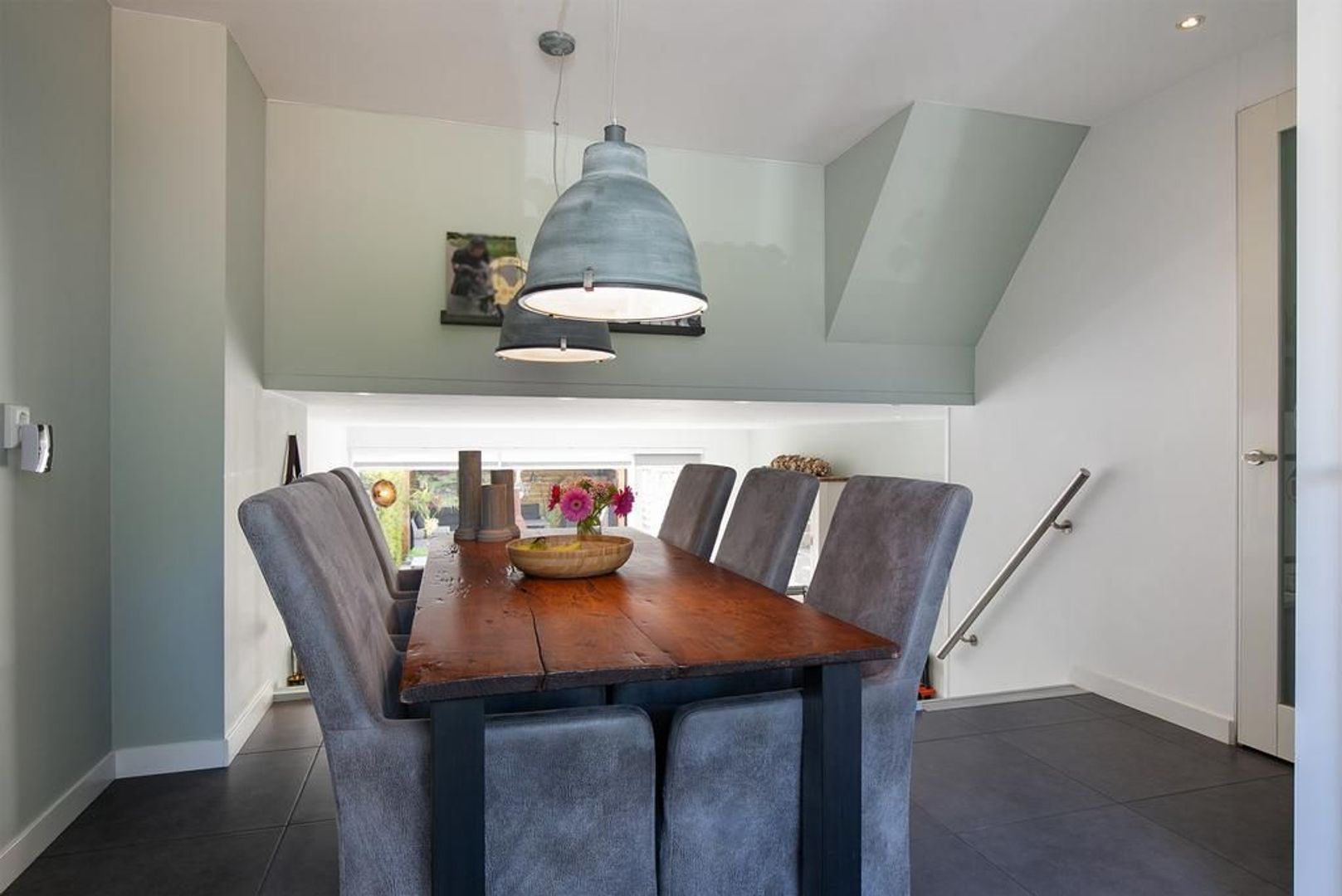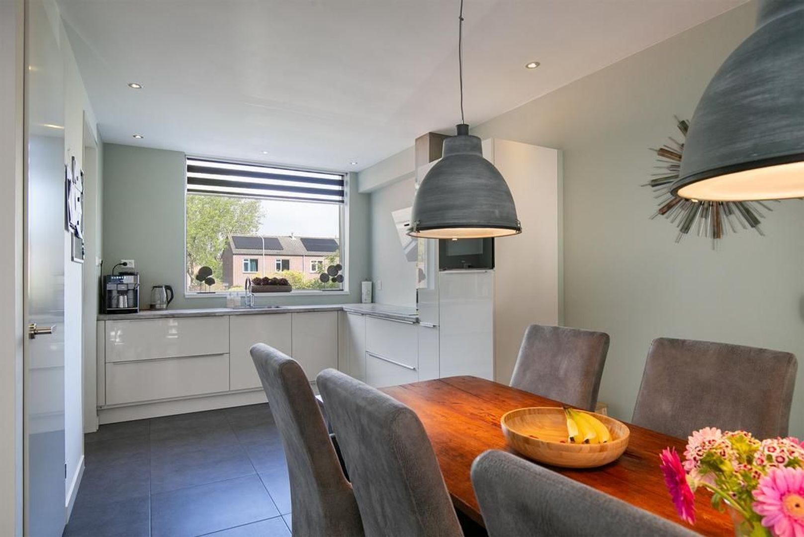 Mooie vierkante woonkamer met gezellige schouw met houtkachel en deur naar de tuin. De leefkeuken ligt een aantal treden hoger en staat in open verbinding met de woonkamer. De eigentijdse wandopstelling is voorzien van een koelkast, combi-oven, inductiekookplaat en een afzuigkap. Ook is er een vaste kast in de keuken.