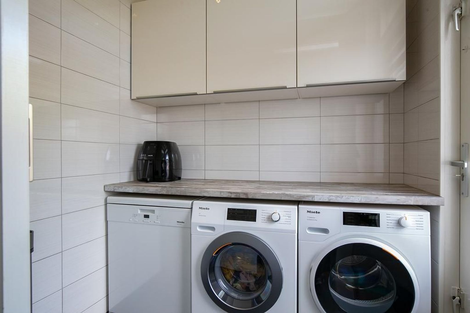 Een praktische bijkeuken -met de aansluitingen voor de wasapparatuur en vaatwasser- geeft toegang tot een klein balkon.