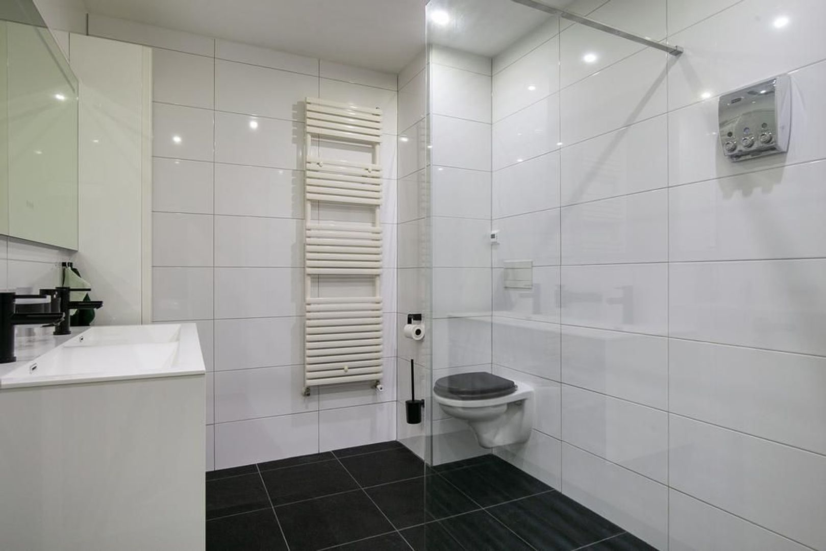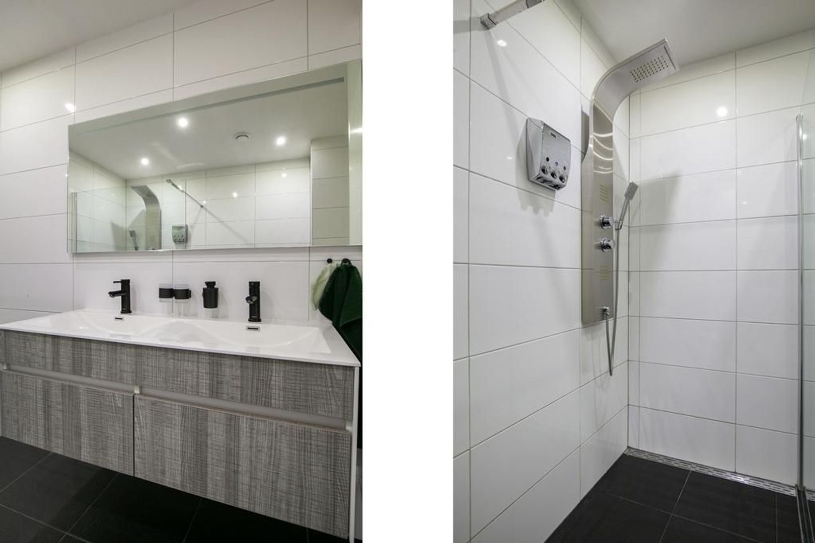 Dan zijn op het volgende niveau een grote slaapkamer en een moderne badkamer. Deze is voorzien van elektrische vloerverwarming en ingericht met een inloopdouche met regen- en massagedouche, een dubbel wastafelmeubel, een tweede toilet en een verwarmde spiegel.
